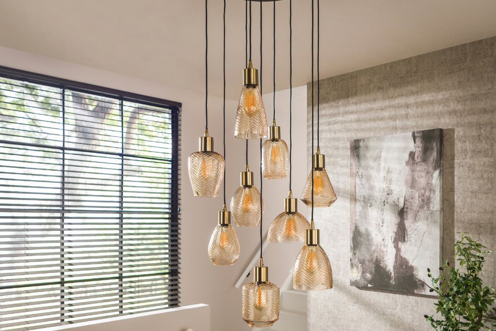 The Lexi 9 String Pendant Light, featuring amber glass and metal is a distinctive decorative element that enhances your home's aesthetic. Its substantial size brings visual interest to any room while maintaining a sense of balance and harmony. The amber glass shades are mounted on a sturdy metal plate, and the 9 lights deliver excellent illumination, making it perfect for larger areas. Each lamp's height can be adjusted individually for a customised appearance, and the warm brown tones coordinate beautifully with various interiors.