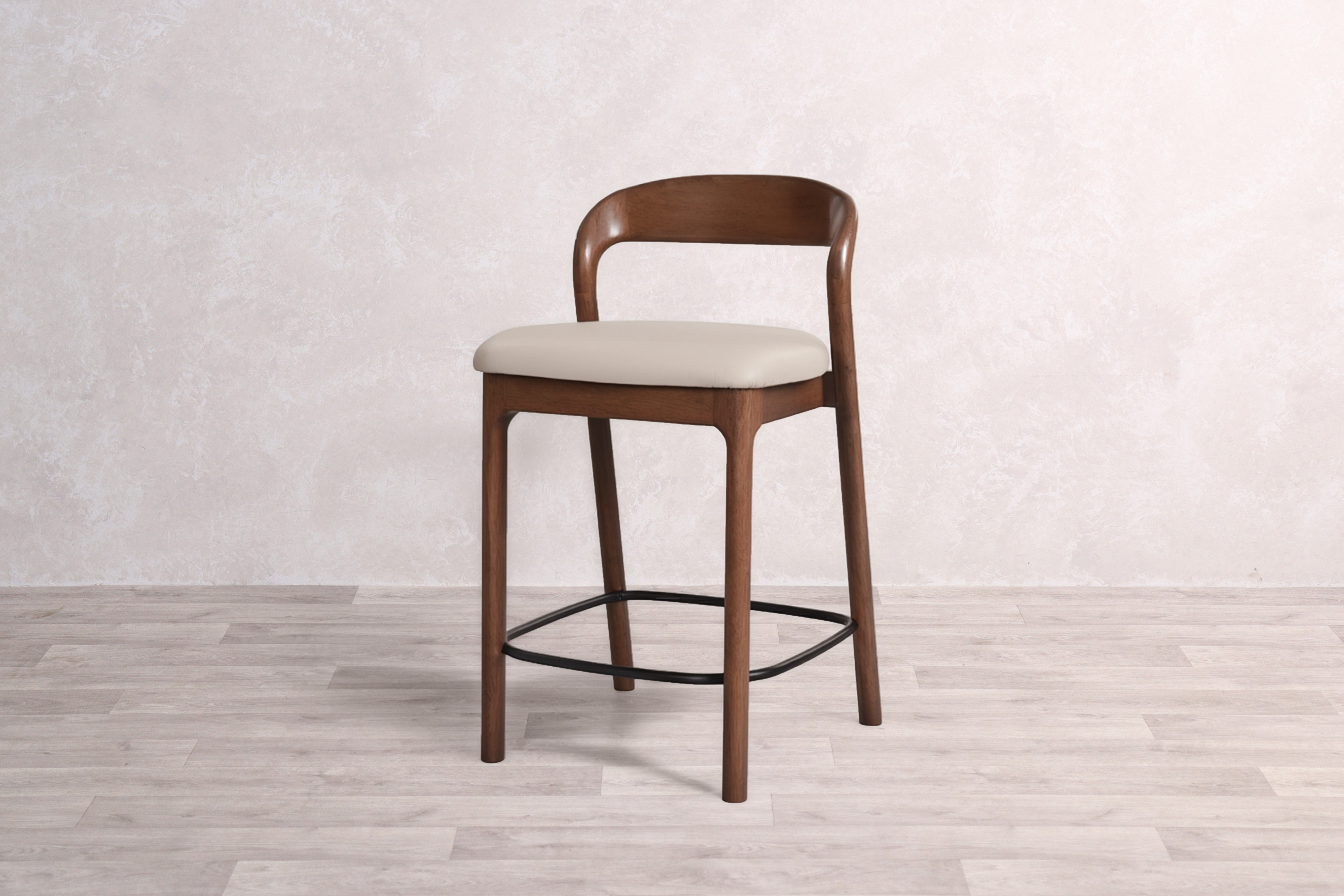 The Margot Counter Stool features a simple yet captivating design for modern dining spaces. Rounded, sturdy timber frames soften the space and create a visually soft silhouette that works beautifully at kitchen islands or breakfast bars. The curved backrest flows seamlessly into the frame, forming a continuous line that enhances the stool's sculptural quality. The warm walnut rubberwood tone contrasts beautifully with the full leather upholstered seat, providing both comfort and style. A black metal footrest offers practical support and creates a striking detail against the warm timber, making this counter stool a perfect blend of form and function for elevated dining and entertaining.