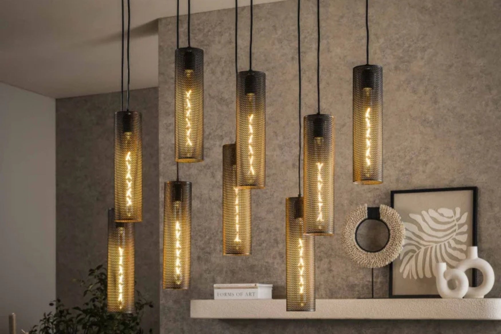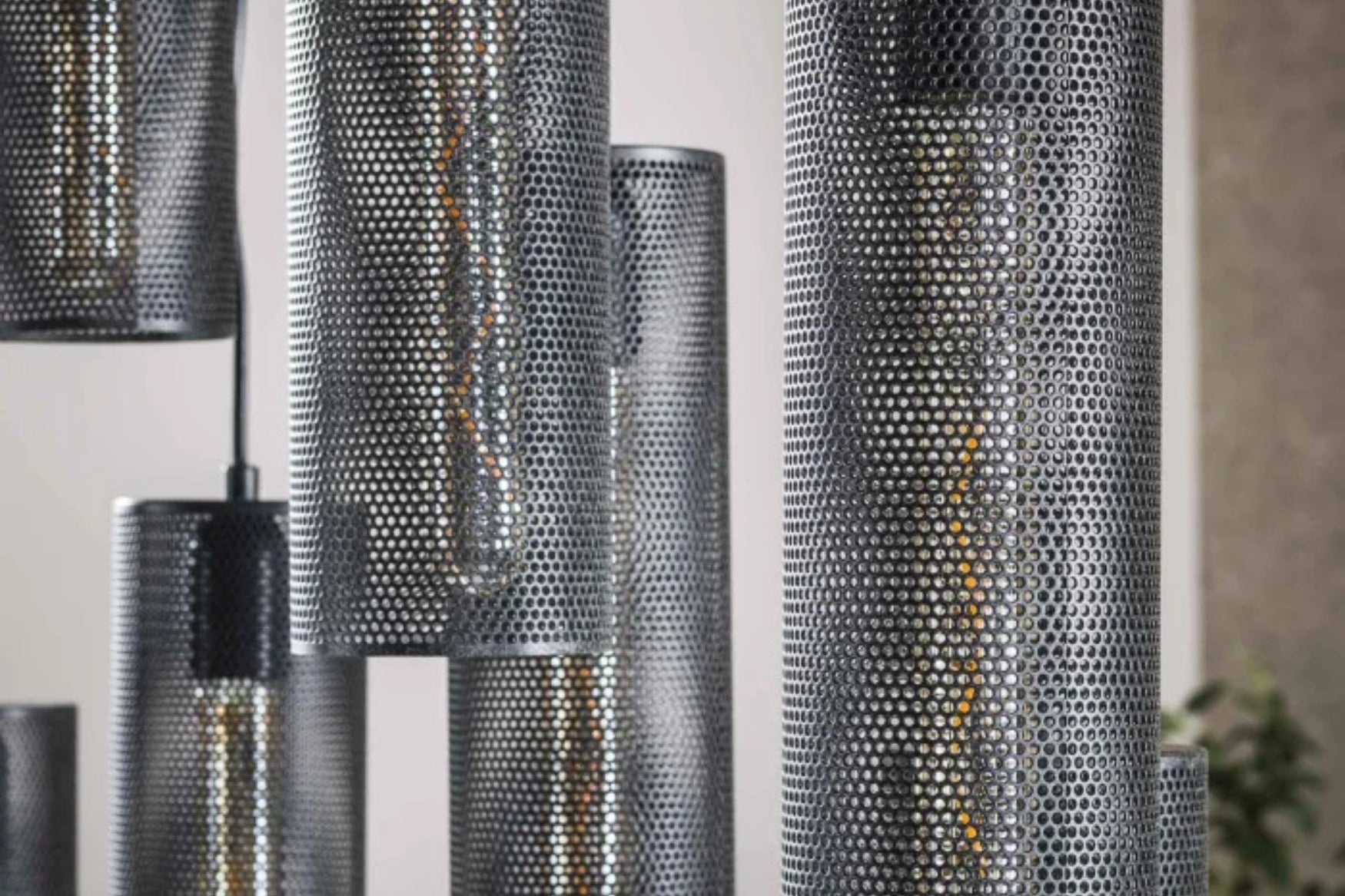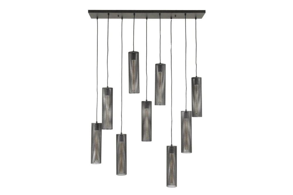 The Noor 9 String Pendant Light adds unique style to any space with its striking tube mesh design. Crafted from metal with an arctic black finish, this hanging lamp features a unique mesh construction that creates beautiful, diffused light and intricate shadows. With nine individual shades adjustable up to 150 cm in height, it offers complete customisation for your ceiling height and design preferences, making it ideal for dining areas, open-plan living spaces, or dramatic installations.