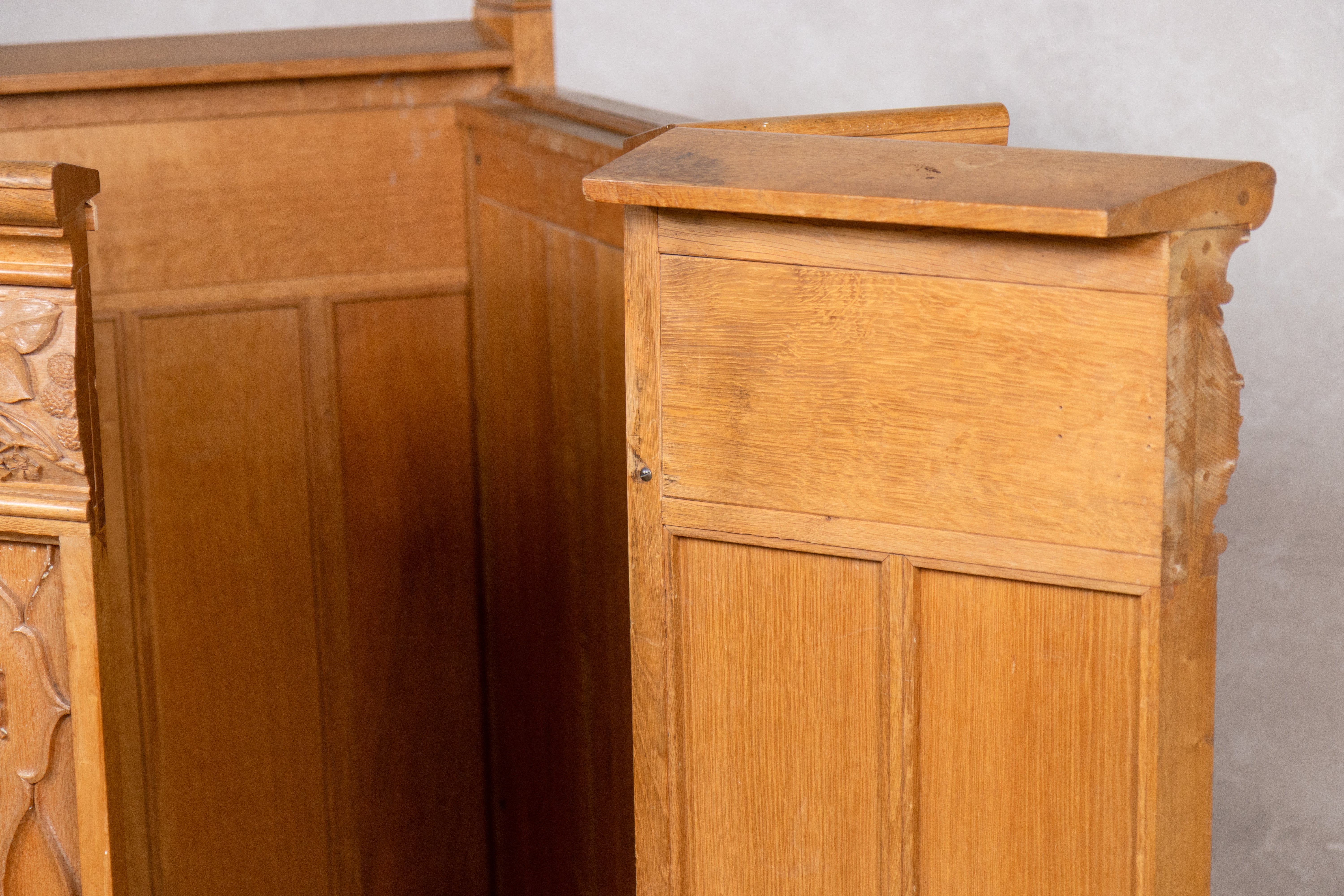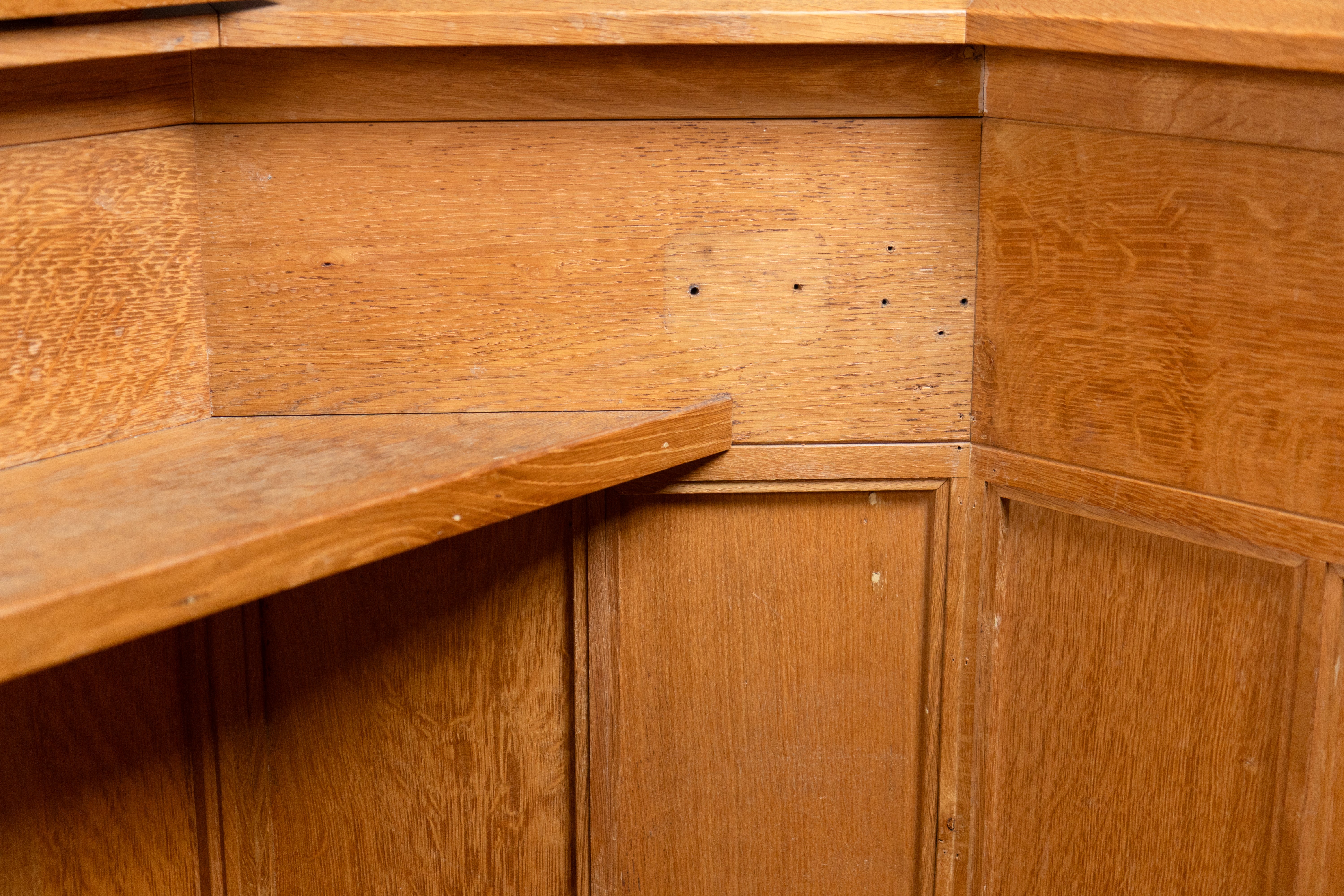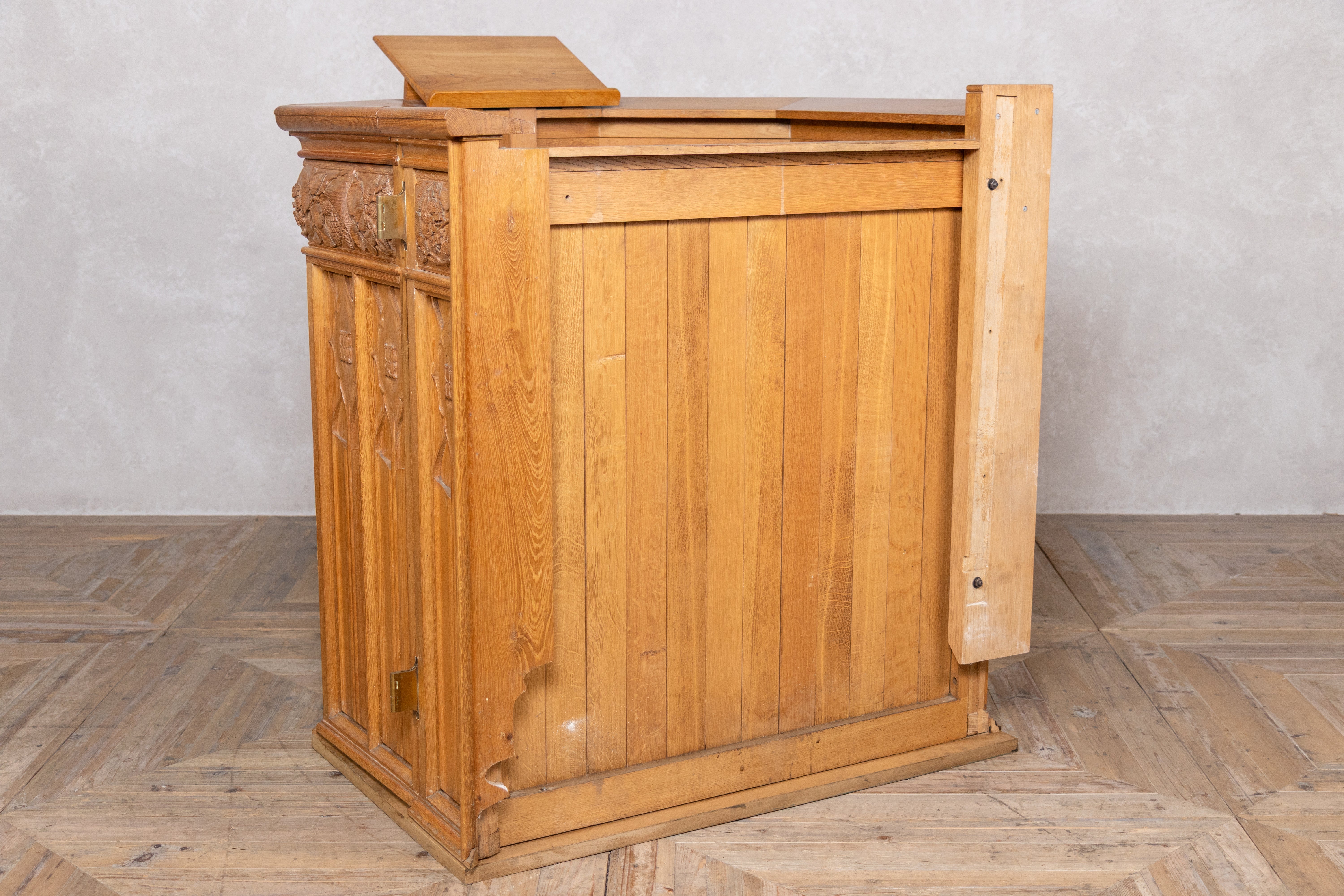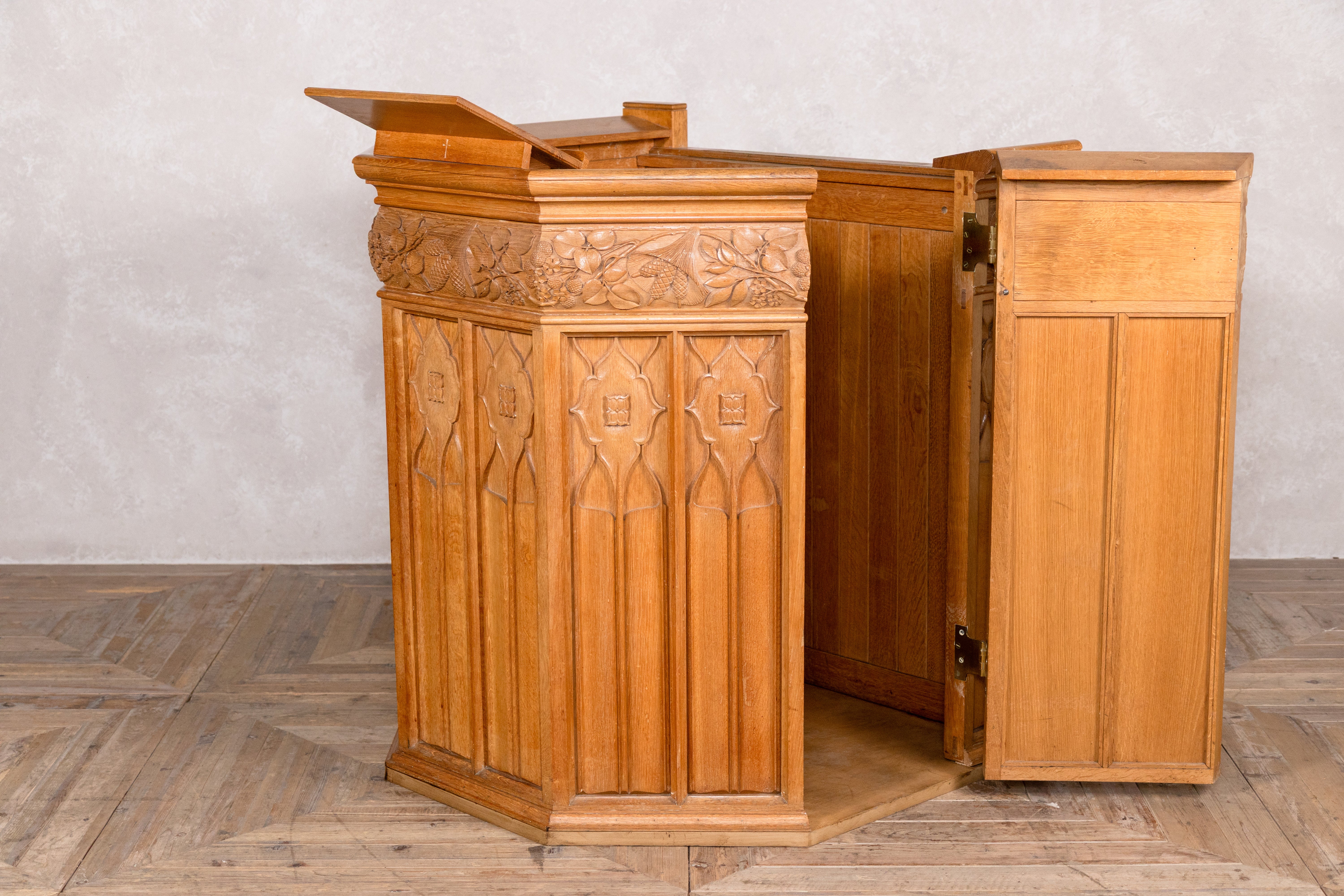 This outstanding solid English oak church pulpit showcases exquisite British craftsmanship with detailed carvings that reflect traditional design. The substantial piece features a single side door that opens to reveal interior space, making it as functional as it is visually striking. Originally used for delivering sermons and readings in a place of worship, this pulpit offers incredible versatility for modern uses including a unique speaker's box, DJ booth, display stand, or statement furniture piece in homes and venues. Whether you're looking to preserve a piece of religious heritage, create an unconventional focal point in a creative space, or simply appreciate fine woodwork and historical furniture, this church pulpit brings character that cannot be replicated.