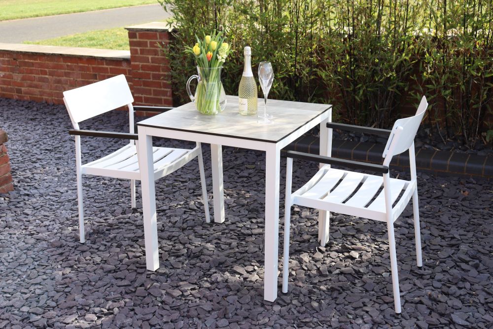- An aluminium frame with a durable powder-coat finish to the table and chairs