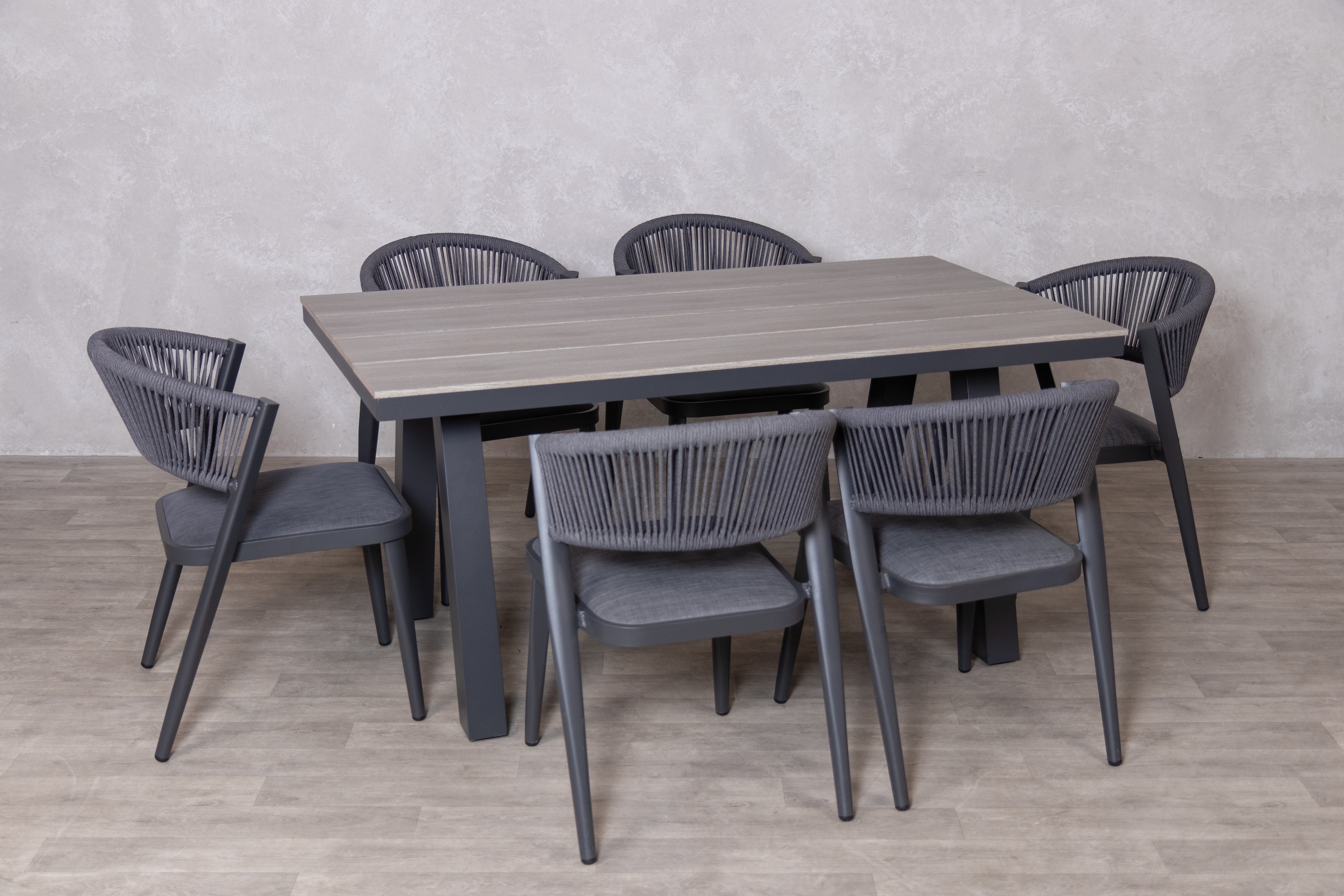 Create the perfect outdoor dining space with the Milano 1.6m Dining Set, featuring a spacious aluminium table paired with six matching rope-back chairs. Designed for both intimate summer dinners and larger gatherings, this set combines practicality with modern style. The table boasts a waterproof PS board top and durable powder-coat aluminium frame, while the chairs feature waterproof padded seats that dry easily with a cloth, high-strength rope backrests, and large nylon foot protectors. Lightweight and stackable, the entire set is UV stabilised and built to withstand the elements, making it ideal for year-round outdoor entertaining and those long, warm summer evenings.