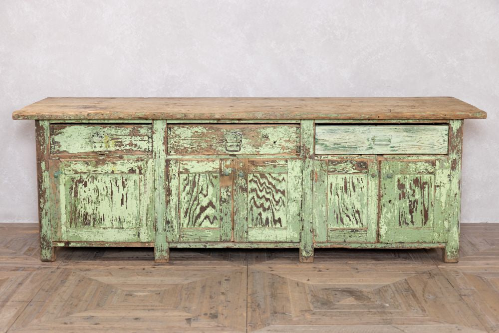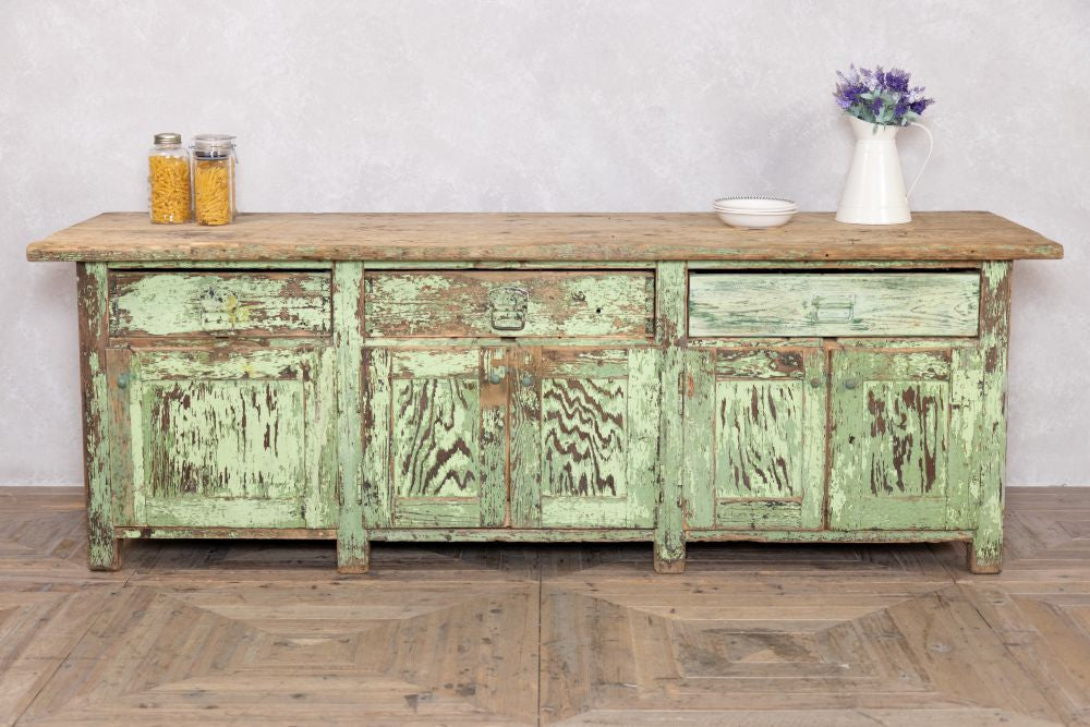 Transform your space with the Vintage Industrial Sideboard Dresser, crafted from durable pine with a blend of rustic and industrial styles. Ideal for bars, restaurants, or kitchens, it offers practical storage and worktop solutions. In commercial settings, it serves as a stylish storage unit for cutlery, glasses and menus. For kitchens, it adds old-world charm as a kitchen sideboard or storage unit. Each piece is unique with authentic vintage marks. Embrace its timeless appeal for a worn vintage look.