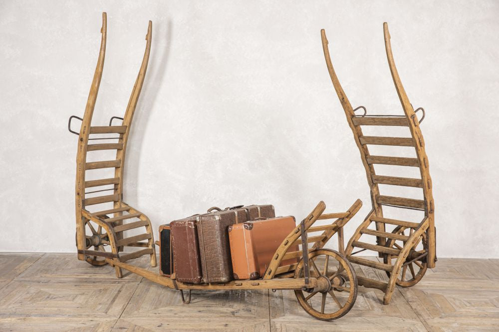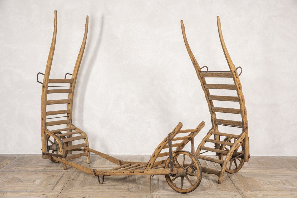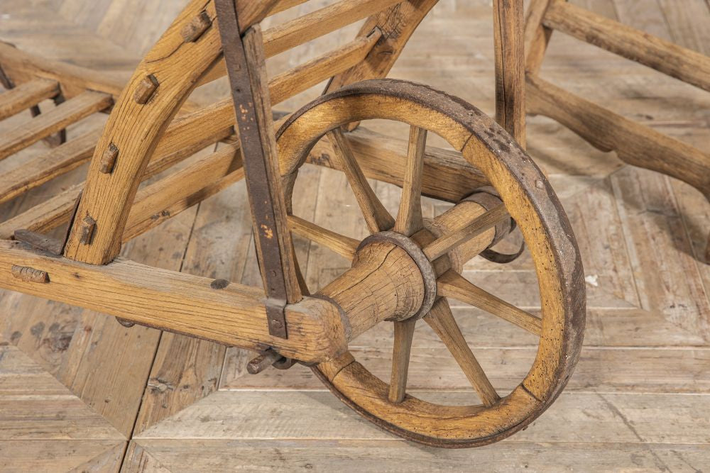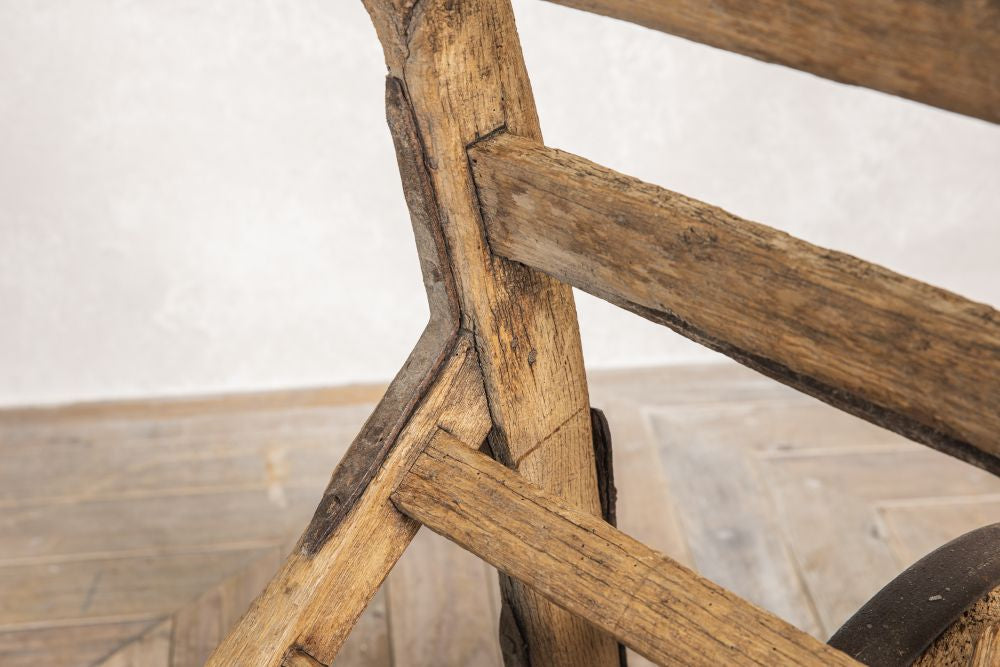 With traditional slatted wooden joinery and iron mounts, this trolley would make a suitable log holder or could be mounted on the wall with other agricultural vintage items, to add intrigue and interest to a themed interior.