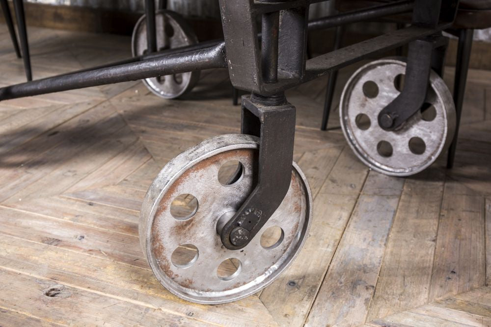 Upcycled from an original cart, we have added a rustic timber top to the Metal Trolley Table. The wheels on the cart base mean you can move this industrial table around with ease. A unique statement piece for any space, the dining table will certainly get tongues wagging!