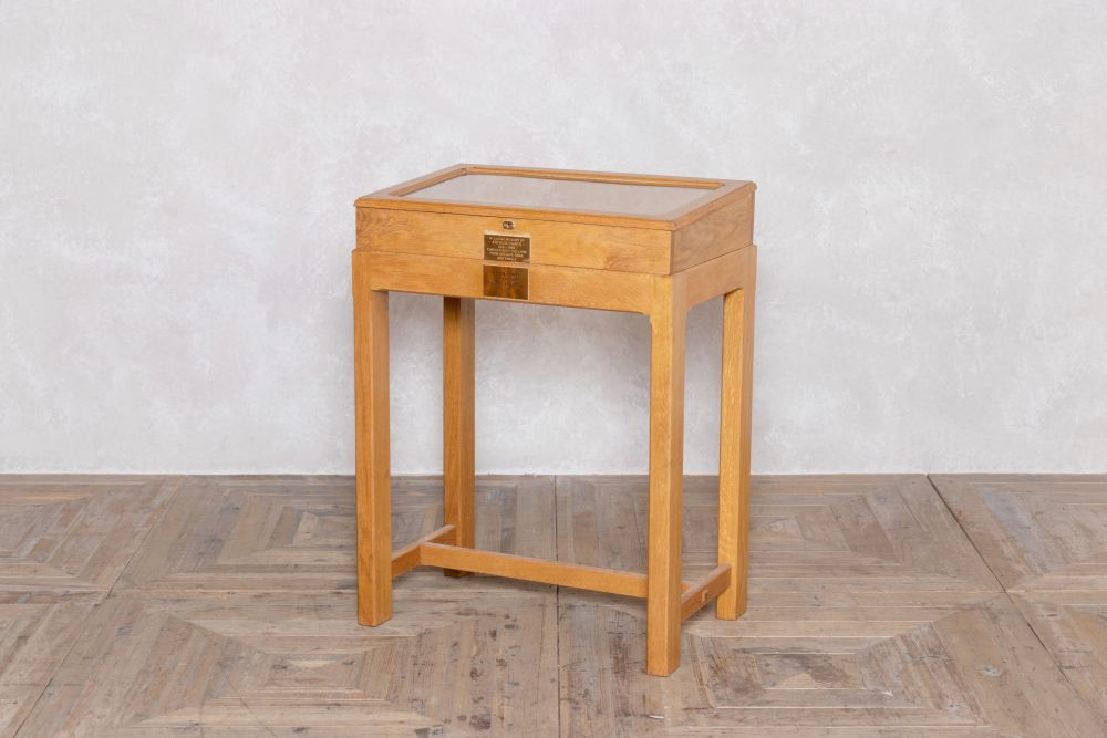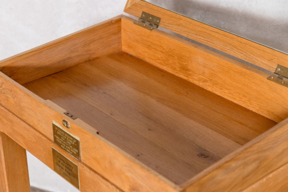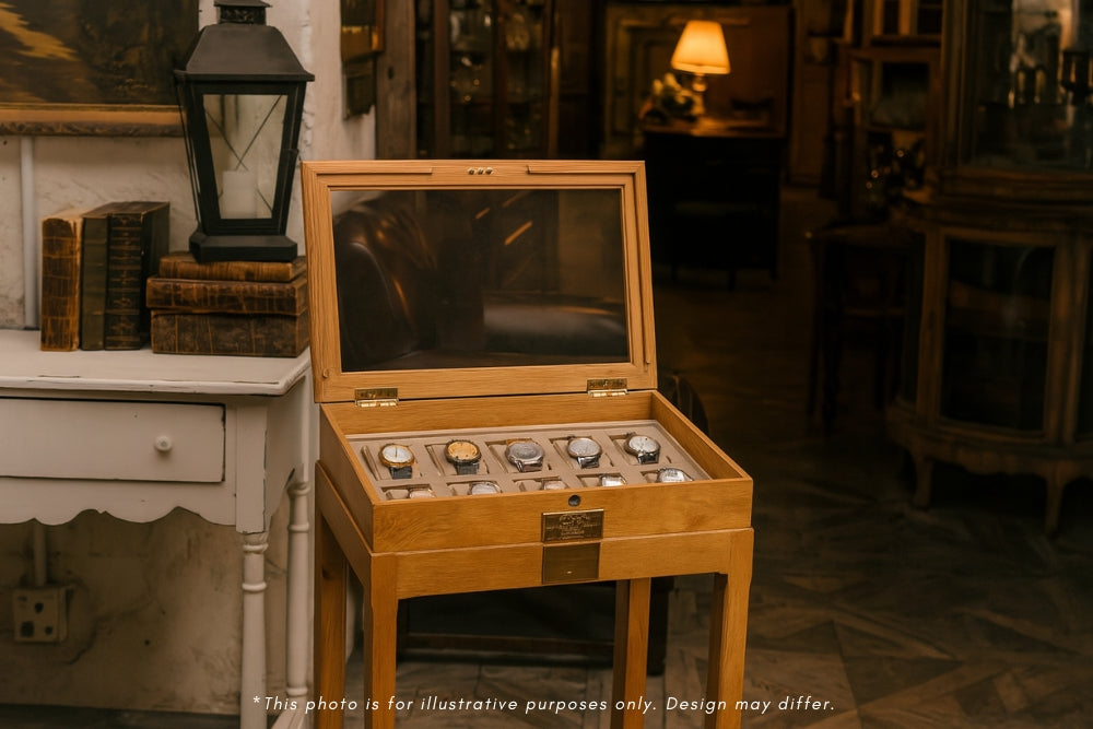 This elegant solid oak display stand serves as a refined collectors cabinet, perfectly designed for showcasing treasured watches and small pieces of Georgian silver. Elevated on sturdy legs with clean lines, the cabinet features a convenient lift-up glass lid that provides clear visibility while protecting valuable items from dust. The warm wood tones and traditional craftsmanship highlight the cabinet's timeless appeal, making it an ideal addition to any home seeking to display cherished collectibles.