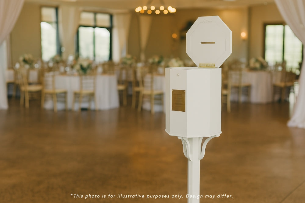 This elegant hexagonal church donation box stands on a sturdy wooden base with a convenient lift-up lid and practical slot. Versatile in function, it serves perfectly as a suggestion box or charming wedding post box for cards and well-wishes. Its warm wooden finish and thoughtful standalone pedestal design ensure both aesthetic appeal and easy access in any church, business, or event setting.