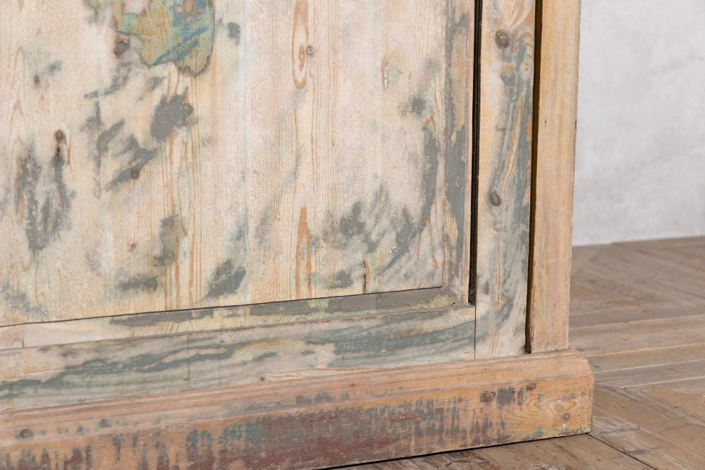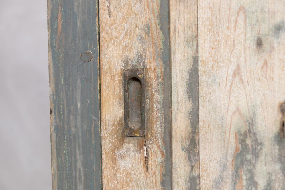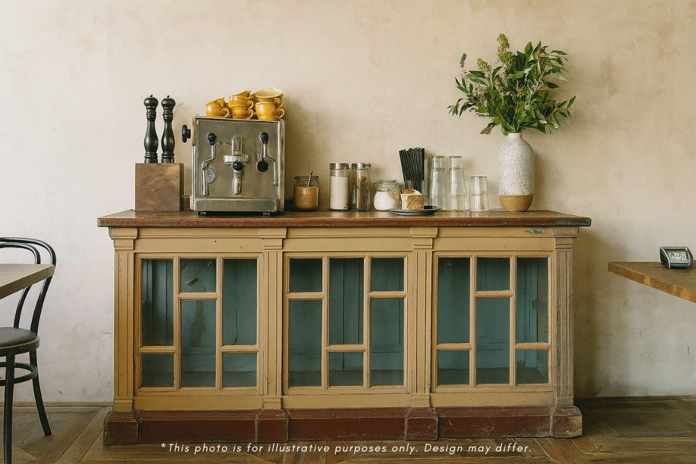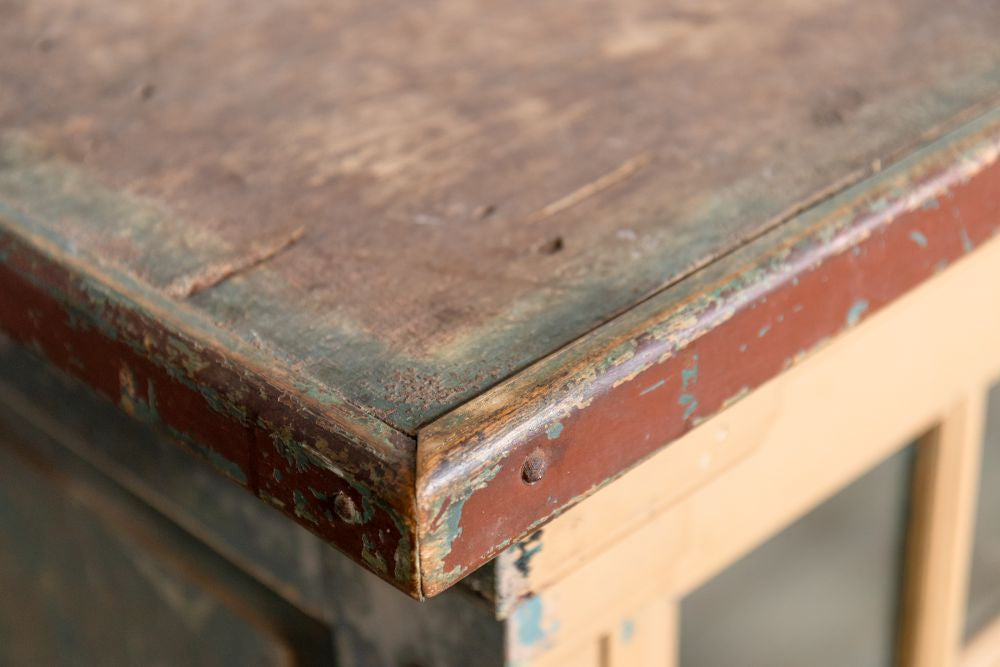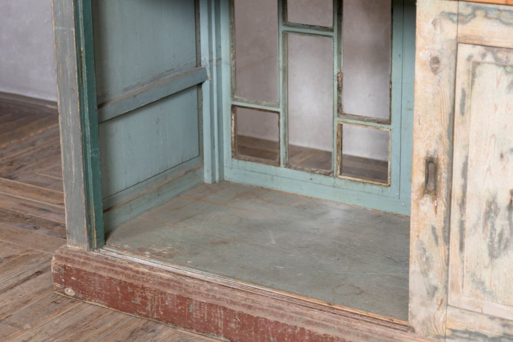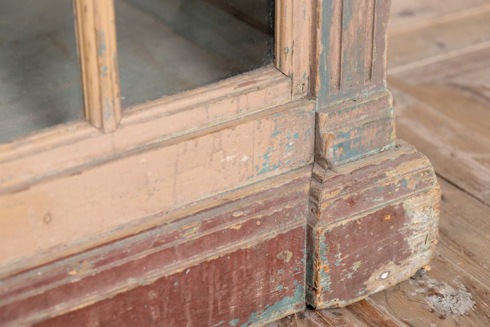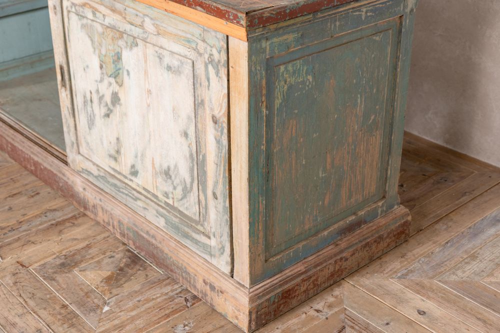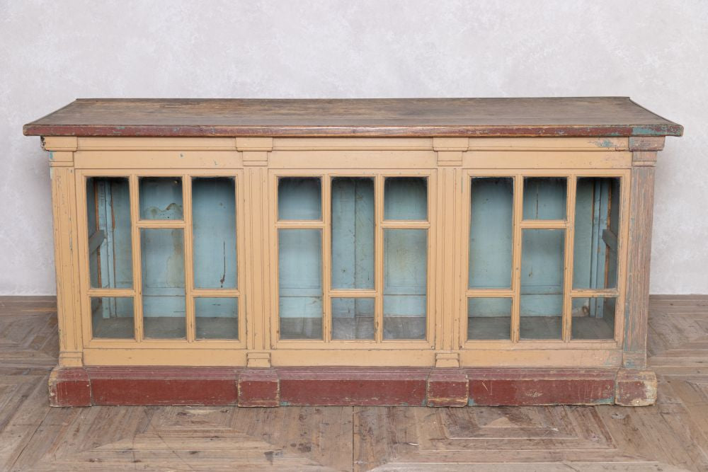 This vintage 1890 Counter / Kitchen Island features authentic distressed paintwork that showcases its rich heritage and character. The elegant glass doors provide both practical storage and visual appeal, allowing displayed items to be showcased while protected. Standing as a versatile piece, it functions beautifully as a kitchen island, retail counter in a boutique shop, or as an elegant server in a restaurant setting. Its historical charm and design make this piece not just furniture, but a statement of timeless craftsmanship that brings warmth and history to any space it occupies.
