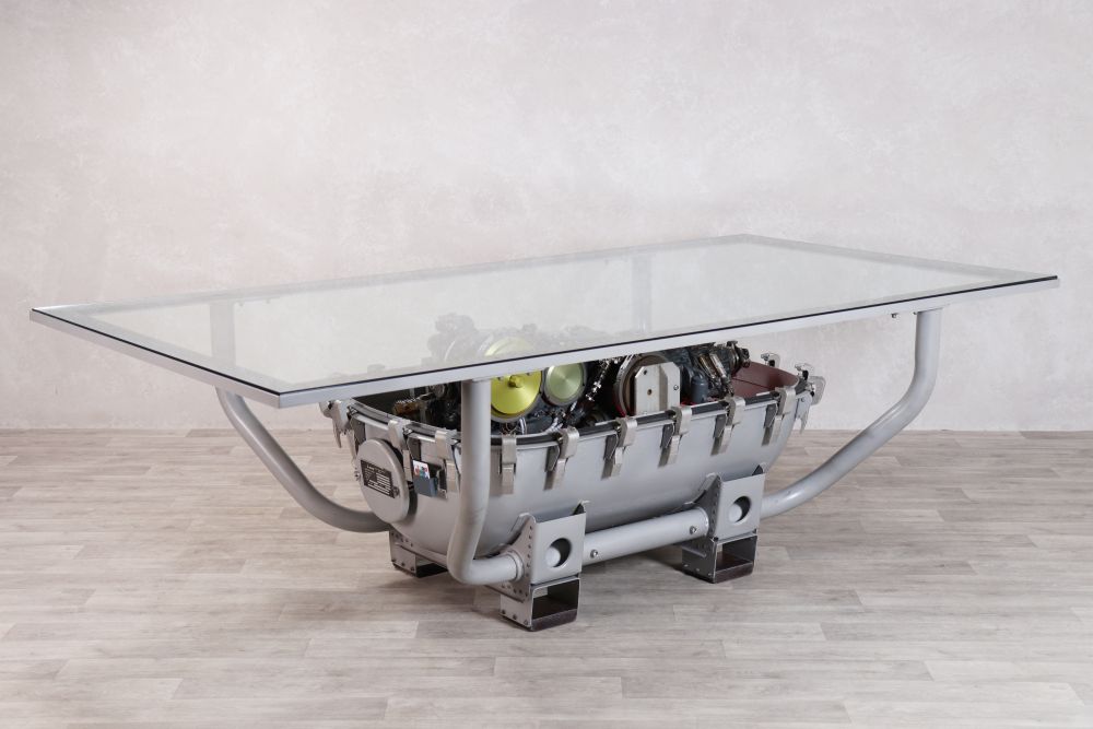 The RAF Tornado Table is a unique piece of aviation art, ideal for enthusiast and collectors of aircraft history. Featuring an authentic RAF Tornado gear box centre that has undergone a meticulous process to retain its historical integrity to elevate your vintage styled home, commercial space, or restaurant.