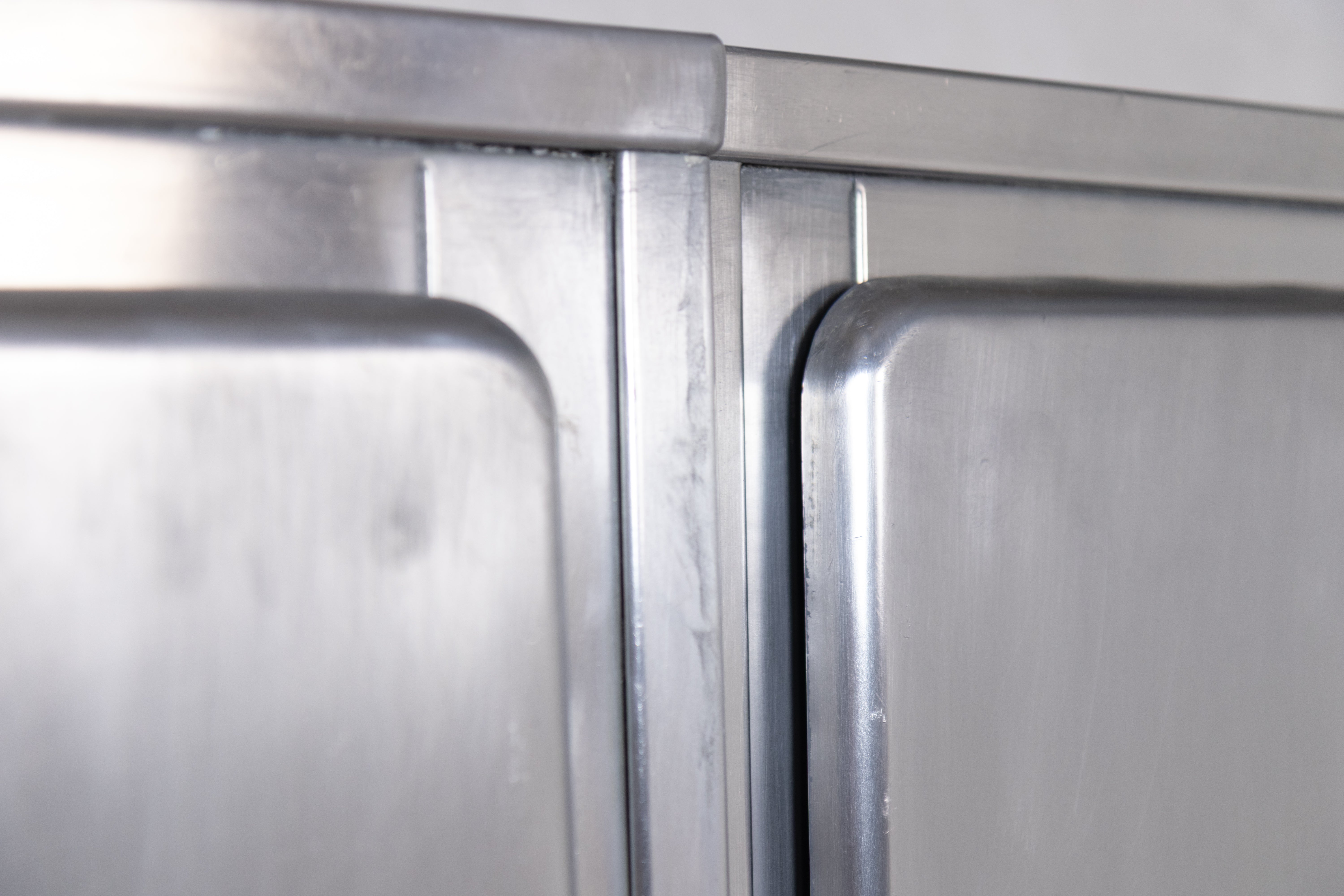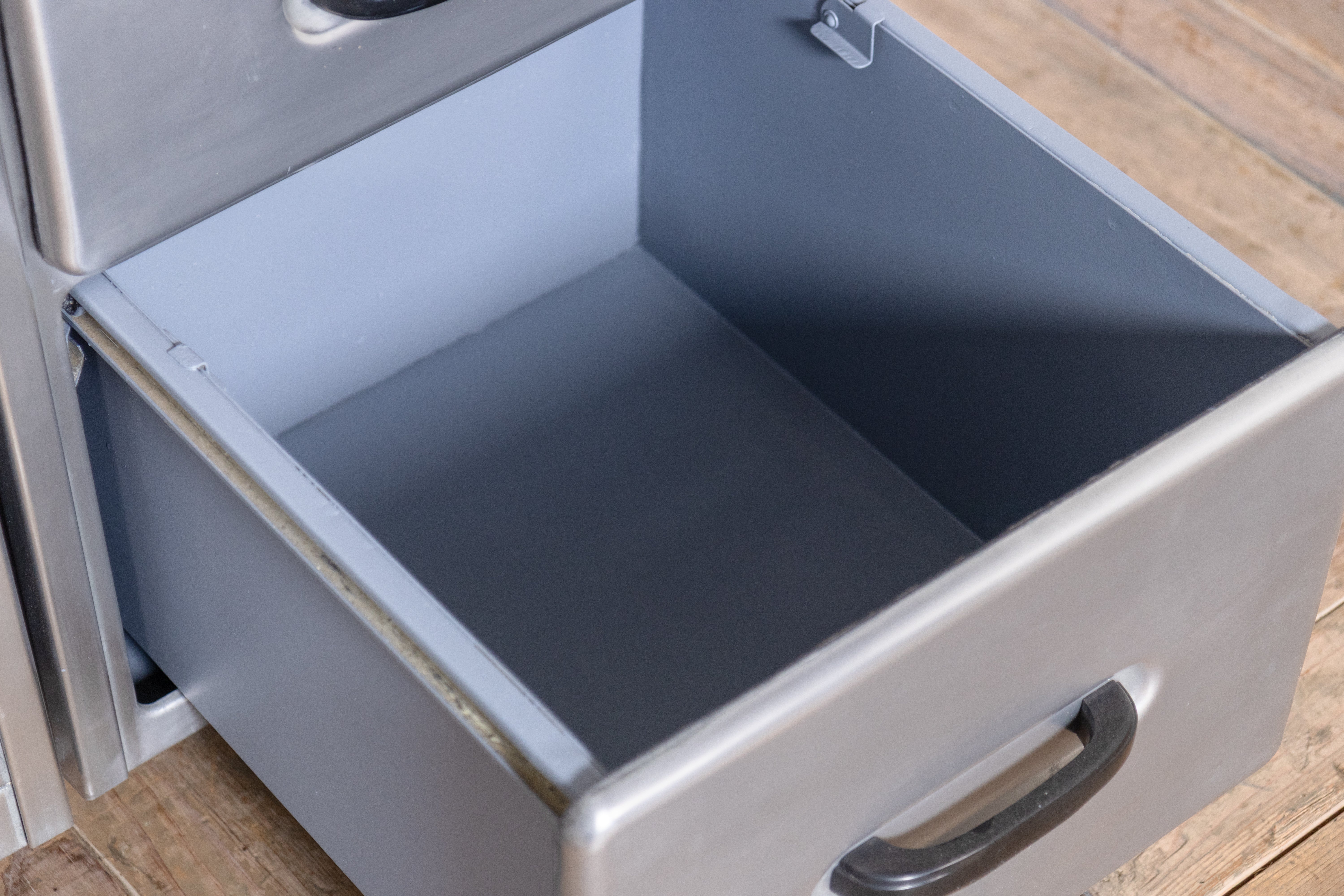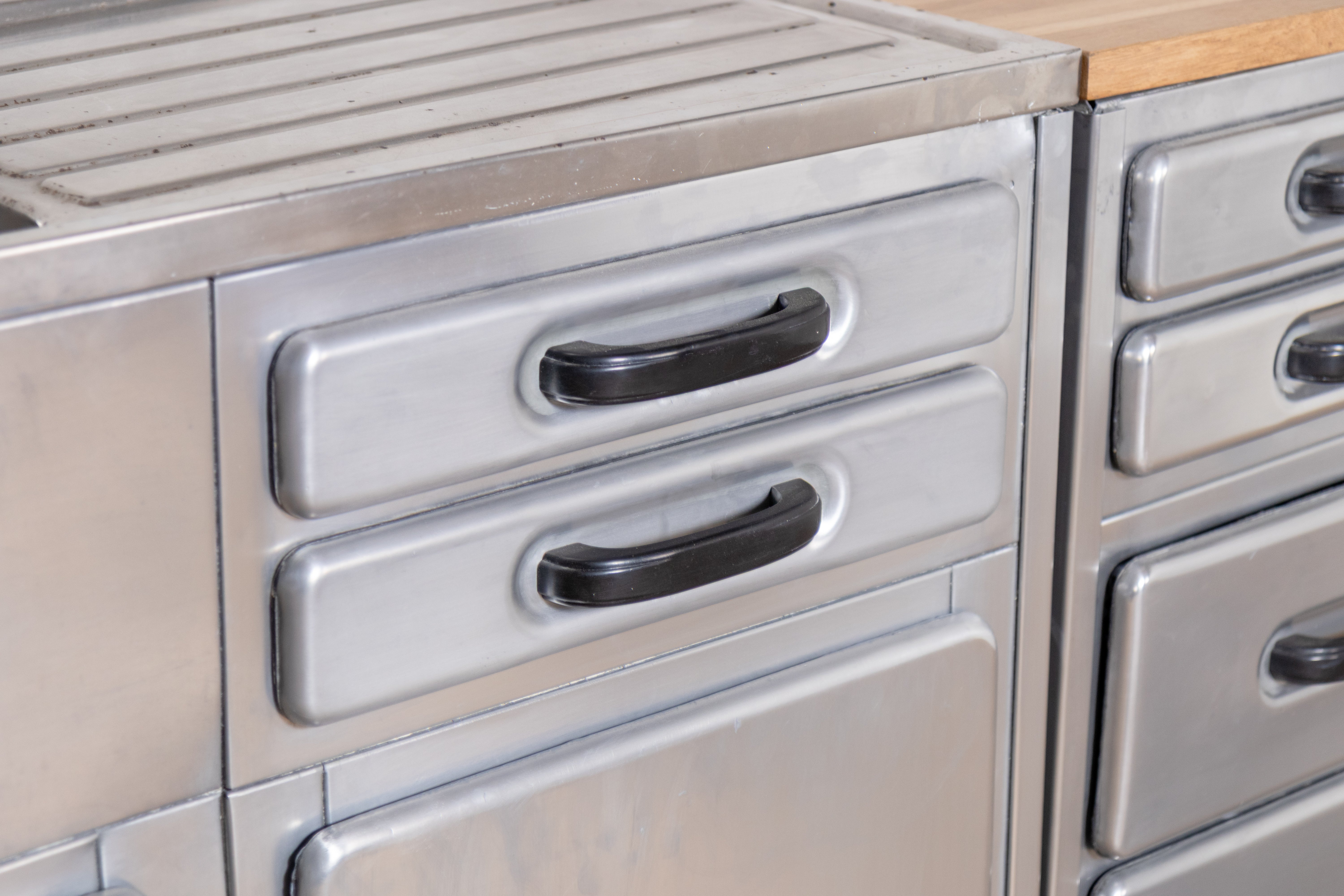 This 1950s Redwing kitchen is stripped back to reveal its original aluminium finish, giving it a distinctive industrial character that works beautifully in boutique hotel rooms, shepherd's huts, and outdoor kitchen spaces. The set includes a mix of base and wall units with storage and a sink, offering a practical, complete kitchen solution with mid-century charm. The brushed metal surfaces and vintage proportions bring authenticity to hospitality projects or off-grid living spaces. As with all vintage pieces, marks and variations in the aluminium add to its character and tell the story of its decades of use.