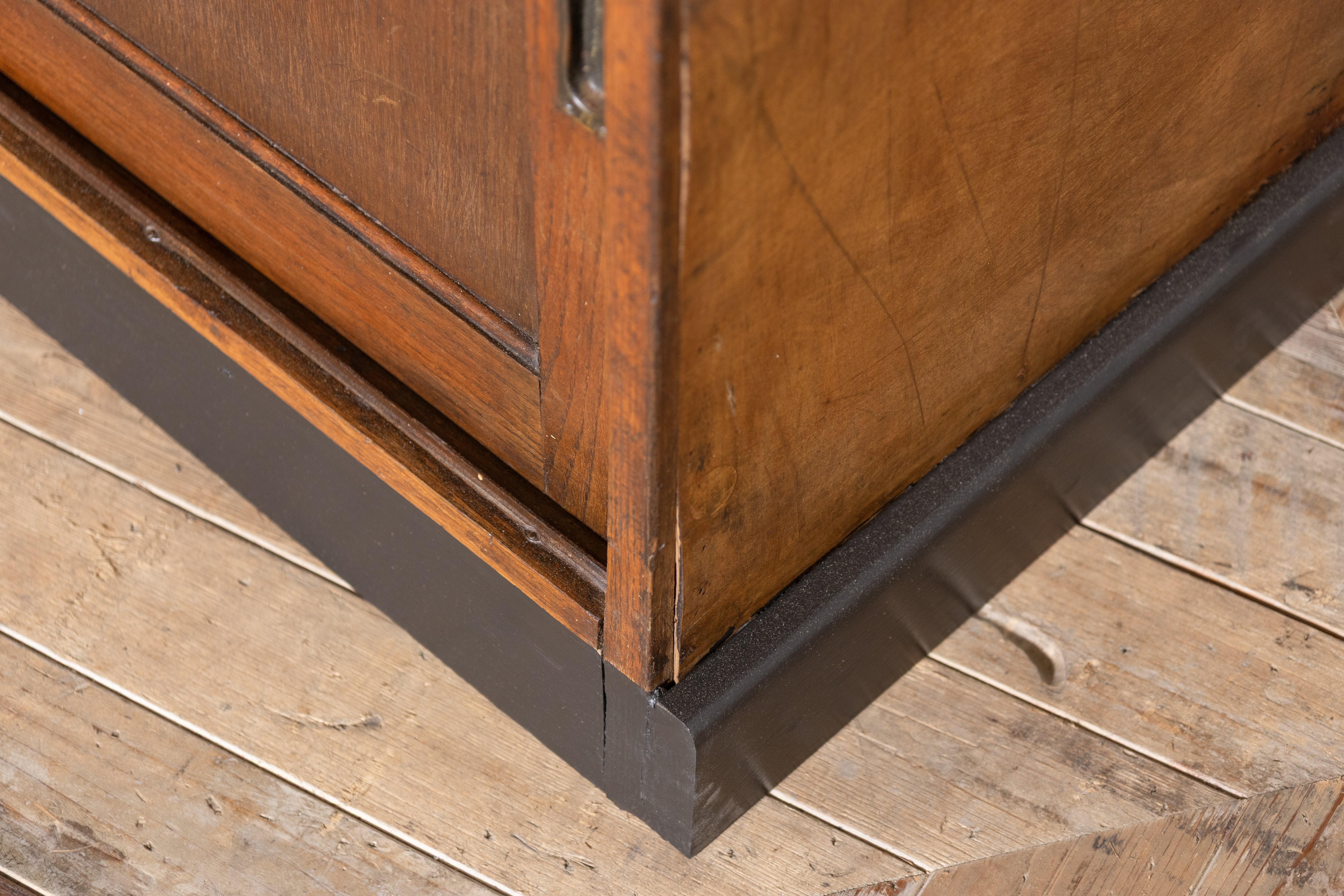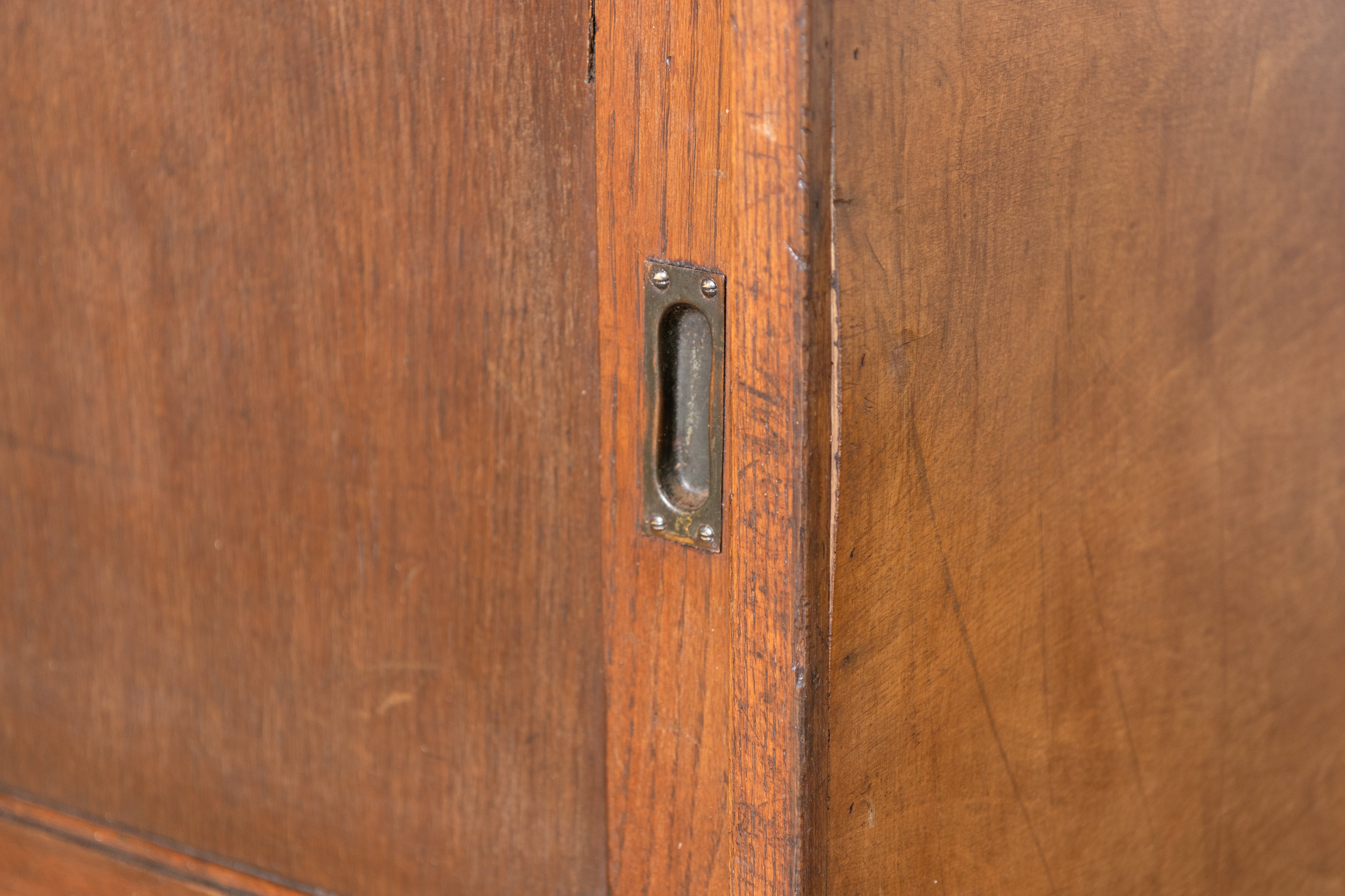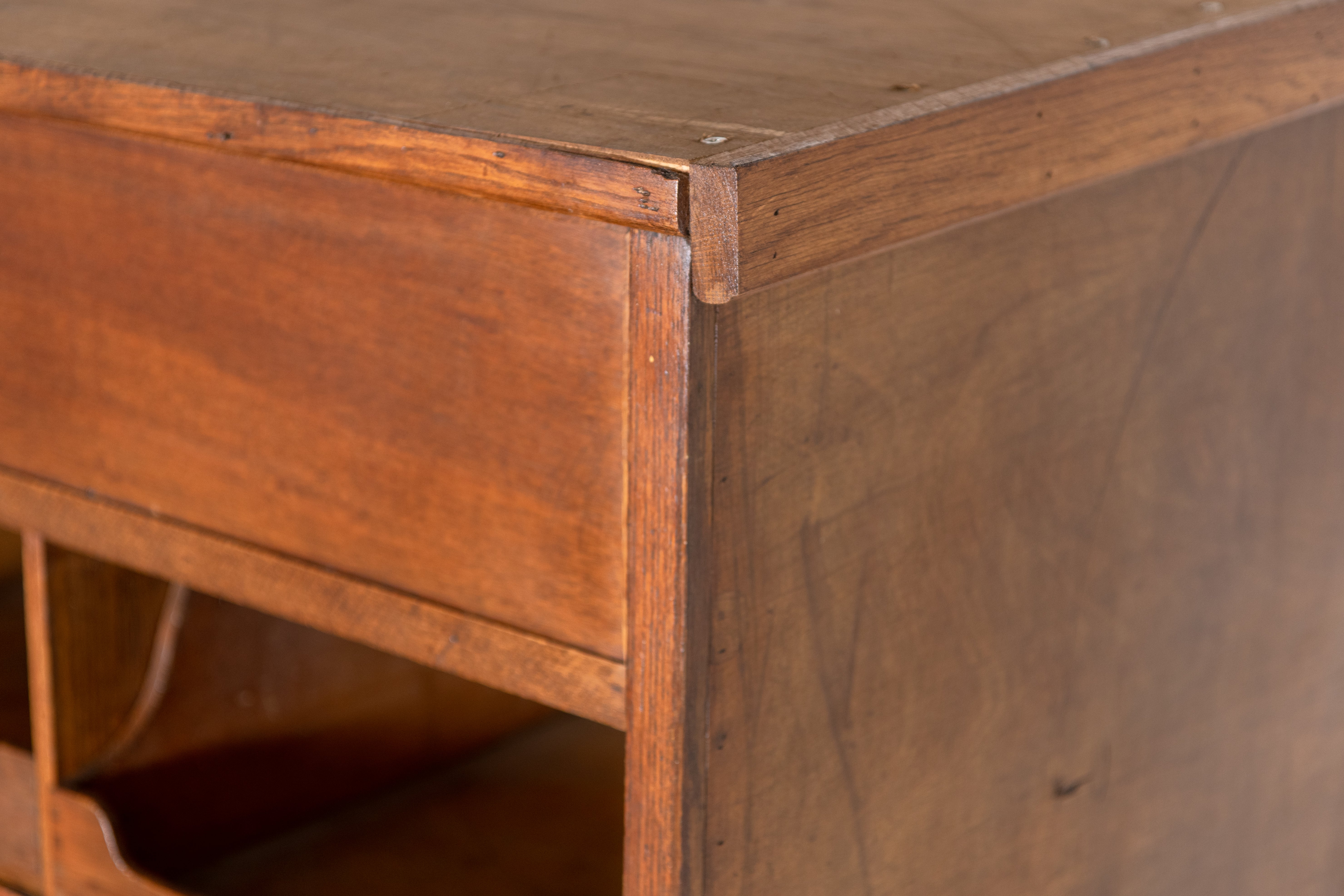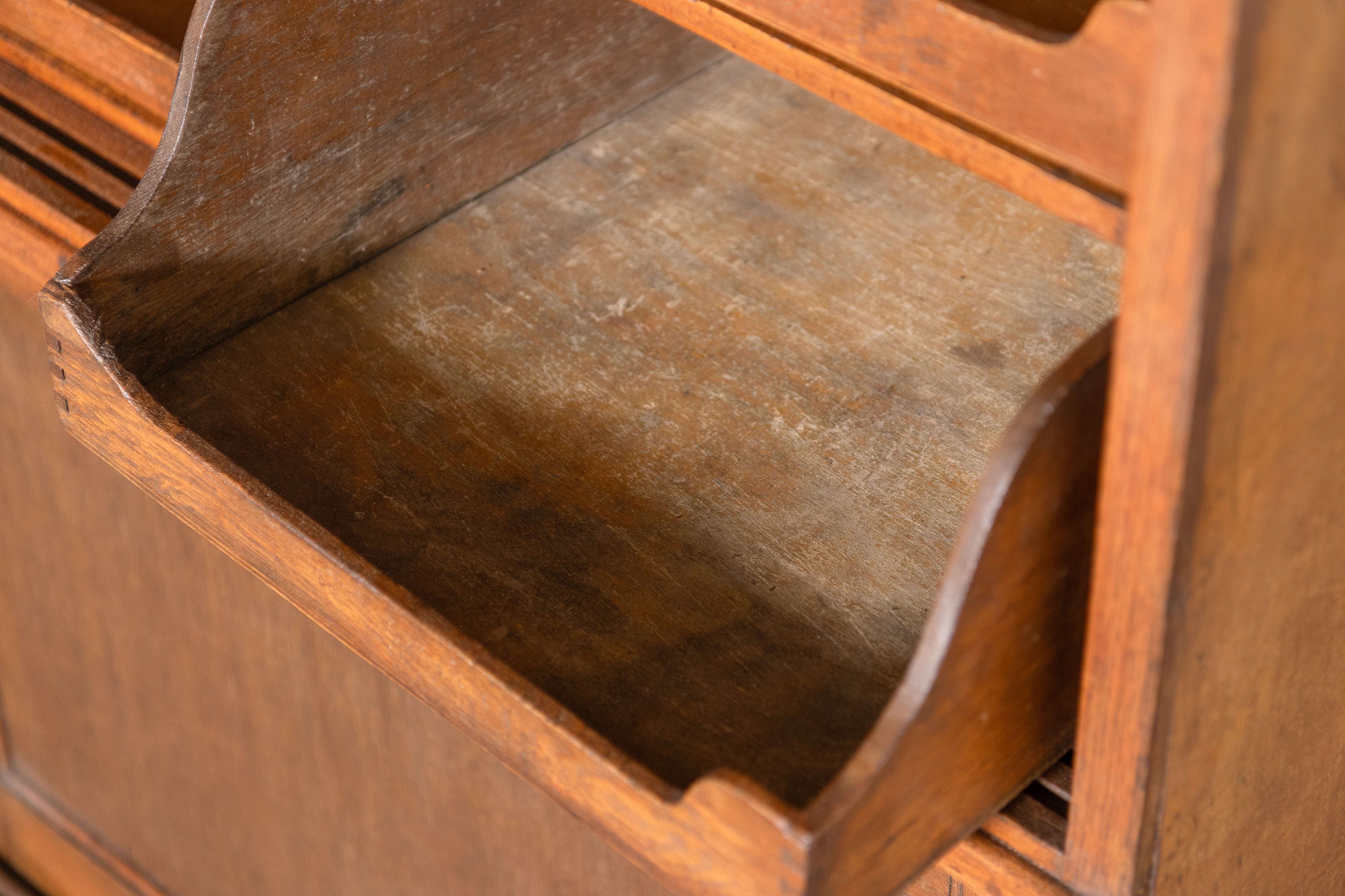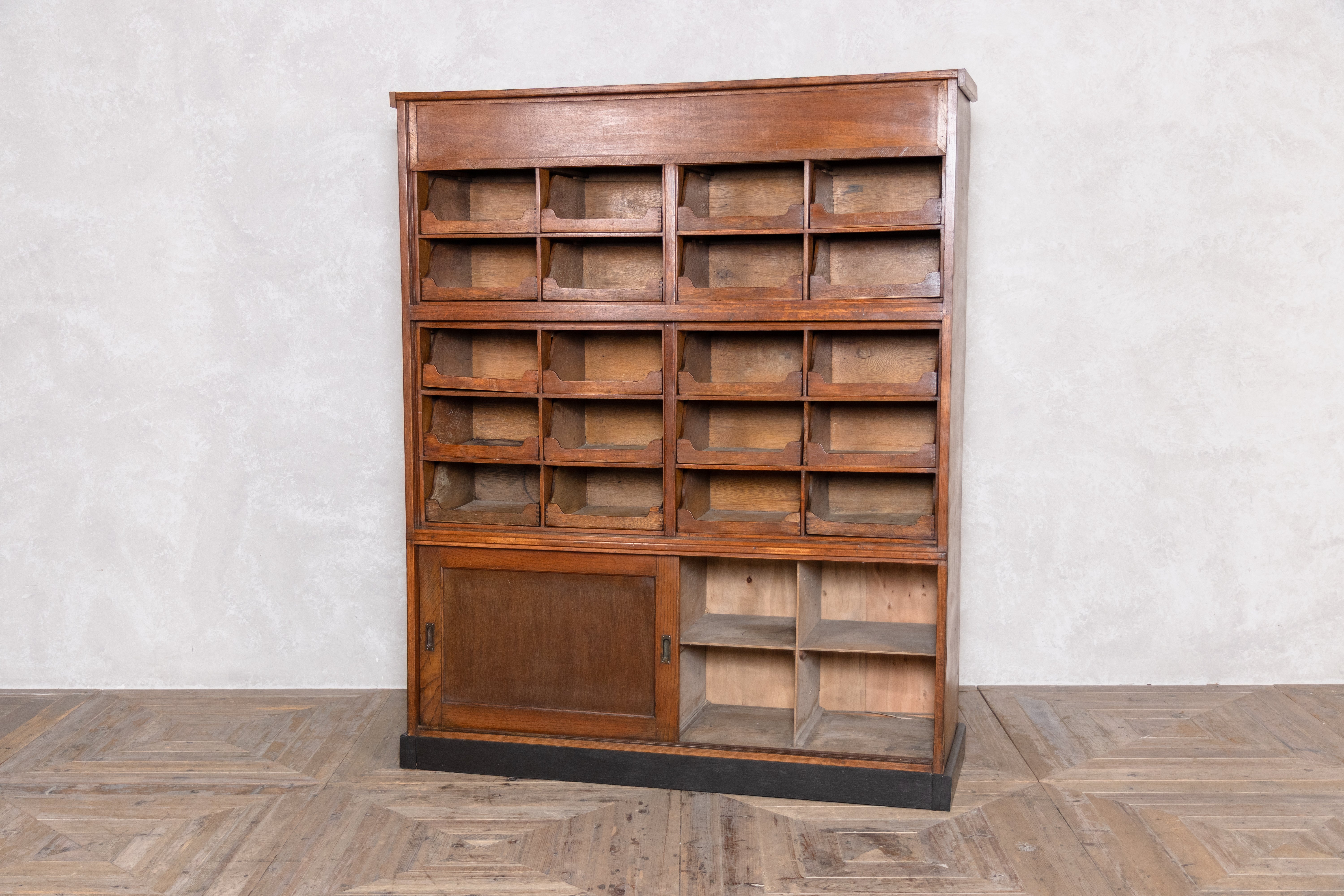 This striking haberdashery unit dates from the 1950s and served as shop display furniture in its working life. The piece features multiple pigeon-hole compartments and drawers that made it perfect for organising materials and supplies, and today it would work beautifully in a sewing or craft room where storage and visibility are key. One sliding door is missing, but the exposed shelving gives the unit an open, accessible feel. The warm wood tones reflect mid-century commercial furniture at its most practical.