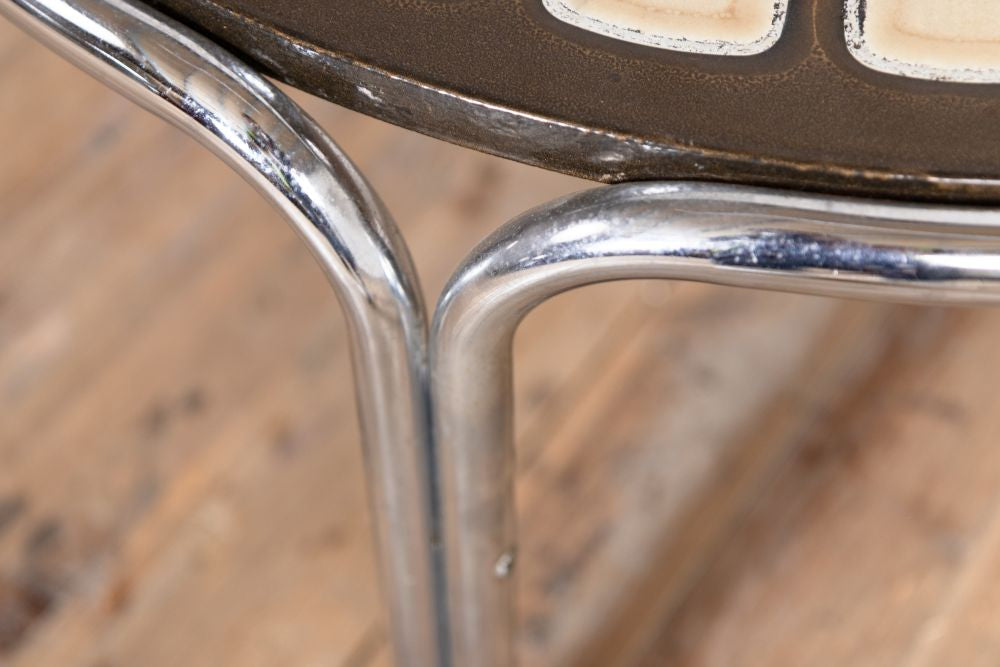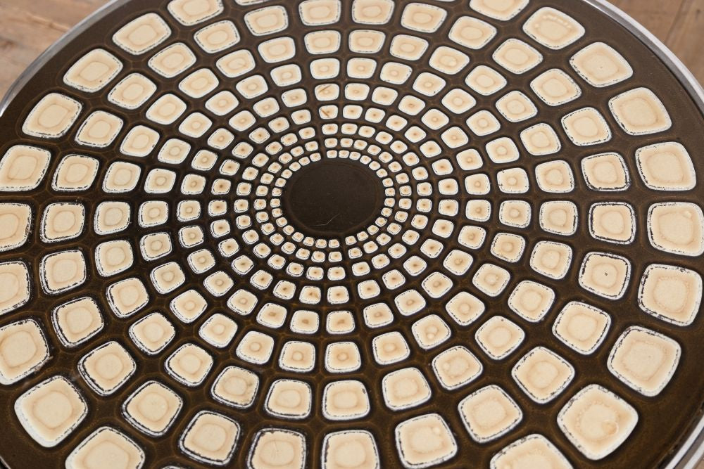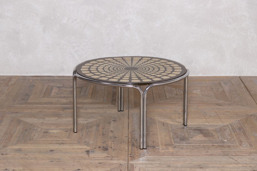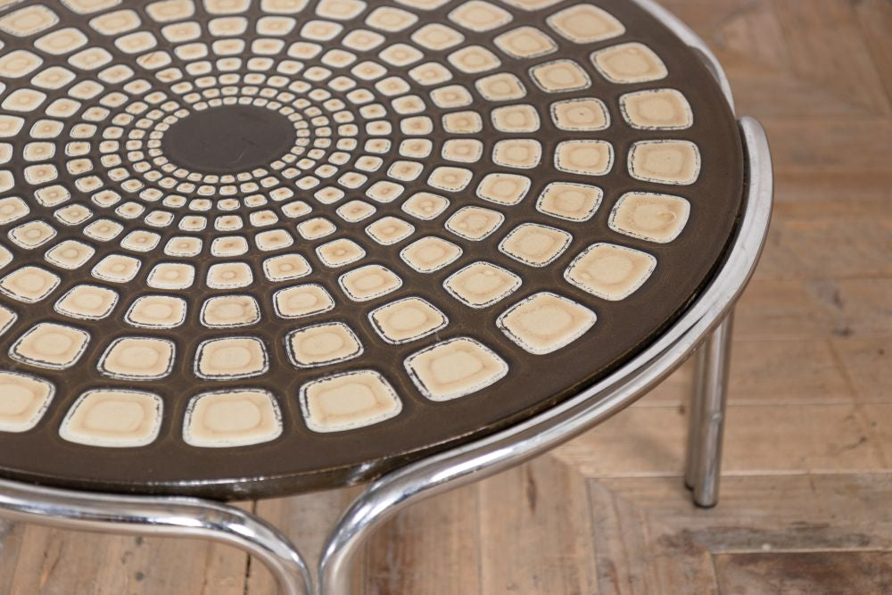 This striking 1970s coffee table features an eye-catching embossed circular tortoise shell pattern radiating from the centre of its surface. The intricate geometric design showcases authentic retro style, while sleek chrome legs provide sturdy support and reflect the era's fascination with metallic finishes. The table's distinctive vintage aesthetic captures the bold, artistic spirit of seventies furniture design.