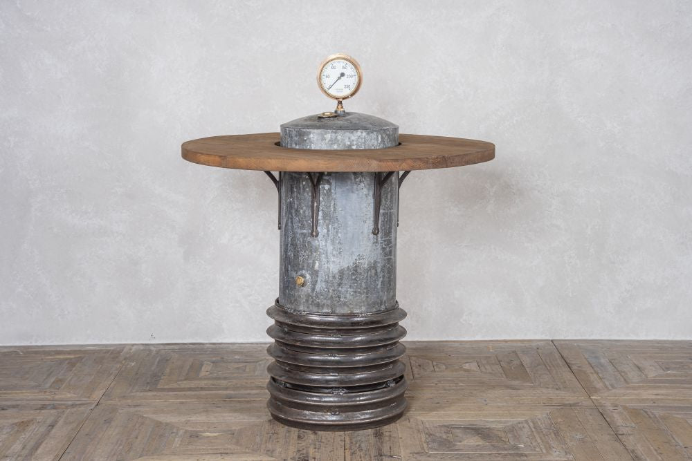 Created from a combination of an old water tank and pressure gauge, this Industrial Riveted Pressure Gauge Table is a high-quality bar table guaranteed to make a statement. Thanks to its unique design and large size, the table is a great entertaining table that will be enjoyed by many. The table has been built to last, allowing guests to wine and dine with that all-important wow factor for many years to come.