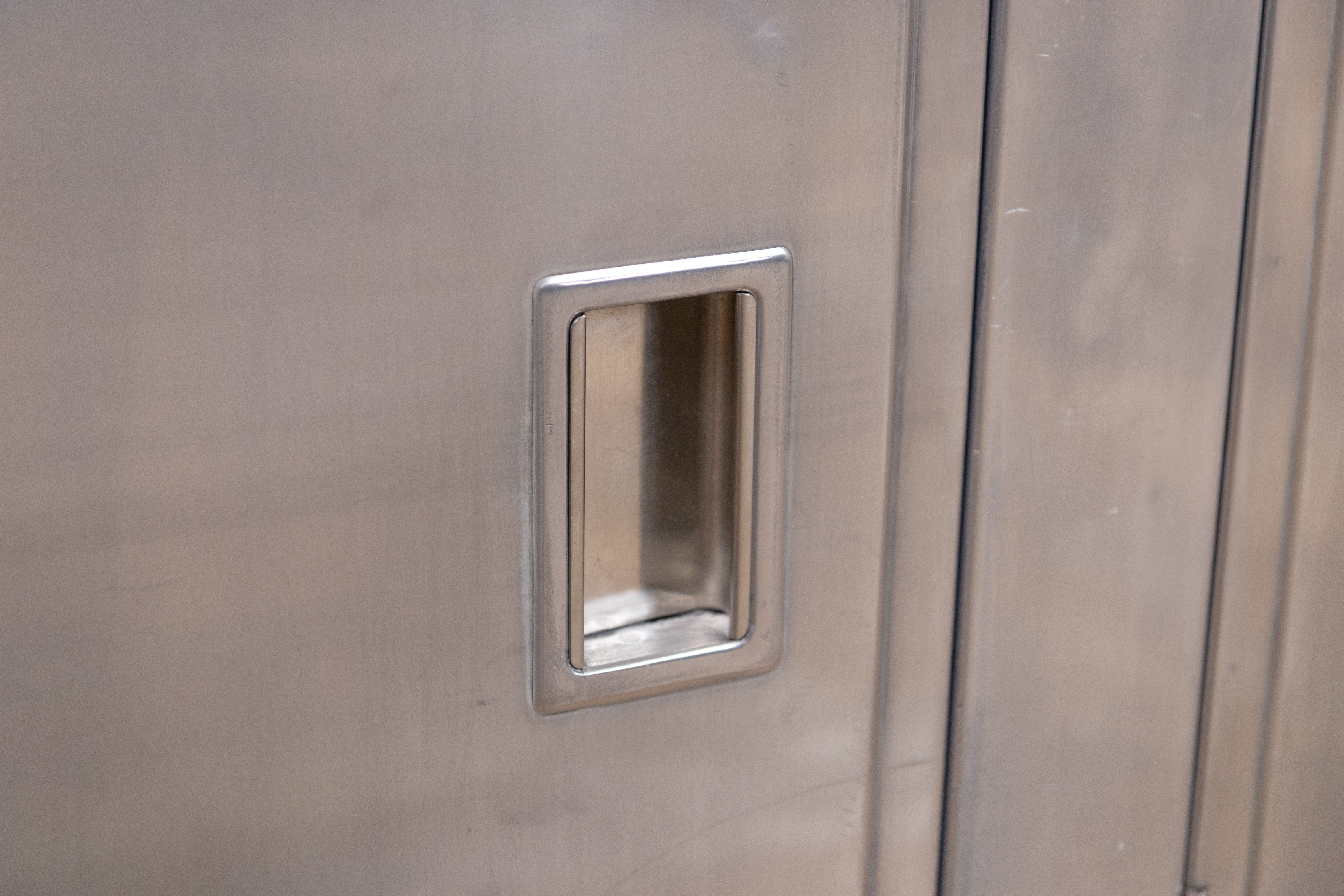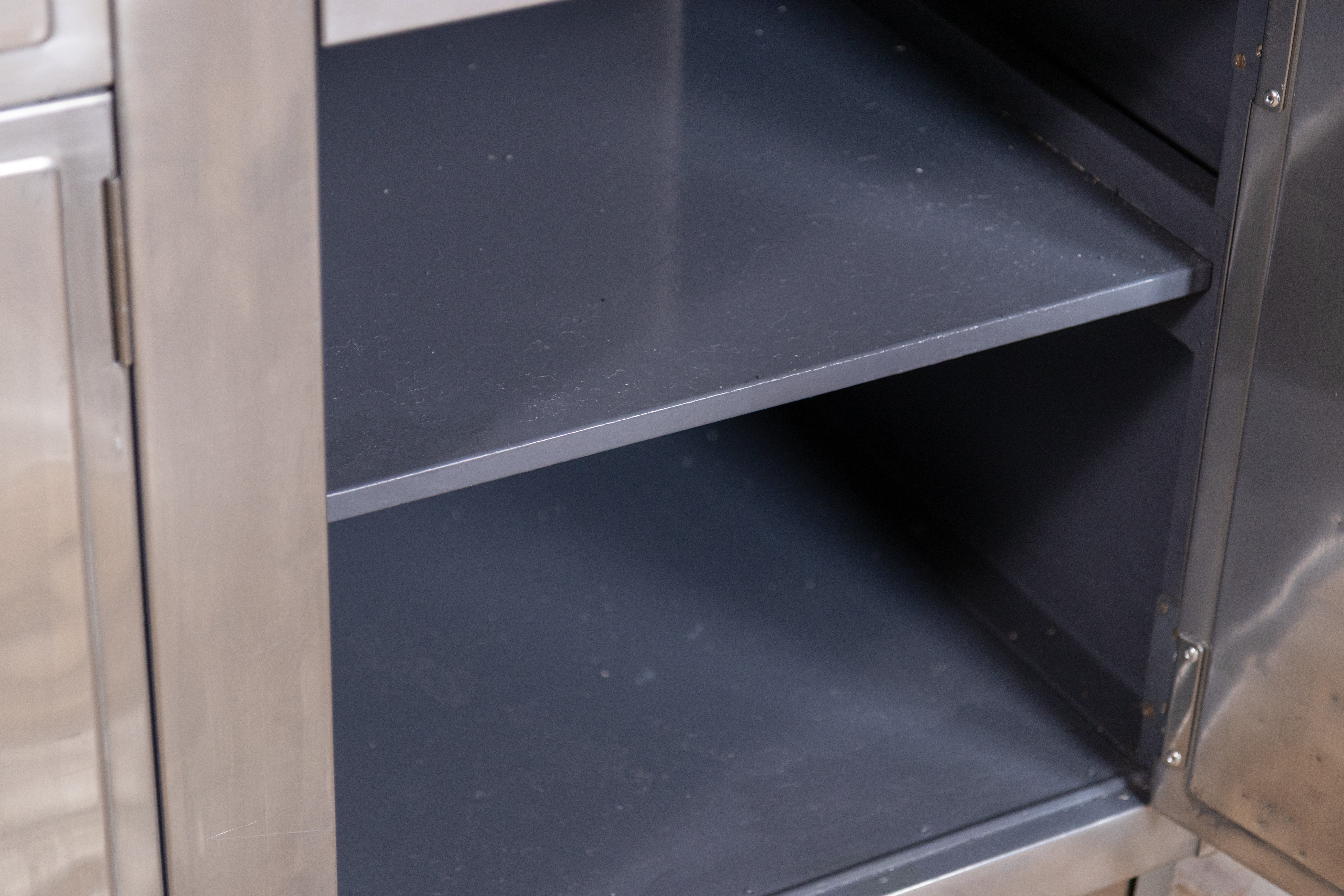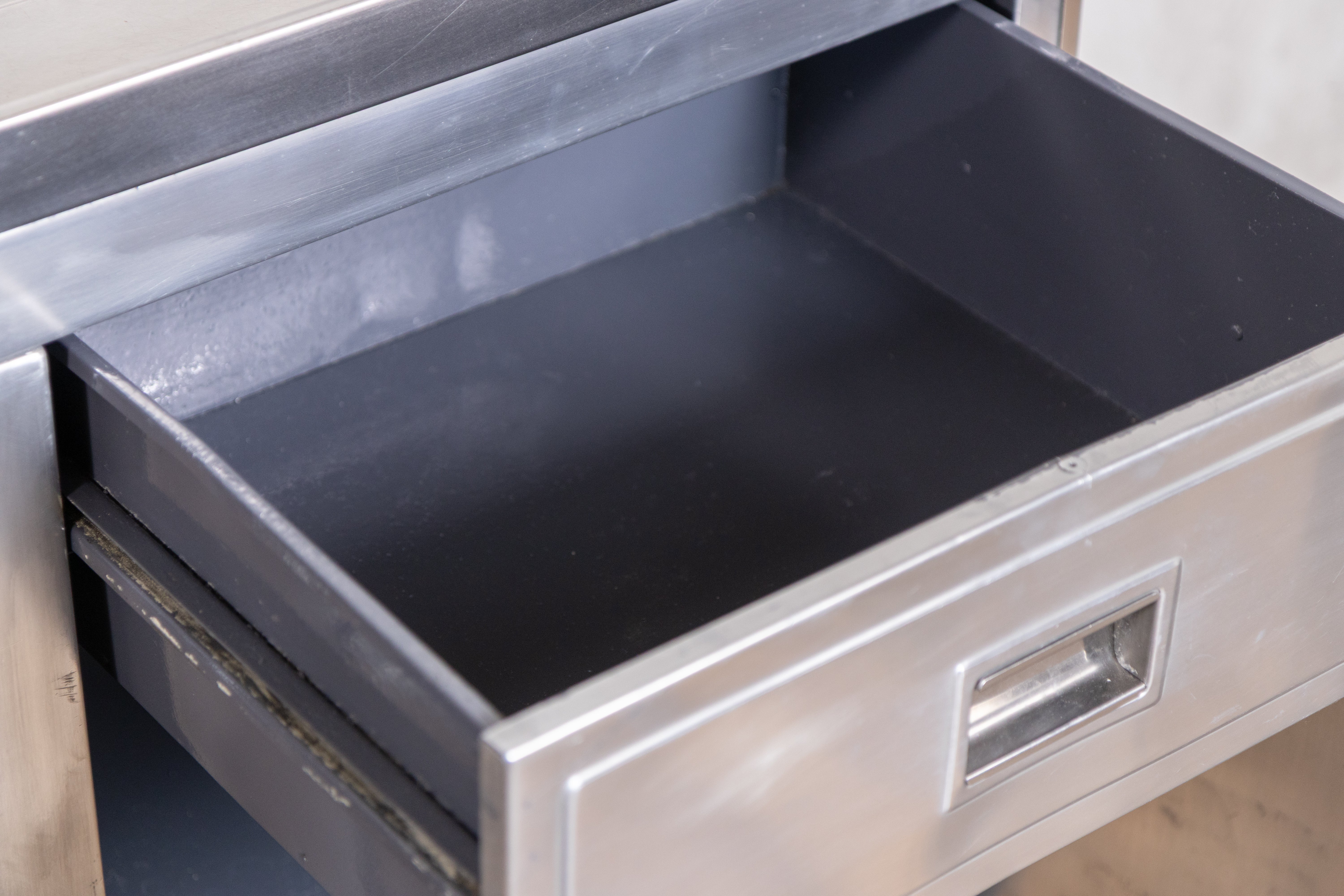 This 1950s/60s aluminium kitchen unit has been meticulously stripped back to reveal the beautiful raw metal beneath, creating an authentic industrial aesthetic perfect for characterful holiday homes, cabins, or huts. The drawers provide practical storage while maintaining the sleek metallic appearance, and careful repair work has restored any imperfections.