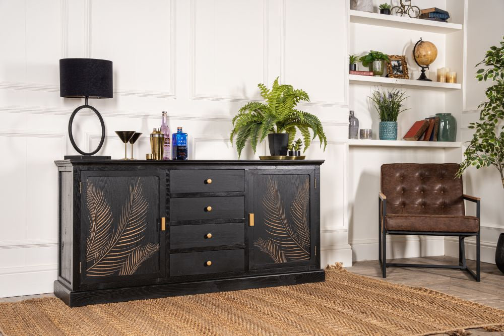 Introduce a sleek and contemporary botanical style into your home with the Arizona Black Sideboard. Its matte black patina allows for the natural woodgrain to still be visible and is disrupted by delicate gold elements.