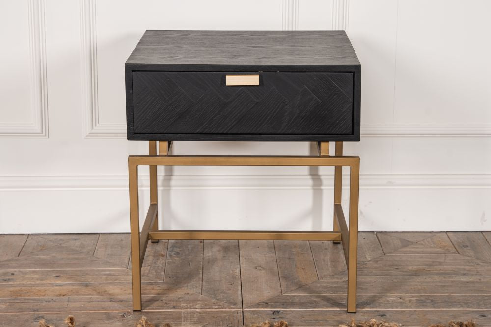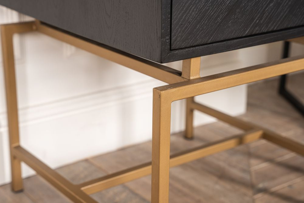 Simple yet striking, the gold pull handle and base-frame sit in contrast to the matte black patina of the oak veneer table top. Position this table against a plain wall to make a statement in a lounge or bedroom.