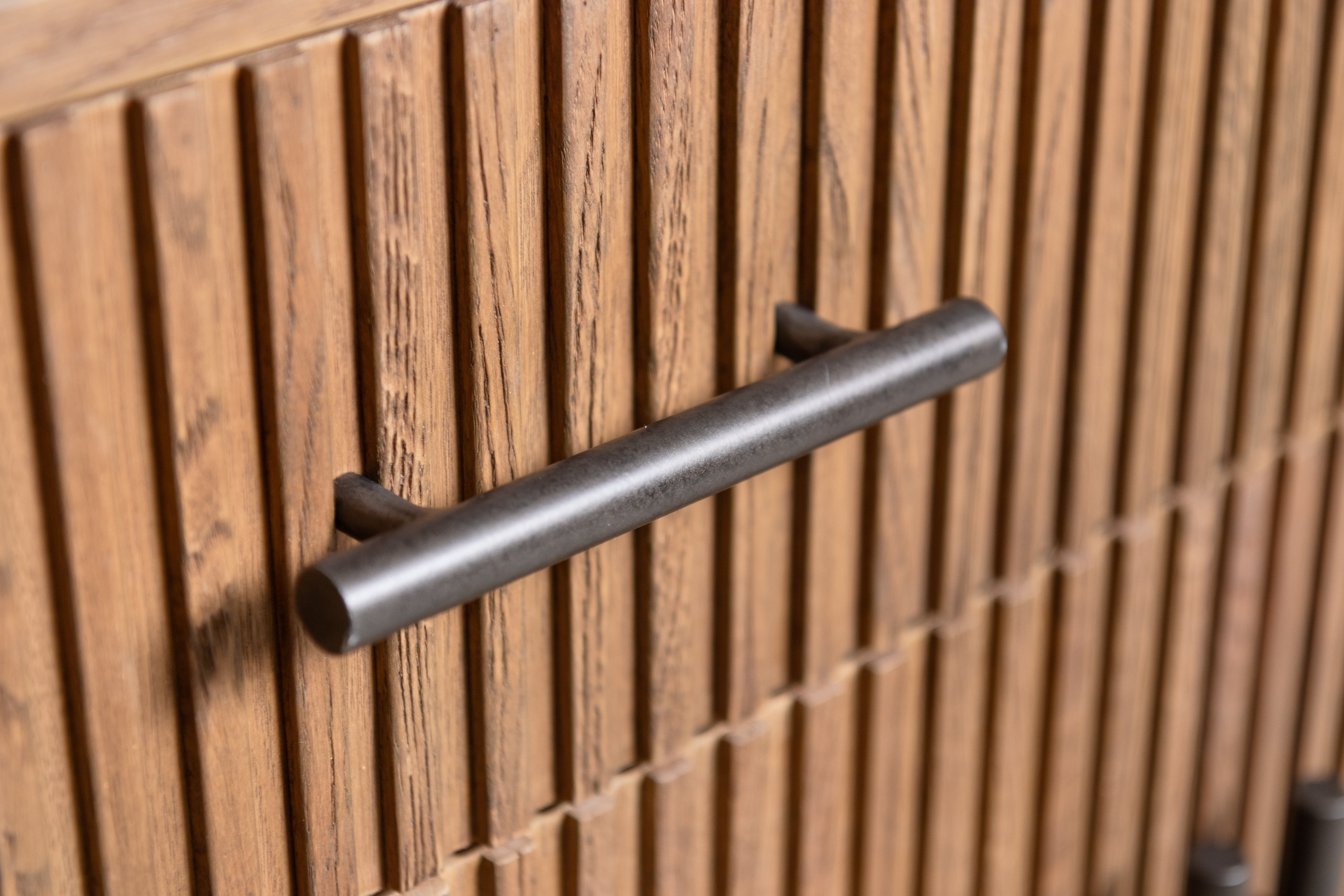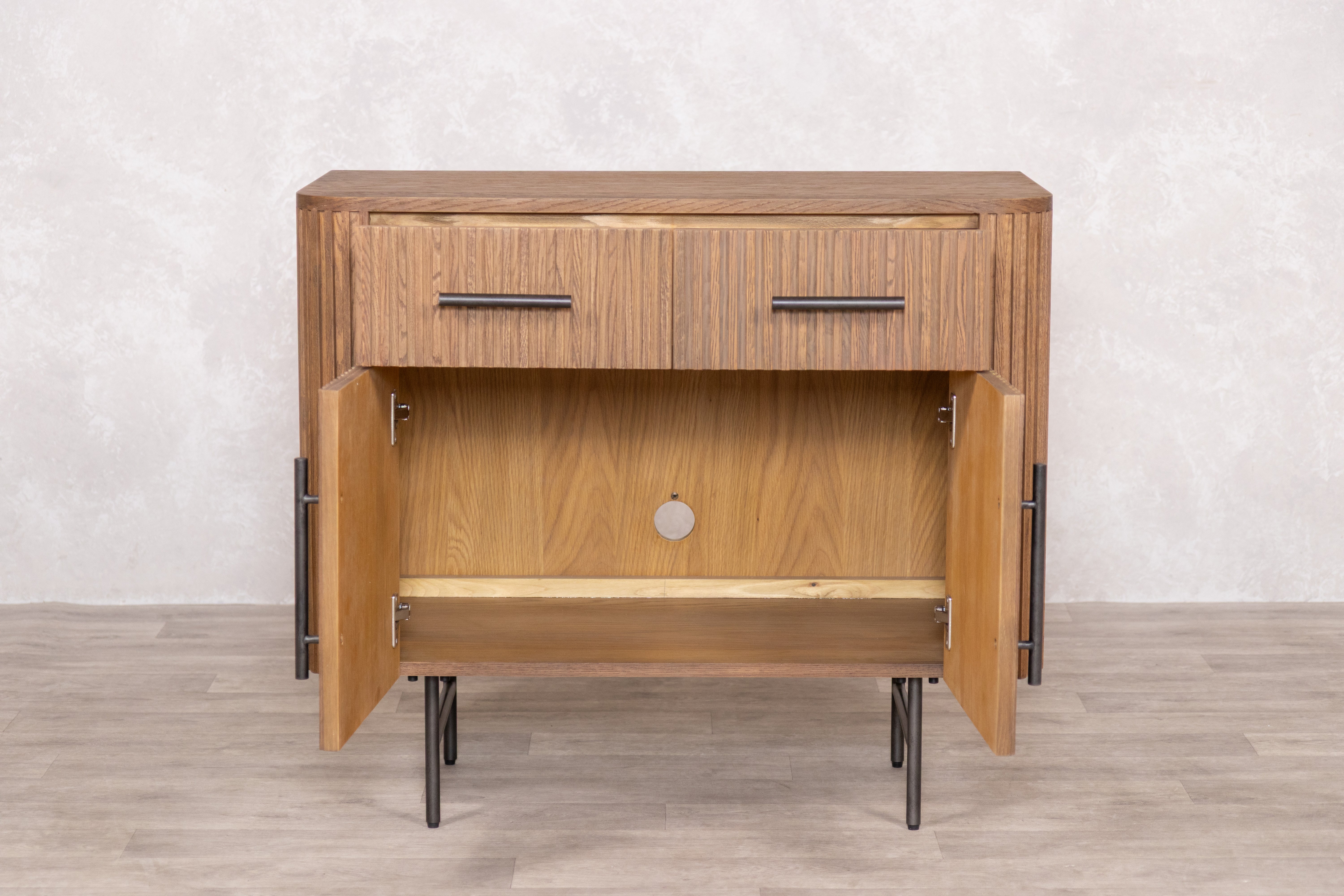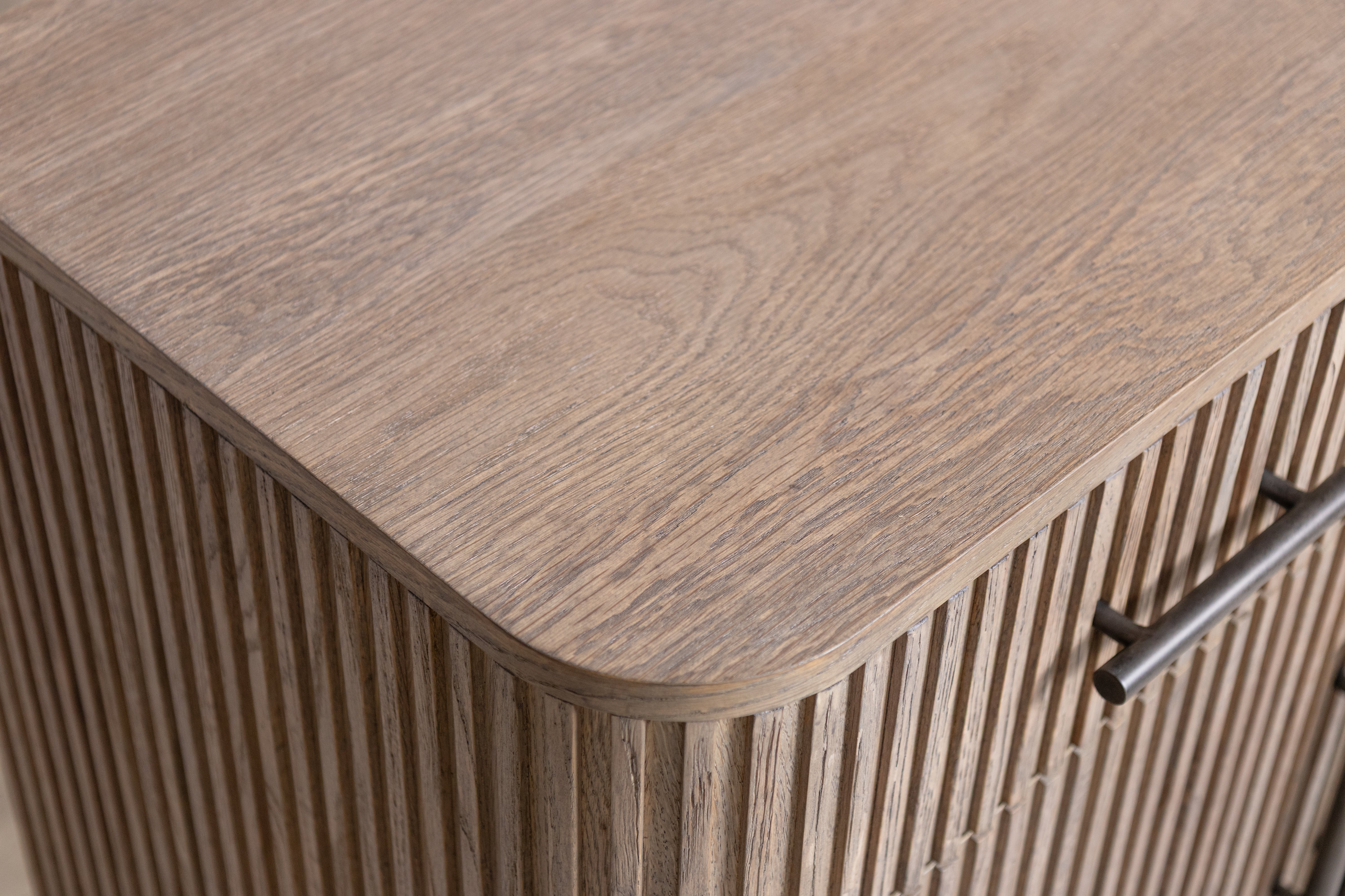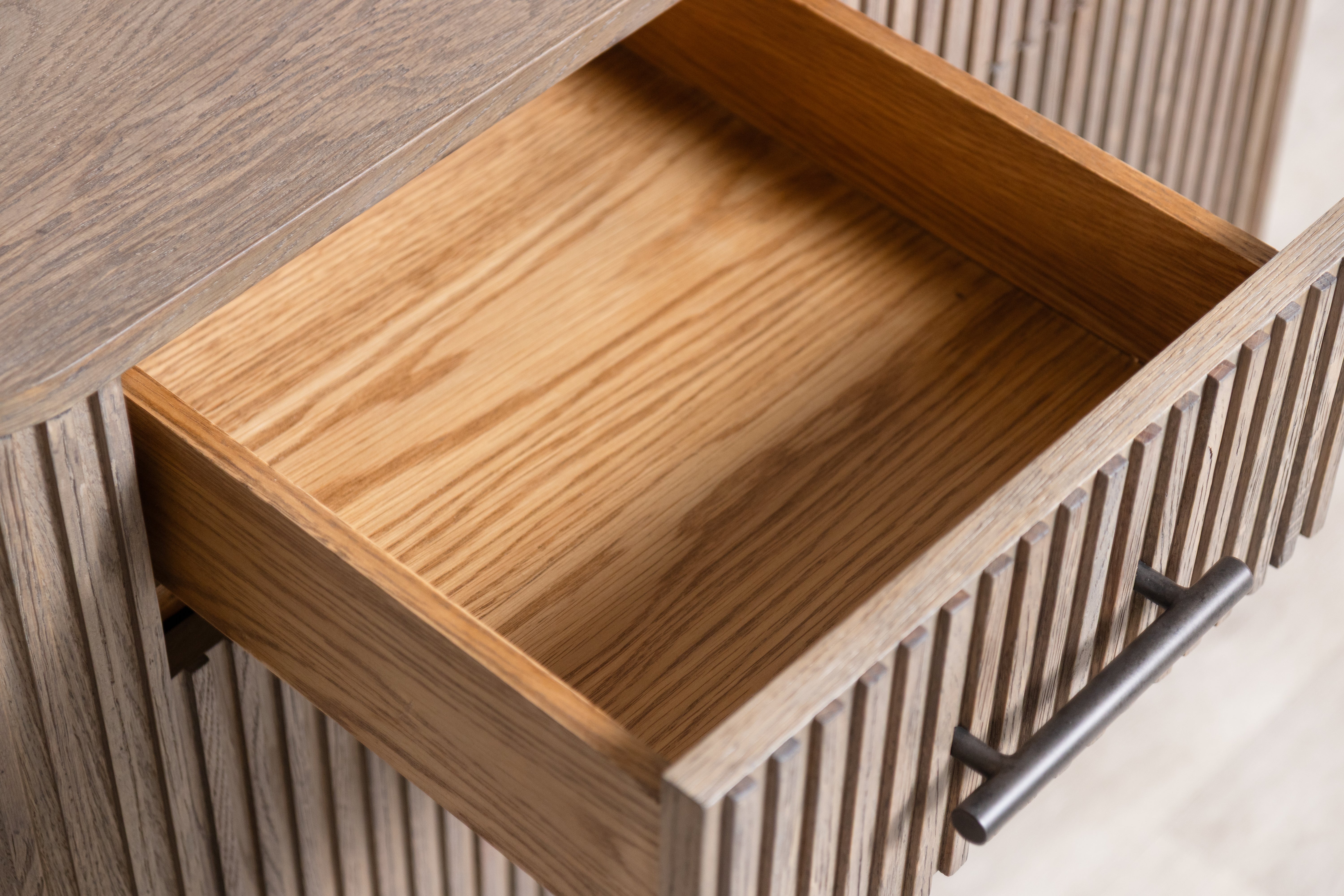Offering extensive storage and a streamlined contemporary design, the Ashfield Ribbed Two Door Sideboard with Drawers brings a sophisticated edge to your home or commercial space. The two storage drawers above the four doors maximise your storage options while maintaining a clean and polished profile. Crafted from premium red oak with a distinctive ribbed pattern, black metal hardware, and soft closing hinges, the Ashfield fits perfectly into any space, whether a hallway, lounge, or bedroom.