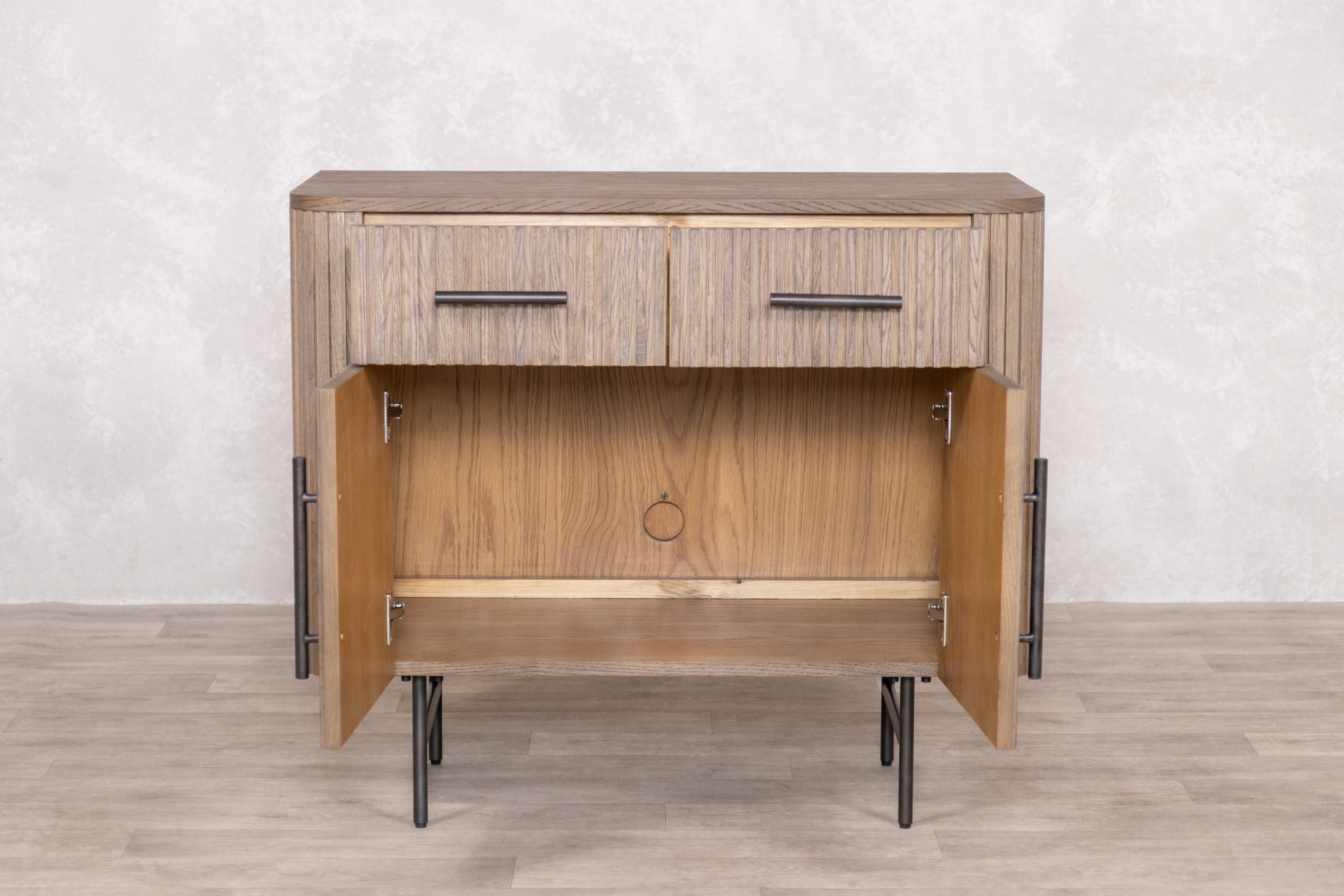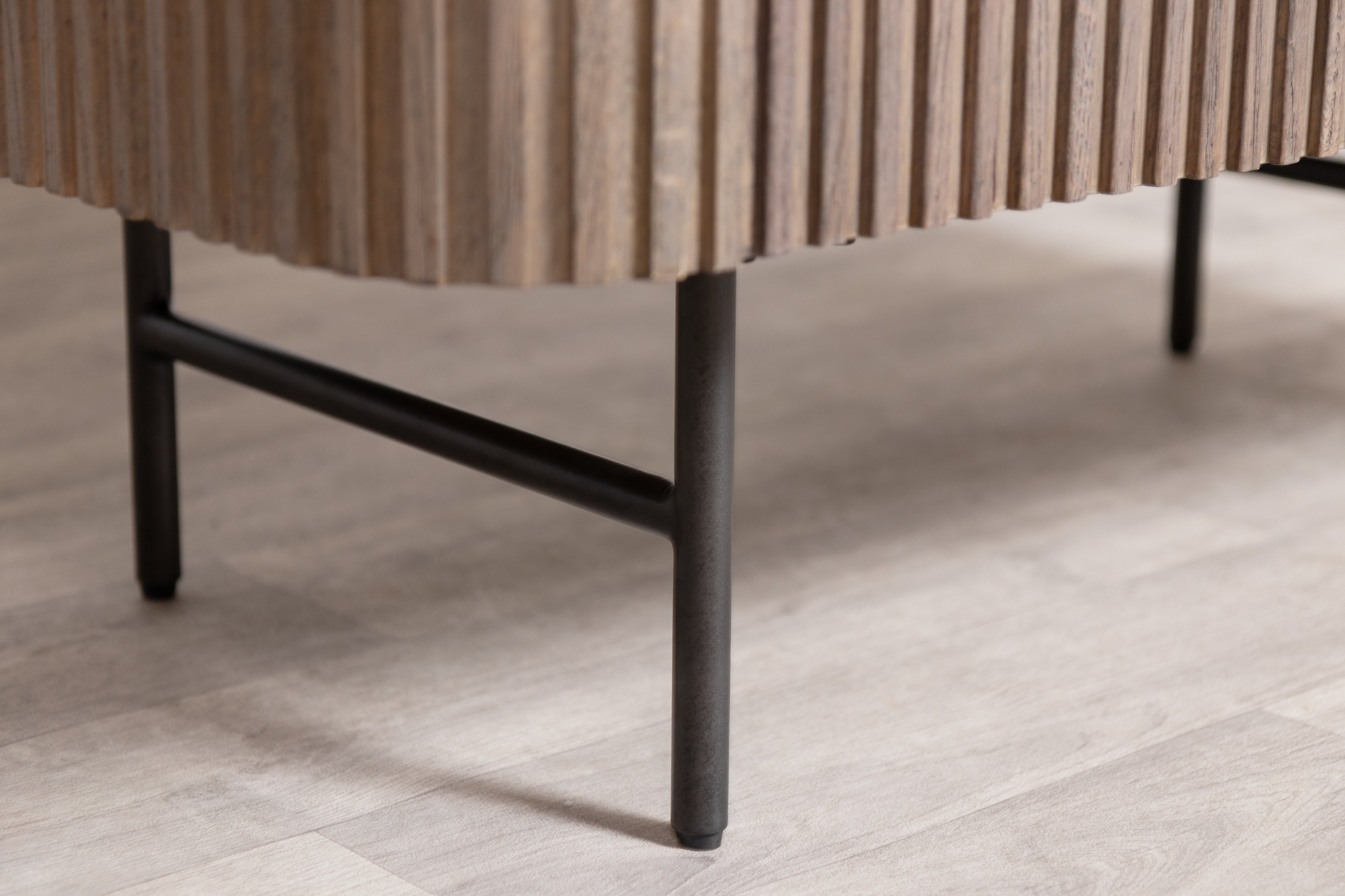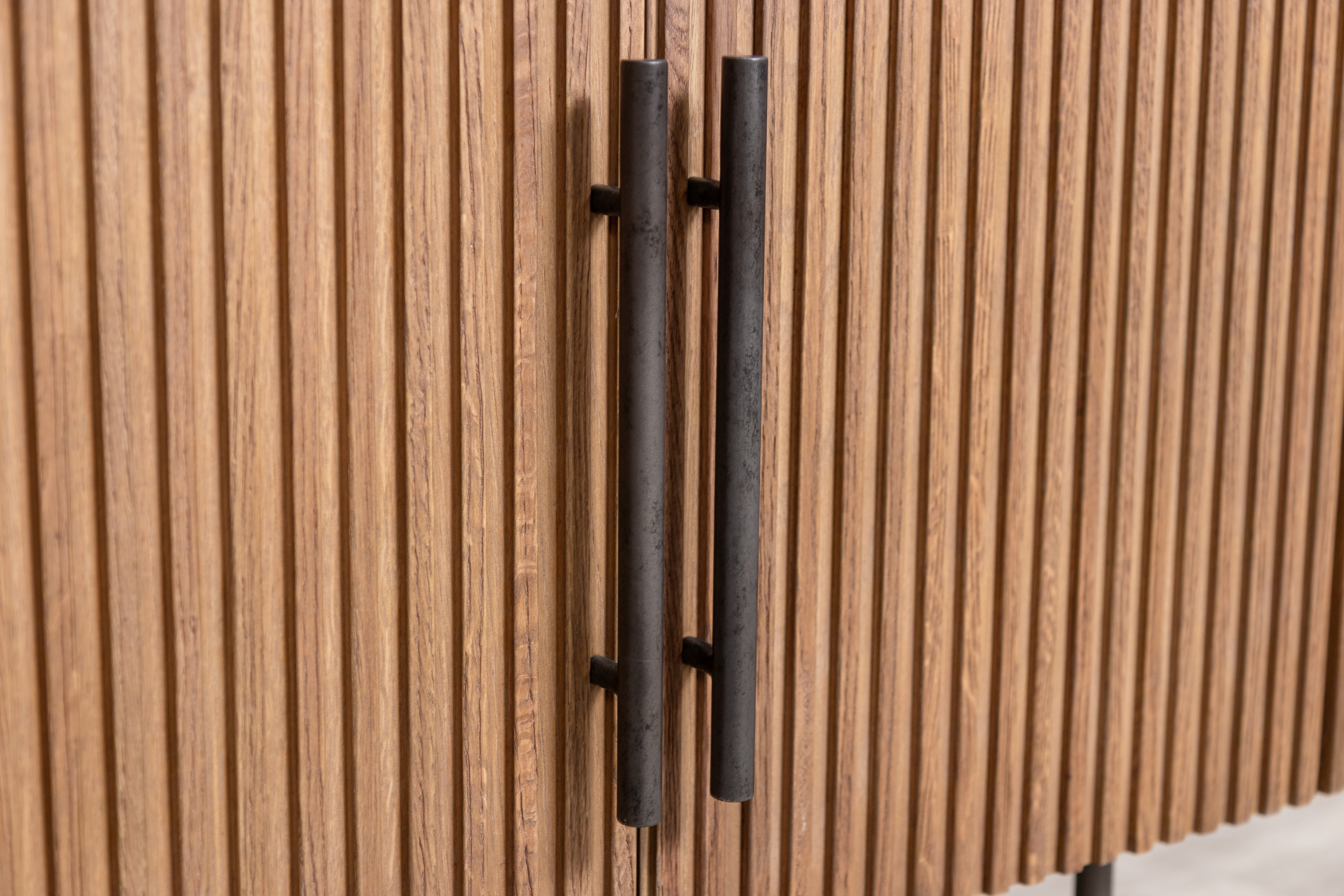 Offering extensive storage and a streamlined contemporary design, the Ashfield Ribbed Two Door Sideboard with Drawers brings a sophisticated edge to your home or commercial space. The two storage drawers above the four doors maximise your storage options while maintaining a clean and polished profile. Crafted from premium red oak with a distinctive ribbed pattern, black metal hardware, and soft closing hinges, the Ashfield fits perfectly into any space, whether a hallway, lounge, or bedroom.