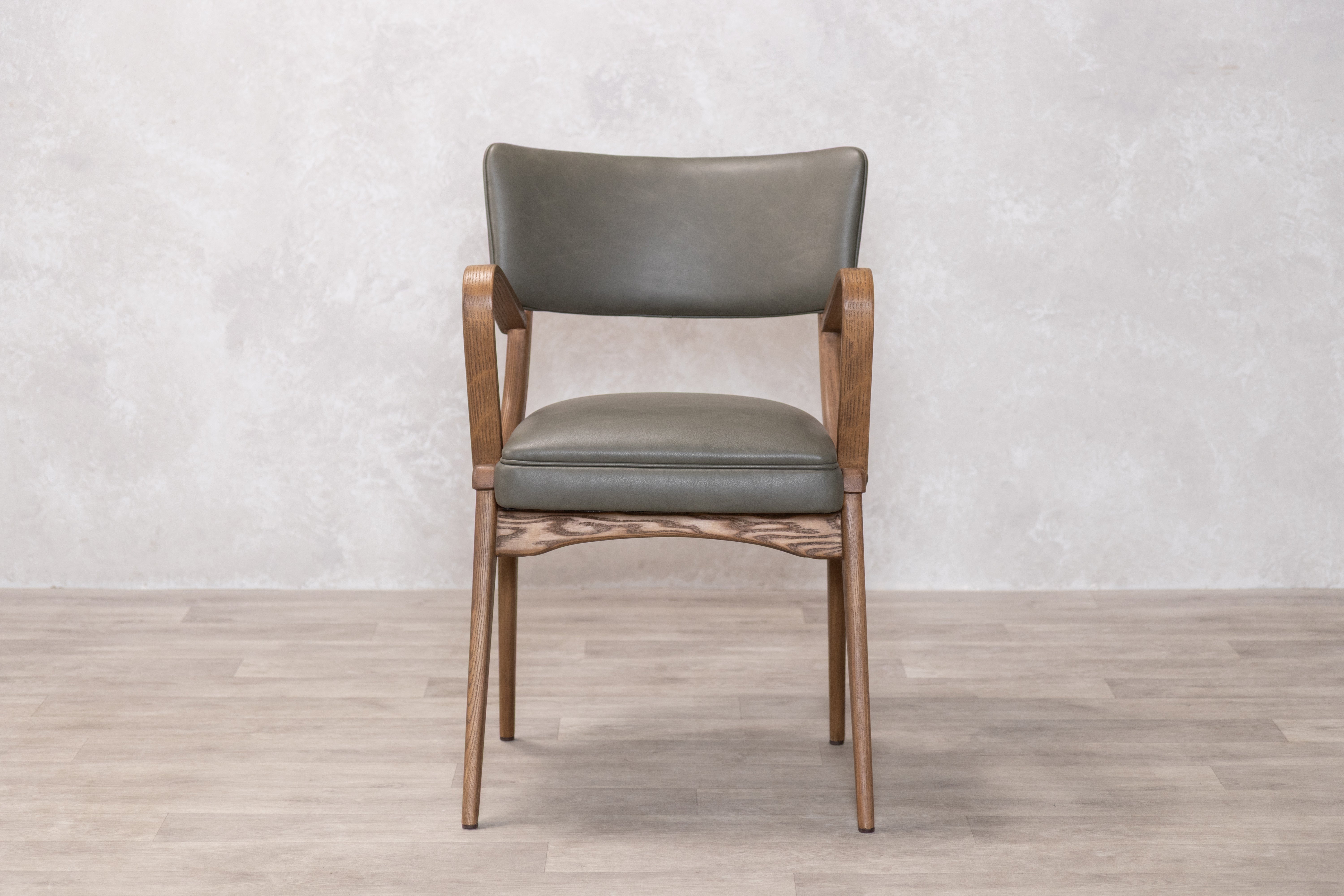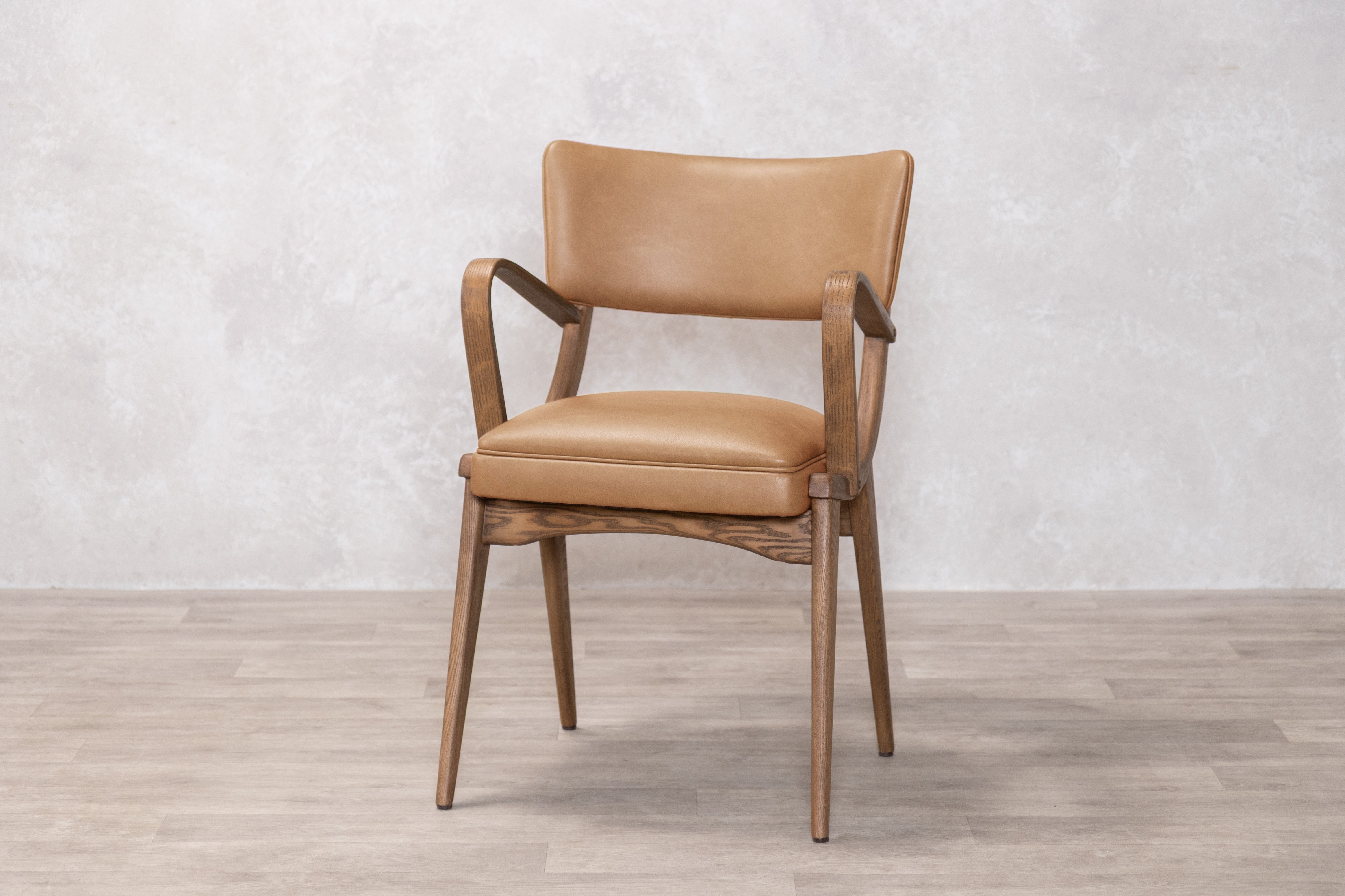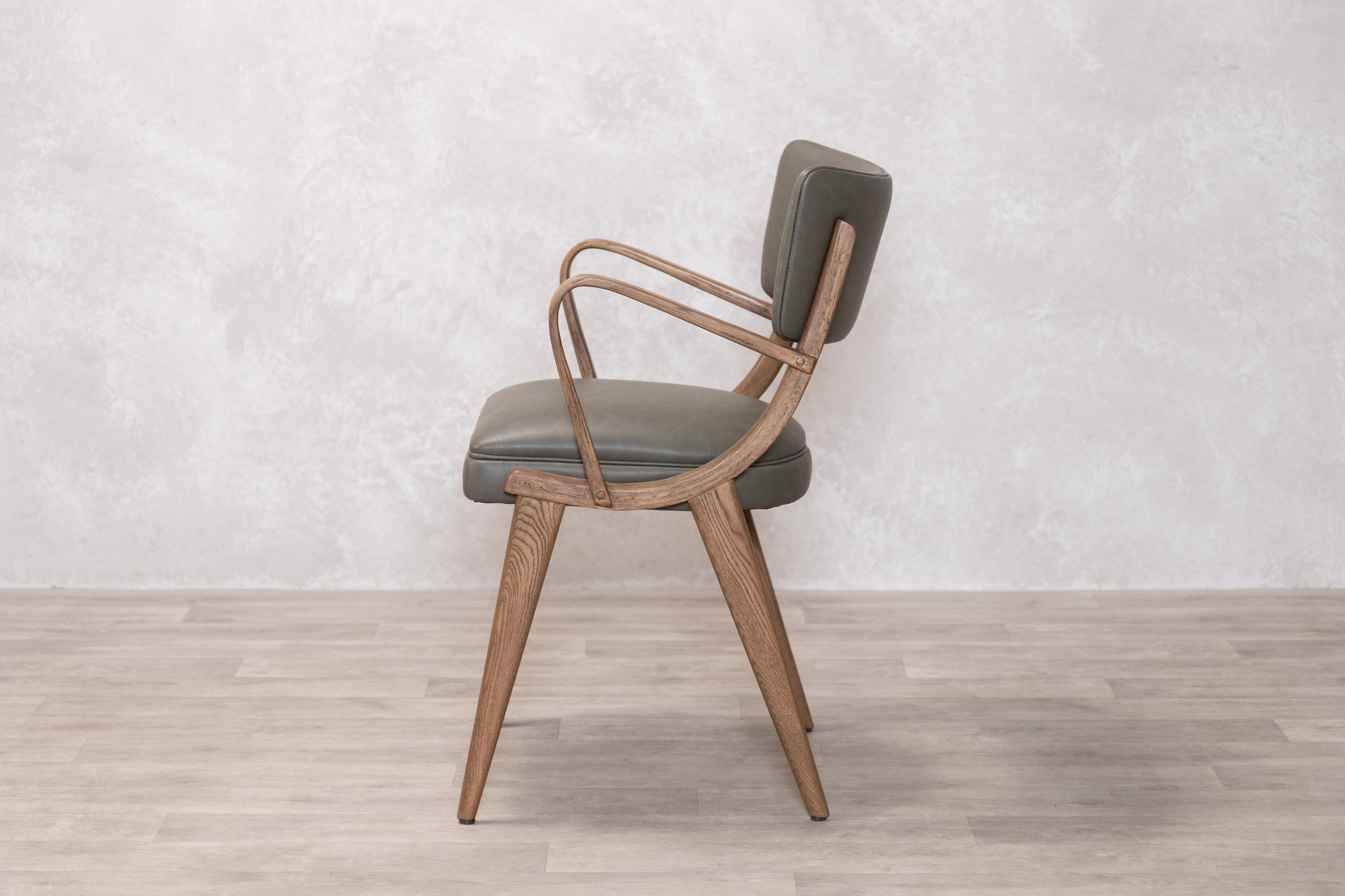 This distinctive dining chair features a structured silhouette with supportive armrests and a gently curved backrest, built on a solid rubberwood frame that provides natural durability and resistance to wear. The foam-padded seat ensures comfort during extended meals and gatherings, while the clean lines and mid-century inspired design work well in both traditional and contemporary dining spaces. Available in two PU finishes: Tan or Olive, the chair offers a practical and stylish seating solution for everyday dining.