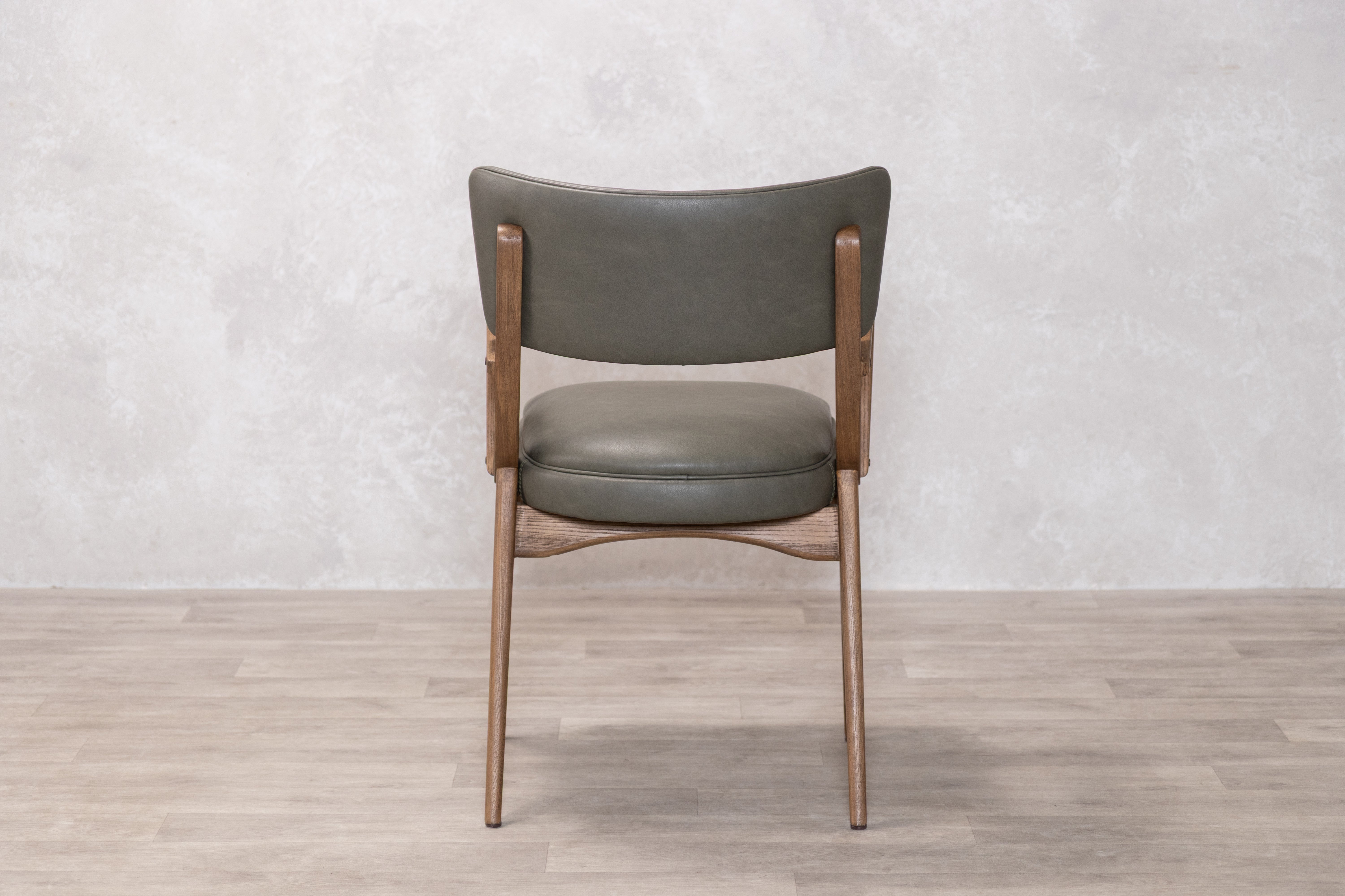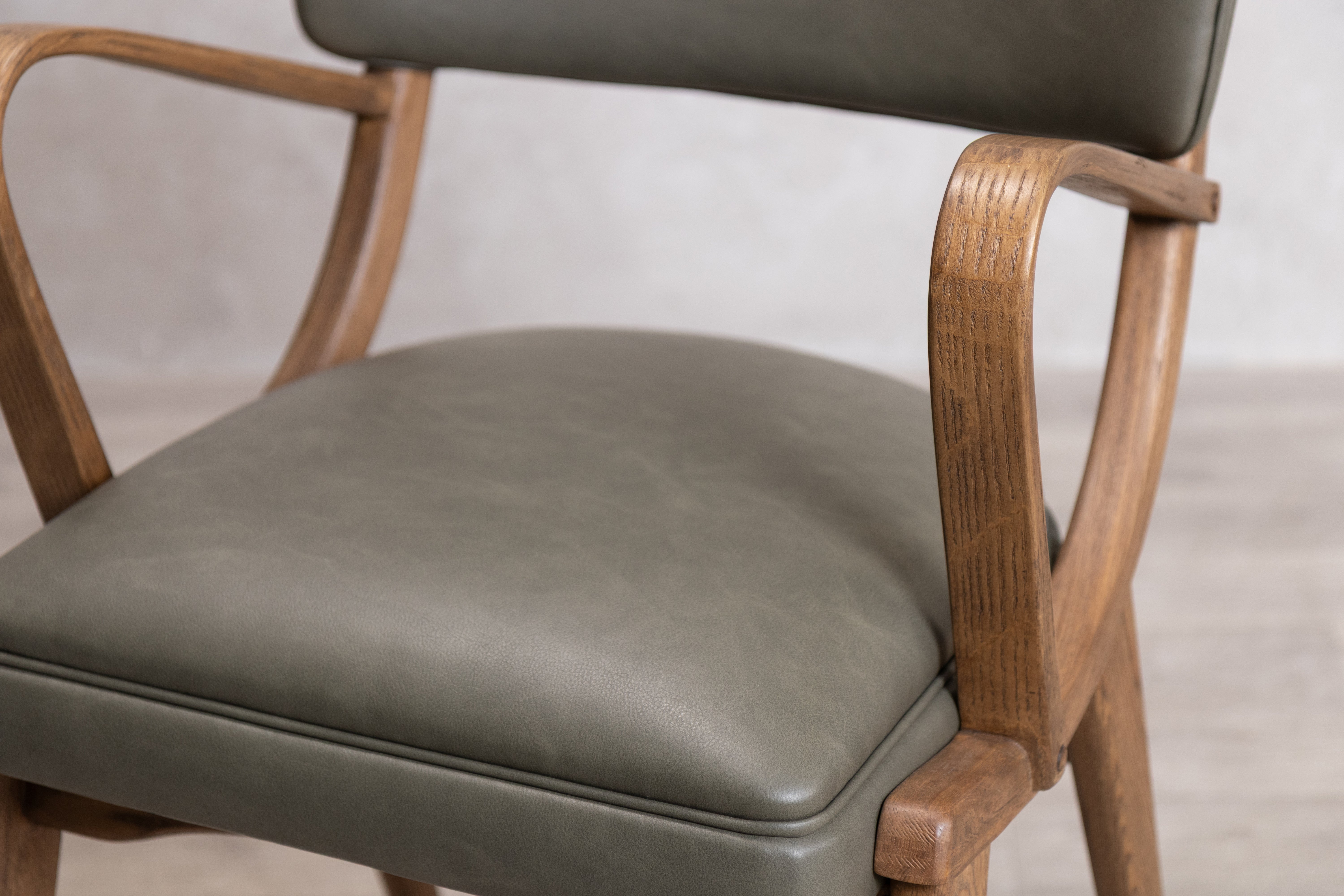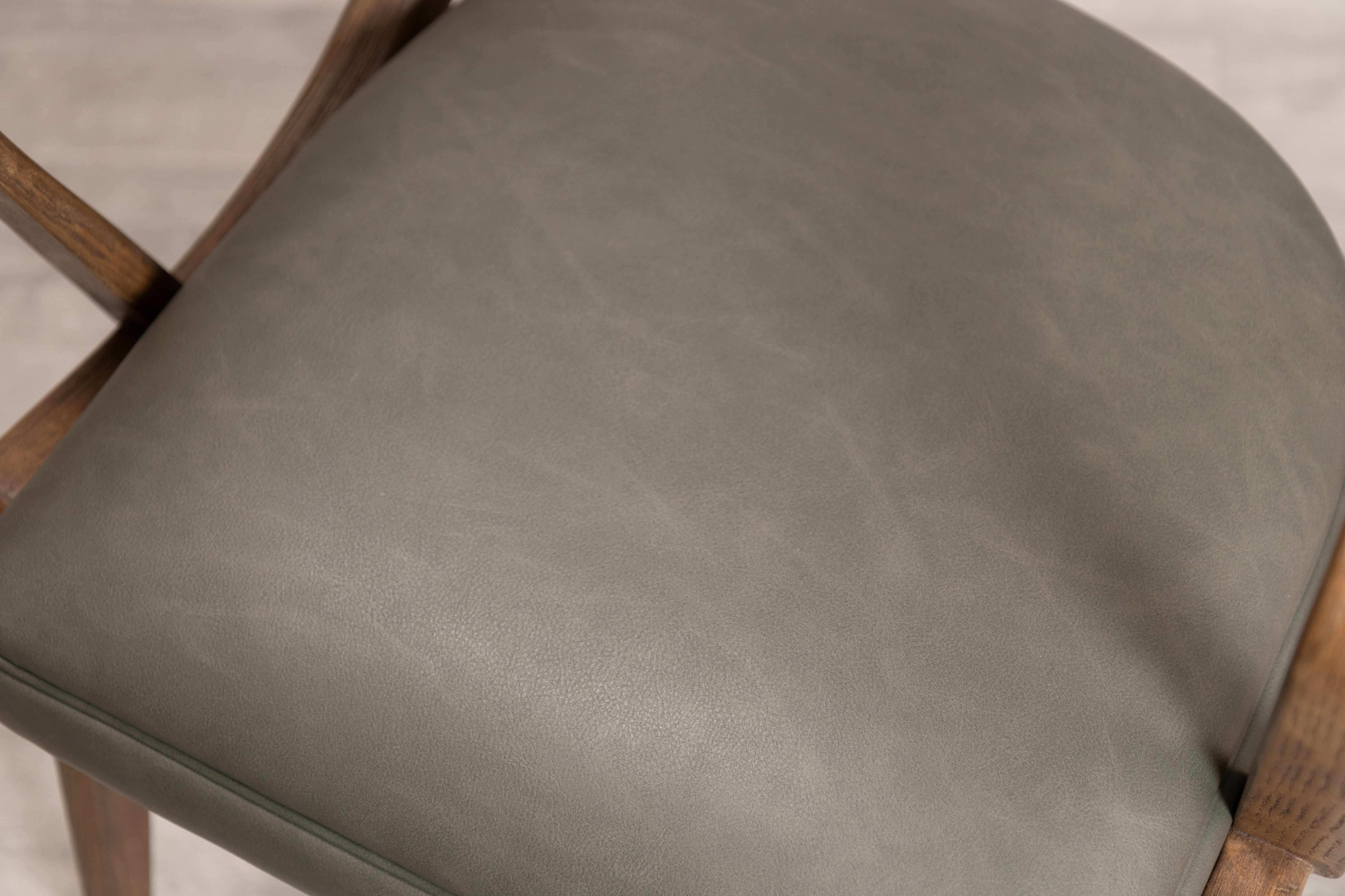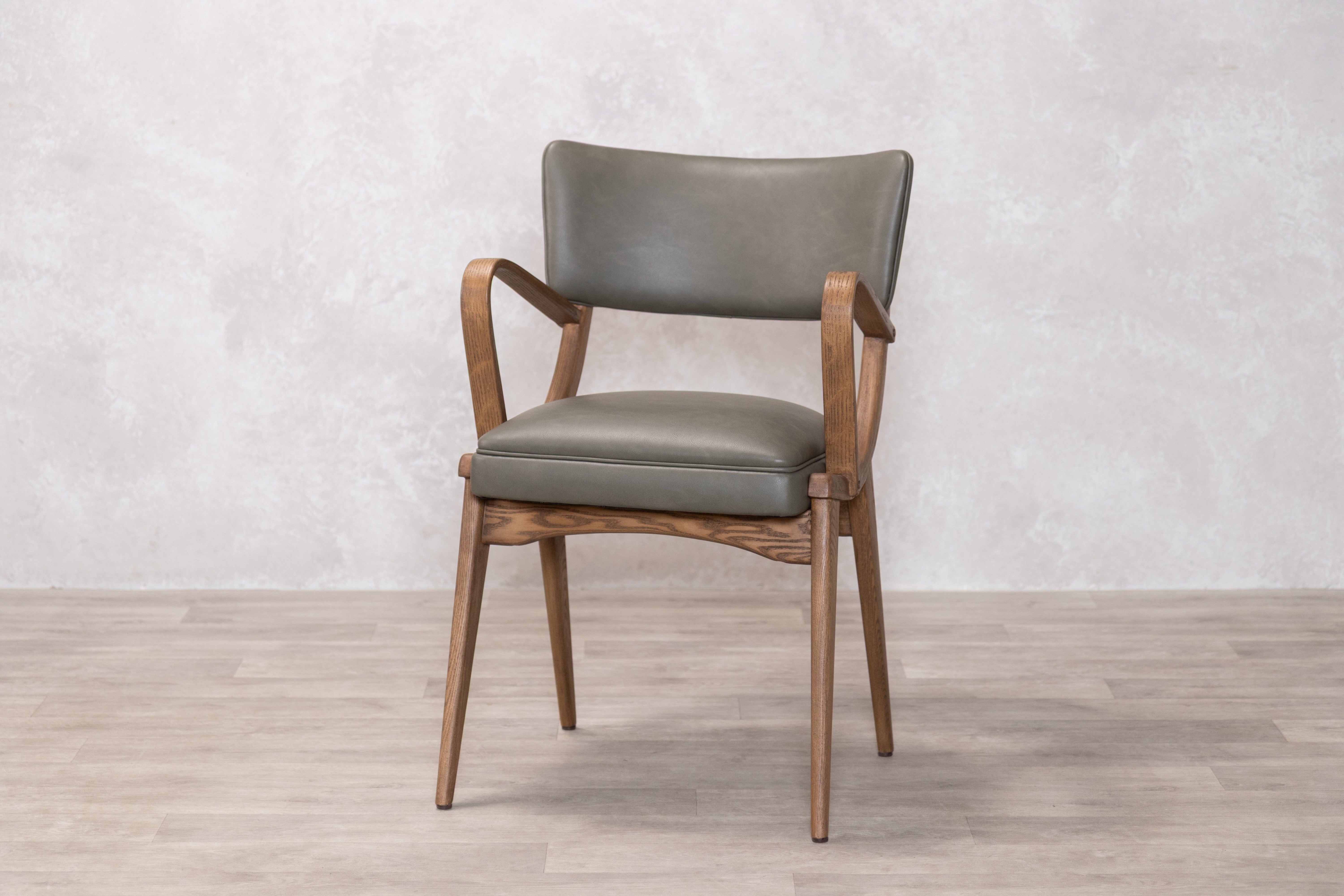 This distinctive dining chair features a structured silhouette with supportive armrests and a gently curved backrest, built on a solid rubberwood frame that provides natural durability and resistance to wear. The foam-padded seat ensures comfort during extended meals and gatherings, while the clean lines and mid-century inspired design work well in both traditional and contemporary dining spaces. Available in two PU finishes: Tan or Olive, the chair offers a practical and stylish seating solution for everyday dining.