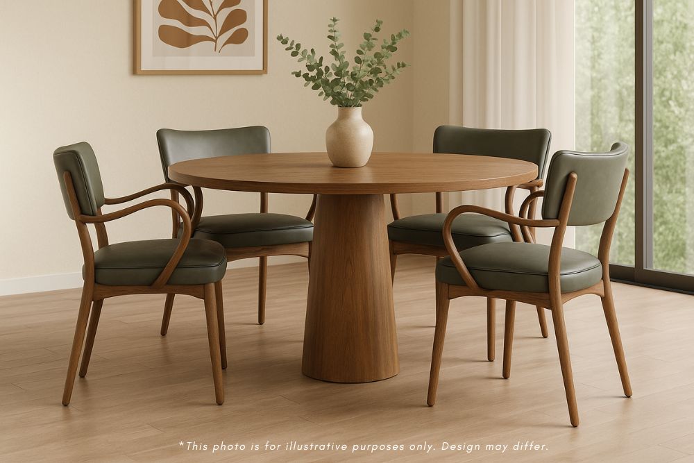 This distinctive dining chair features a structured silhouette with supportive armrests and a gently curved backrest, built on a solid ashwood frame that provides natural durability and resistance to wear. The foam-padded seat ensures comfort during extended meals and gatherings, while the clean lines and mid-century inspired design work well in both traditional and contemporary dining spaces. Available in two PU finishes: Tan or Olive, the chair offers a practical and stylish seating solution for everyday dining.