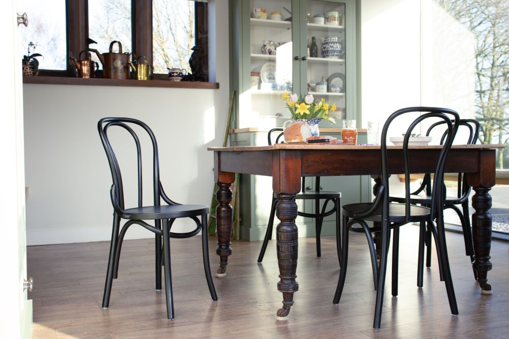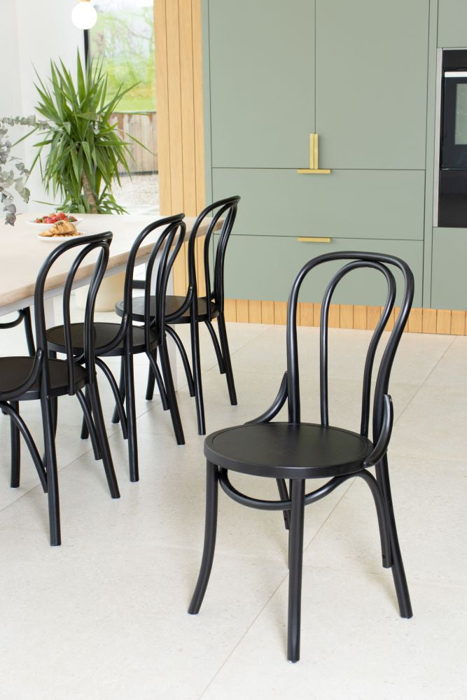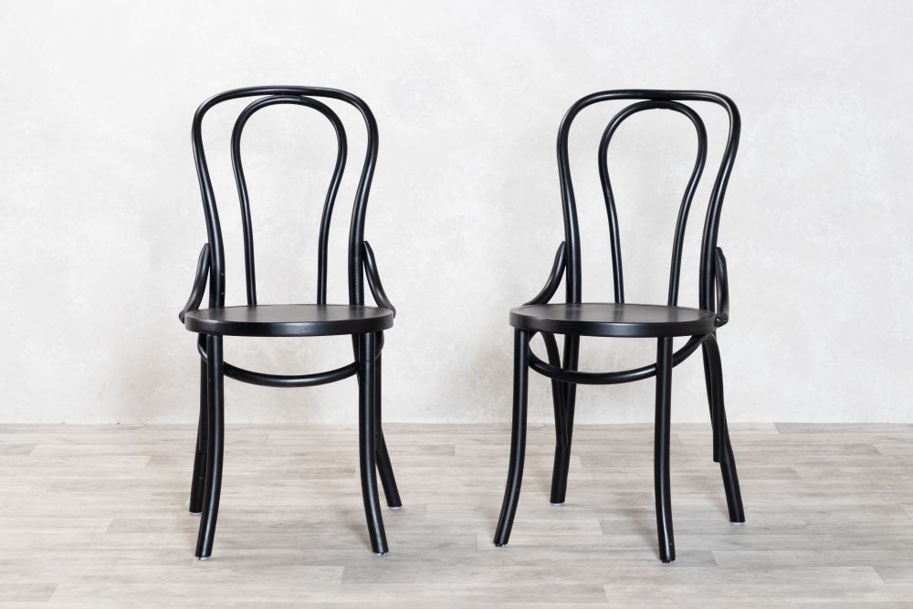 The chair frames are made from high-quality bentwood, giving them a unique and durable design. The seats are available in black or dark wood, and can be easily wiped clean, making them ideal for busy cafes and restaurants.