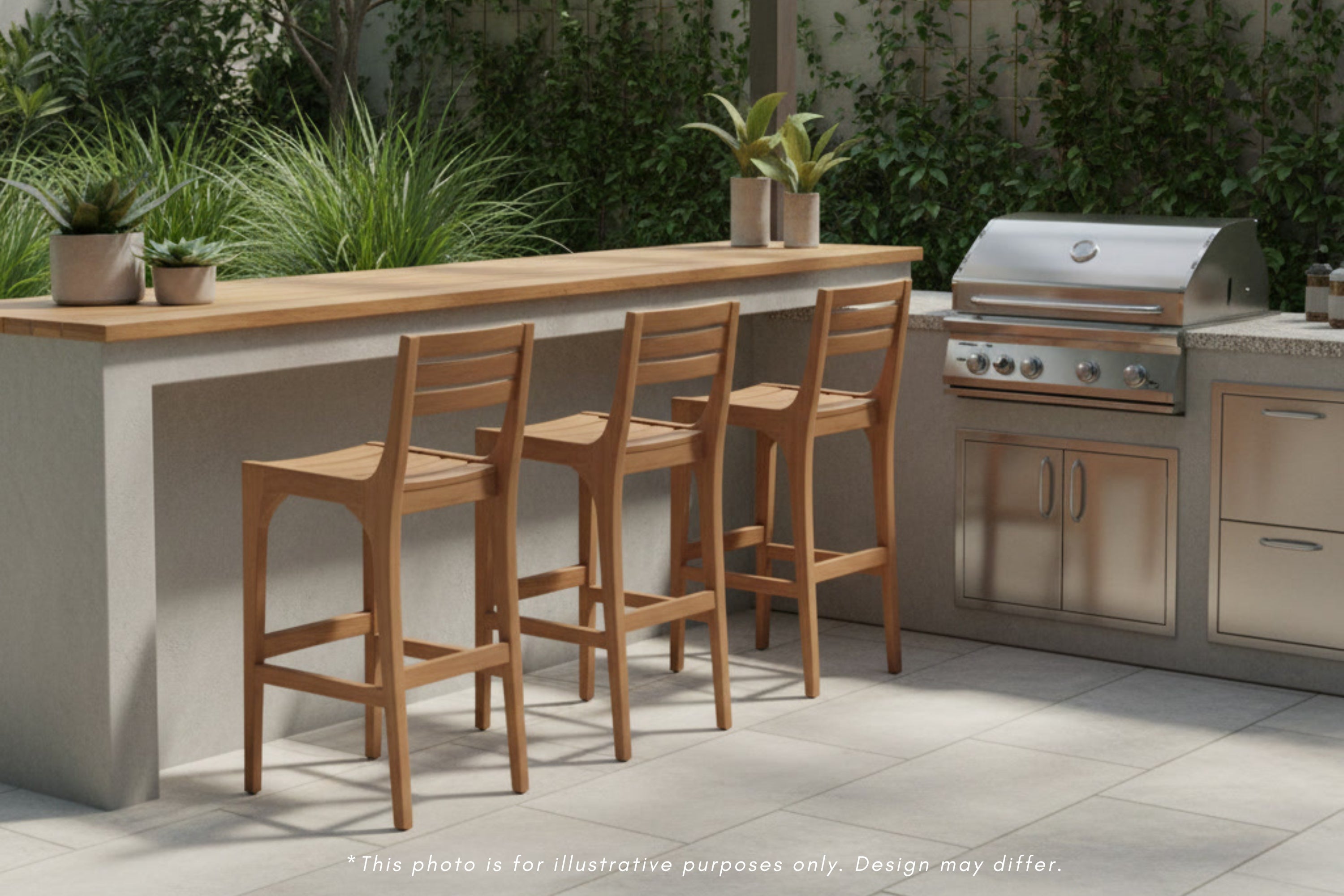 The Bistro Bar Stool is a practical and versatile seating solution crafted from Indonesian golden Teakwood. The natural timber showcases the beautiful grain and warm honey tones characteristic of premium teak, bringing organic warmth to outdoor entertaining spaces. The slatted backrest provides comfortable support while allowing air circulation, making this bar stool ideal for alfresco dining, outdoor kitchens, and garden bars. A sturdy footrest offers practical support and enhances comfort during extended use.