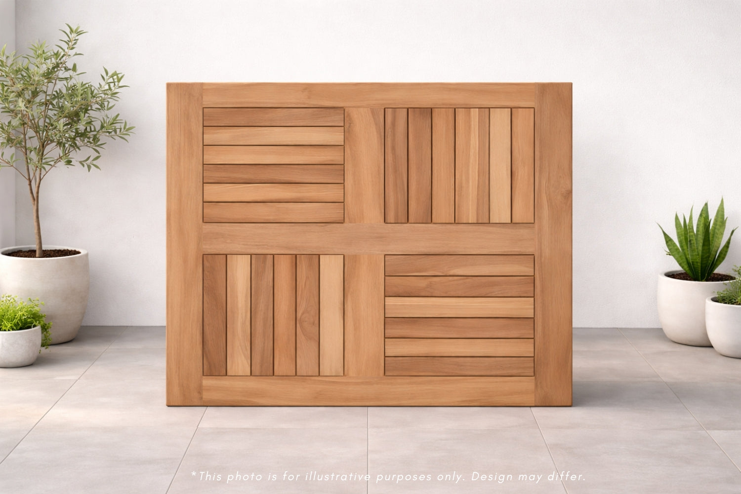 The Bistro Square Table Top is a practical and versatile piece crafted from Indonesian golden Teakwood. The natural timber showcases the beautiful grain and warm honey tones characteristic of premium teak, bringing organic warmth to outdoor entertaining spaces. The distinctive slatted design creates a striking visual pattern with alternating orientations, adding textural interest and allowing water drainage for outdoor use. The compact square shape makes this table top ideal for bistro-style dining, balconies, or intimate garden settings.