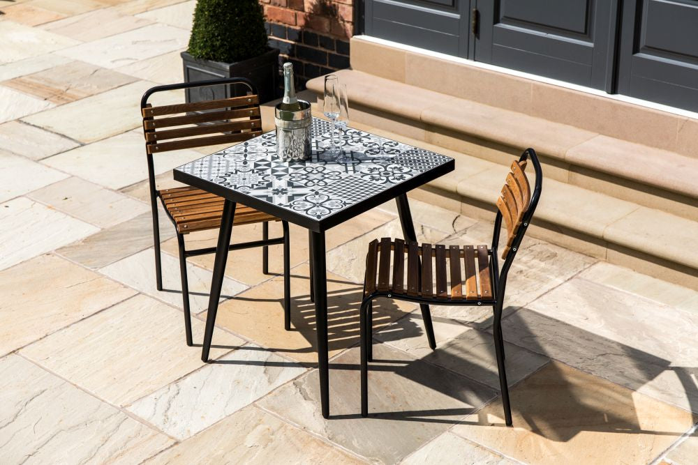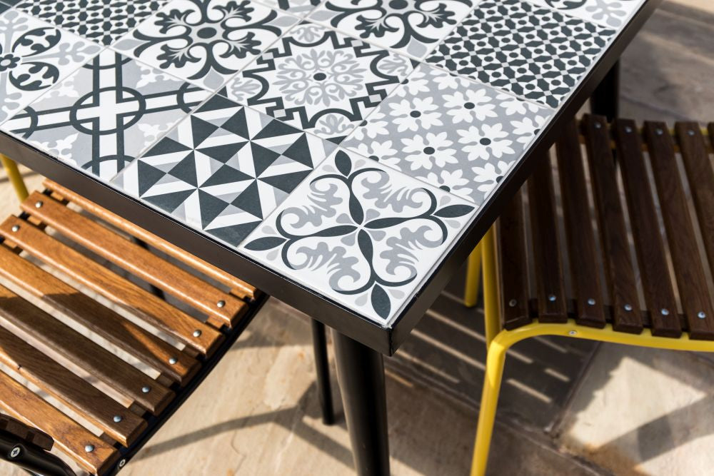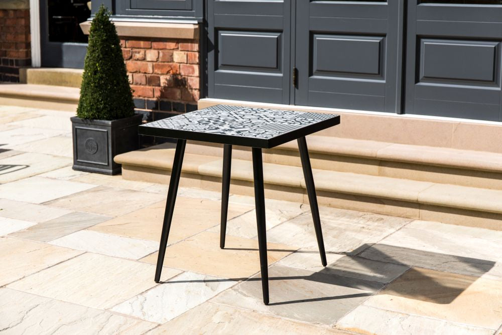 Our Ceramic Top Café Table with Metal Legs has an unusual, quirky mosaic design on each of the tiles.