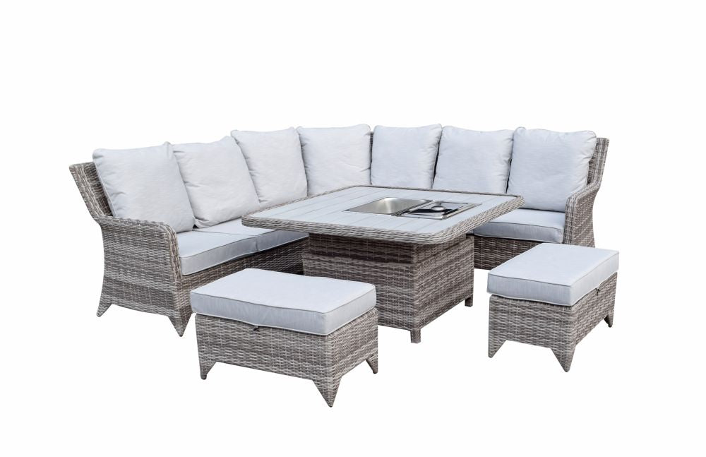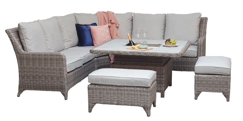 Get your garden summer ready with the Charlecote Outdoor Corner Dining Set with Adjustable Table. The set includes a corner sofa, two benches, and a height adjustable table to see you from breakfast to evening entertaining, complete with ice bucket and lid to keep your beverages nice and chilled in the warm summer evenings.