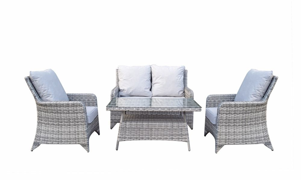 Consisting of a two seater sofa, two armchairs and a glass top coffee table, you can enjoy those summer mornings with a cup of tea on the durable, powder coated aluminium frame and nylon weave.