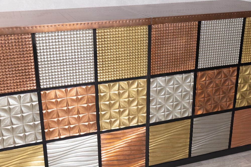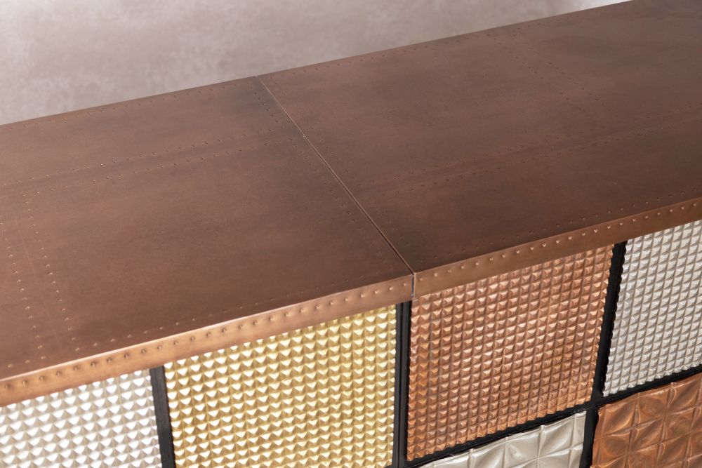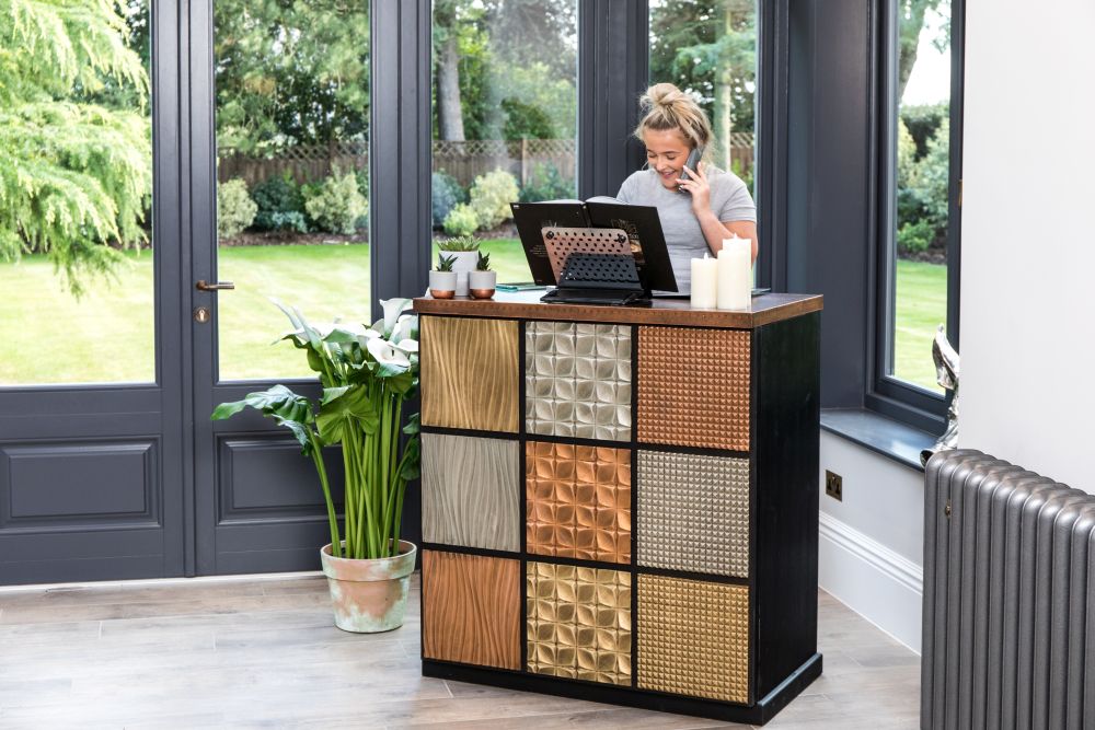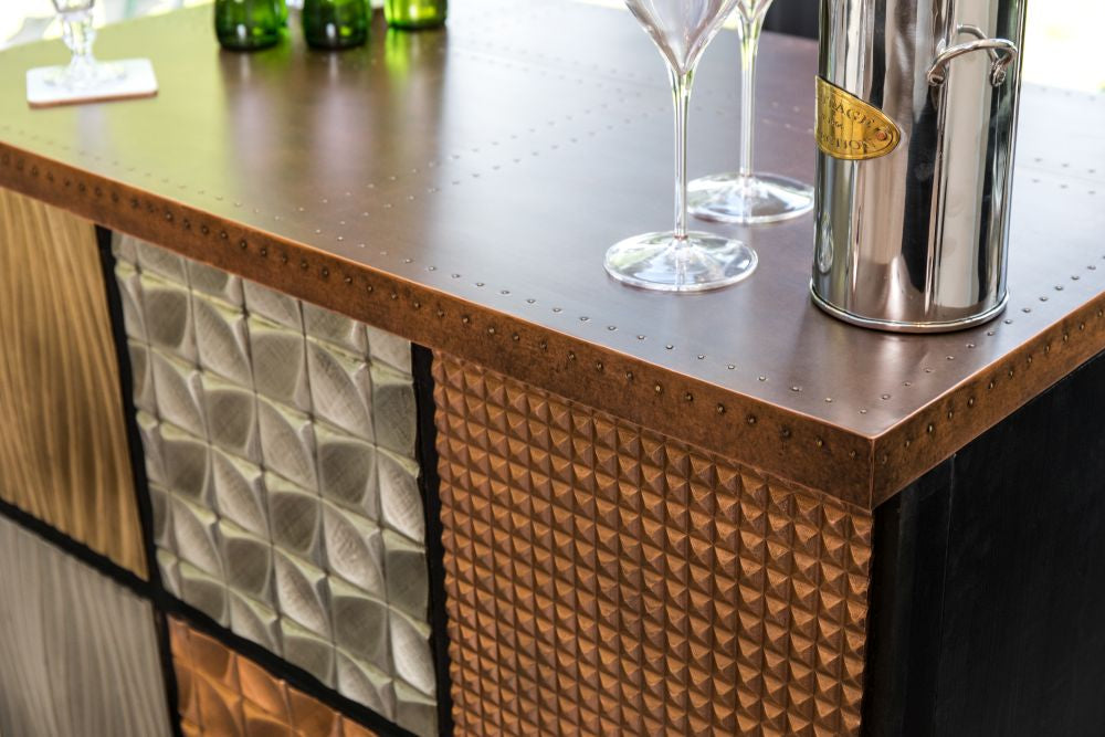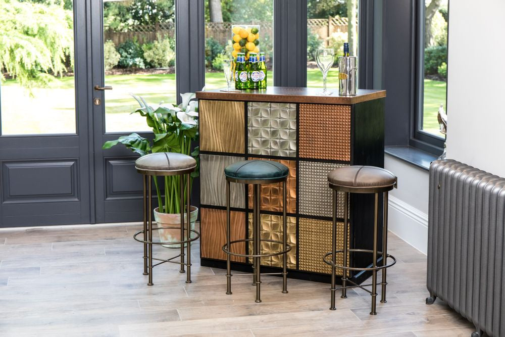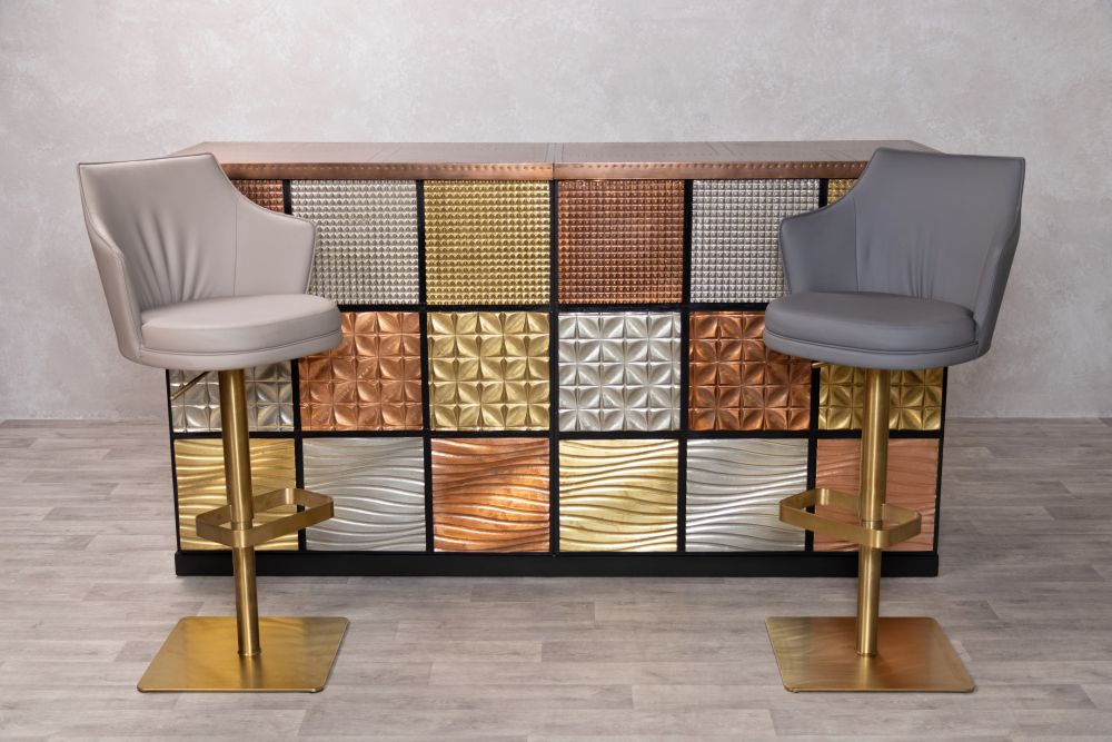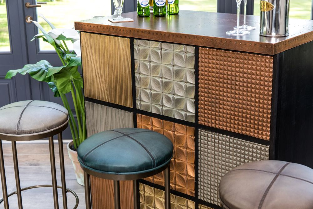 A fantastic feature for a swanky front of house, reception or your very own home bar, our Bespoke Bar can be tailored to suit your space, you can choose the length of your bar. With shelves for storage at the back and brass, copper and zinc panels to the front, and a choice of top, upgrade your décor with this lavish bar.