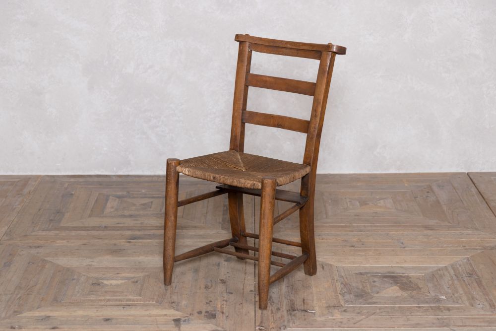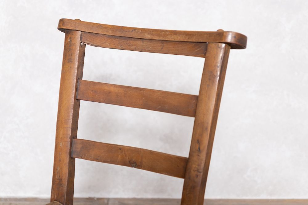 These traditional chapel chairs carry the dignified charm of old church chairs, featuring sturdy wooden construction and classic ladder-back design. Each piece showcases a rich brown finish and original rush seating, though some areas of the rush seats show natural wear from their years of use. The timeless silhouette and simple, honest craftsmanship make these chairs an authentic piece of heritage furniture, with their age-earned patina telling stories of their past life in chapel settings.