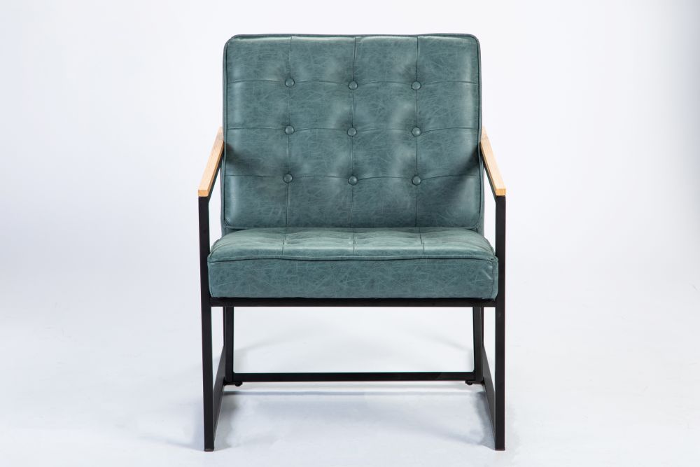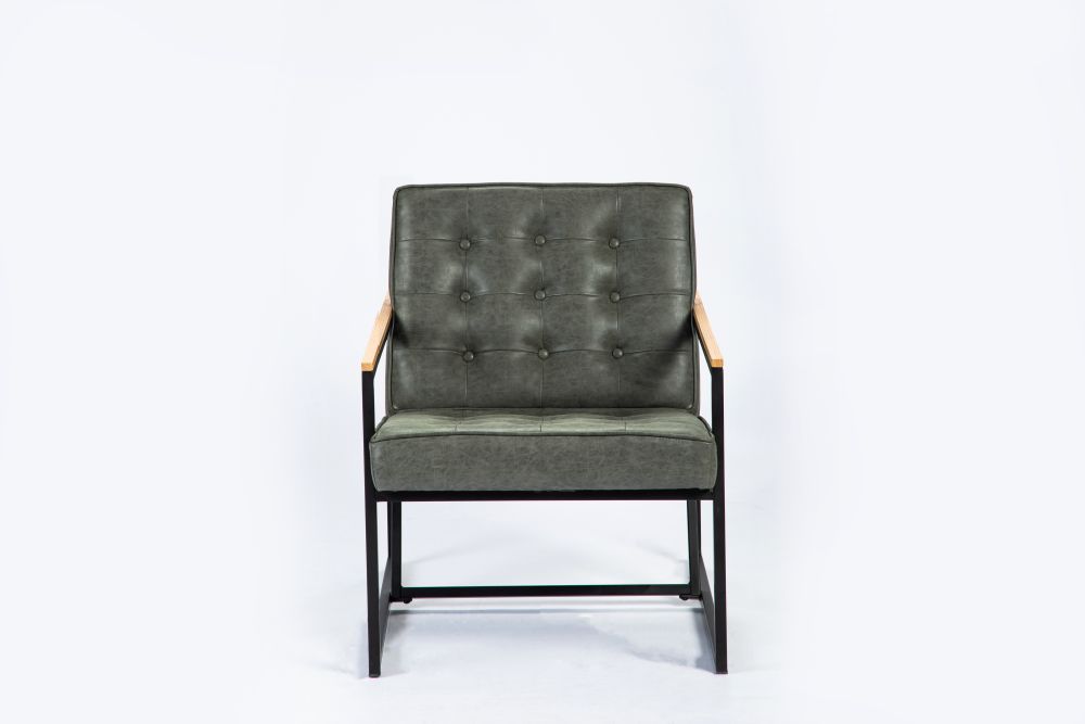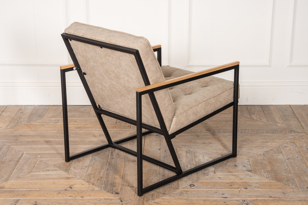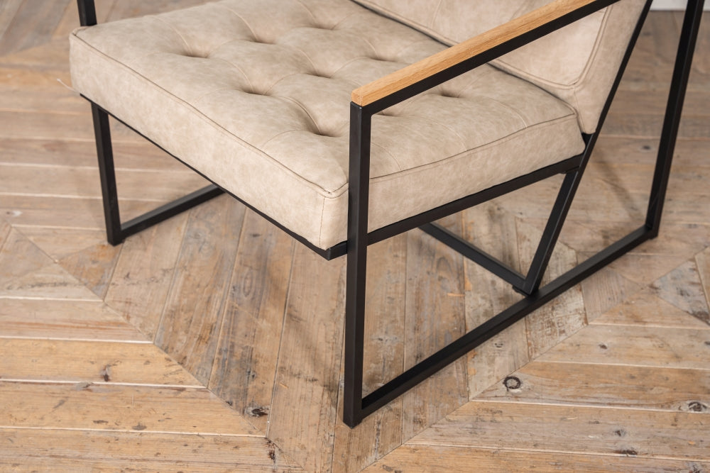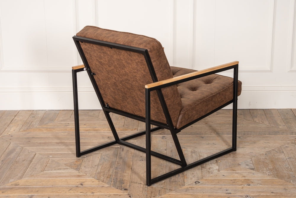 Based on an early 70s design, the Denver has a simple, black metal frame, faux leather upholstery and an oak top to the arms.