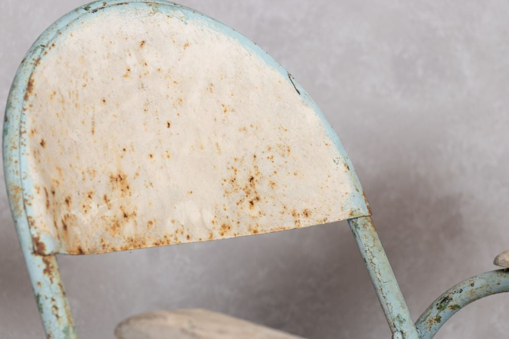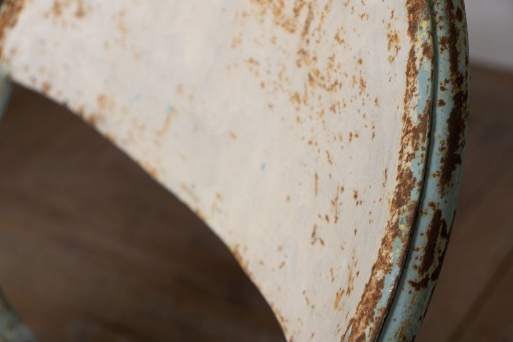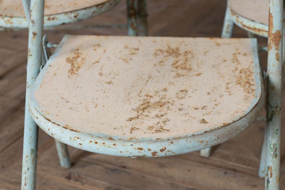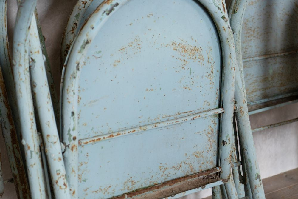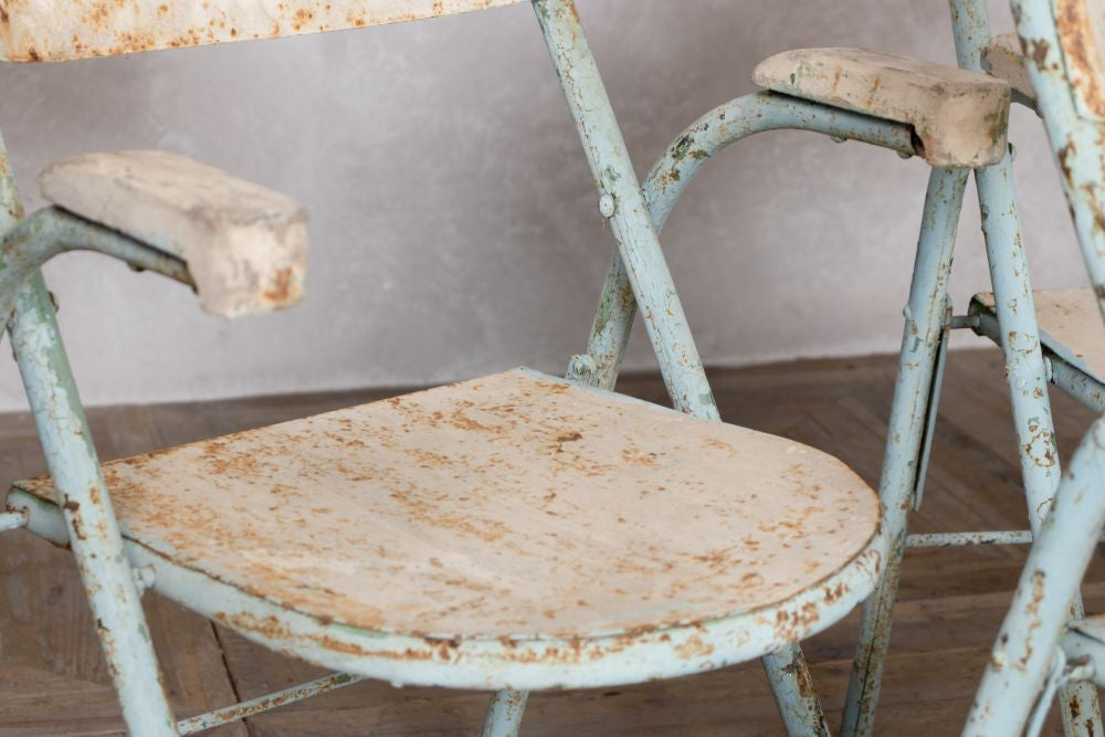 These 1950 French Styled Vintage Folding Chairs will be the next classic statement to your café, restaurant, or bistro. These chairs would be perfect for vintage and retro inspired interiors as they have original light blue and white paint that has a distressed appearance that only enhances their authentic rustic character. All chairs can easily fold to be stacked away when they’re not in use.