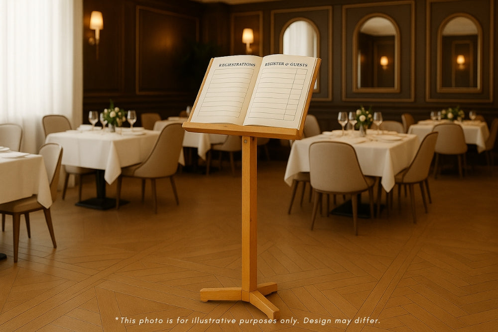 This handsome beech lectern features a classic design with clean lines and traditional styling. The piece features a perfectly angled reading surface supported by elegant columns and a sturdy tiered base. The wood finish and timeless design make this a sophisticated piece of furniture. This lectern is perfect for various commercial spaces such as receptions or front-of-house areas, serving as both a functional reading stand and a decorative accent. The slanted top provides excellent support for books, notepads, or iPads, making it both practical and stylish for any interior.