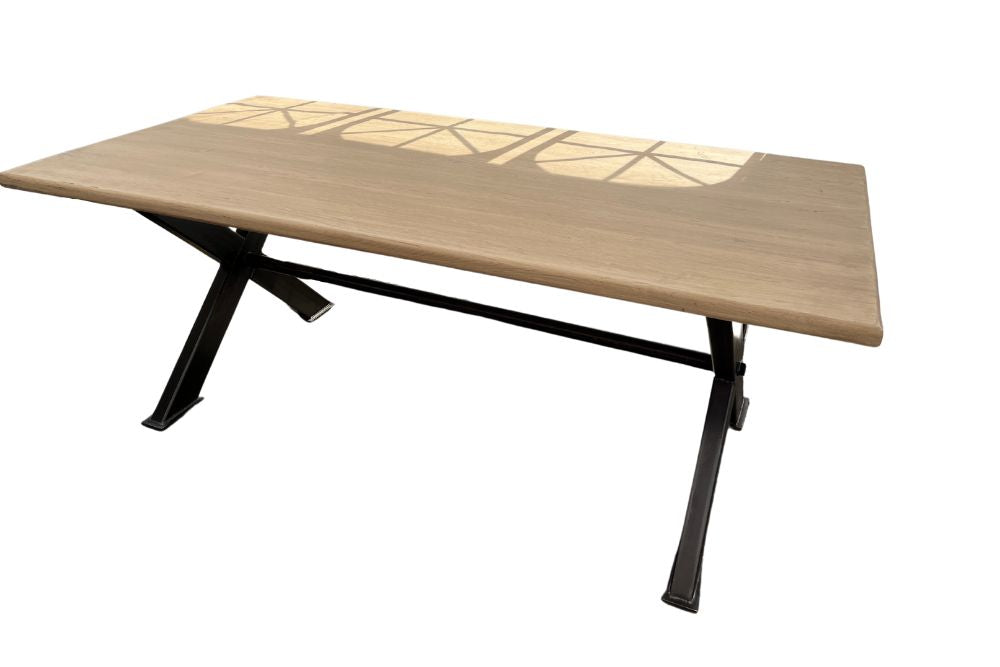 In a size of 200cm x 100cm, this table features a solid steel X-frame base and and contrasting light oiled pine table top.
