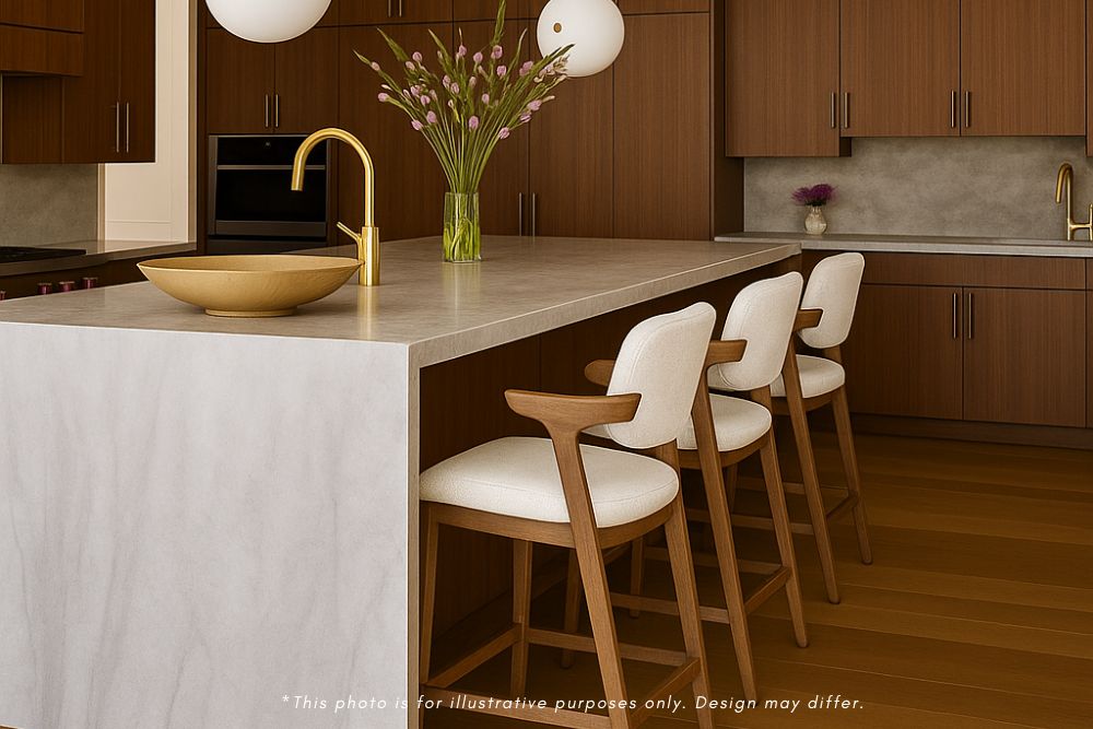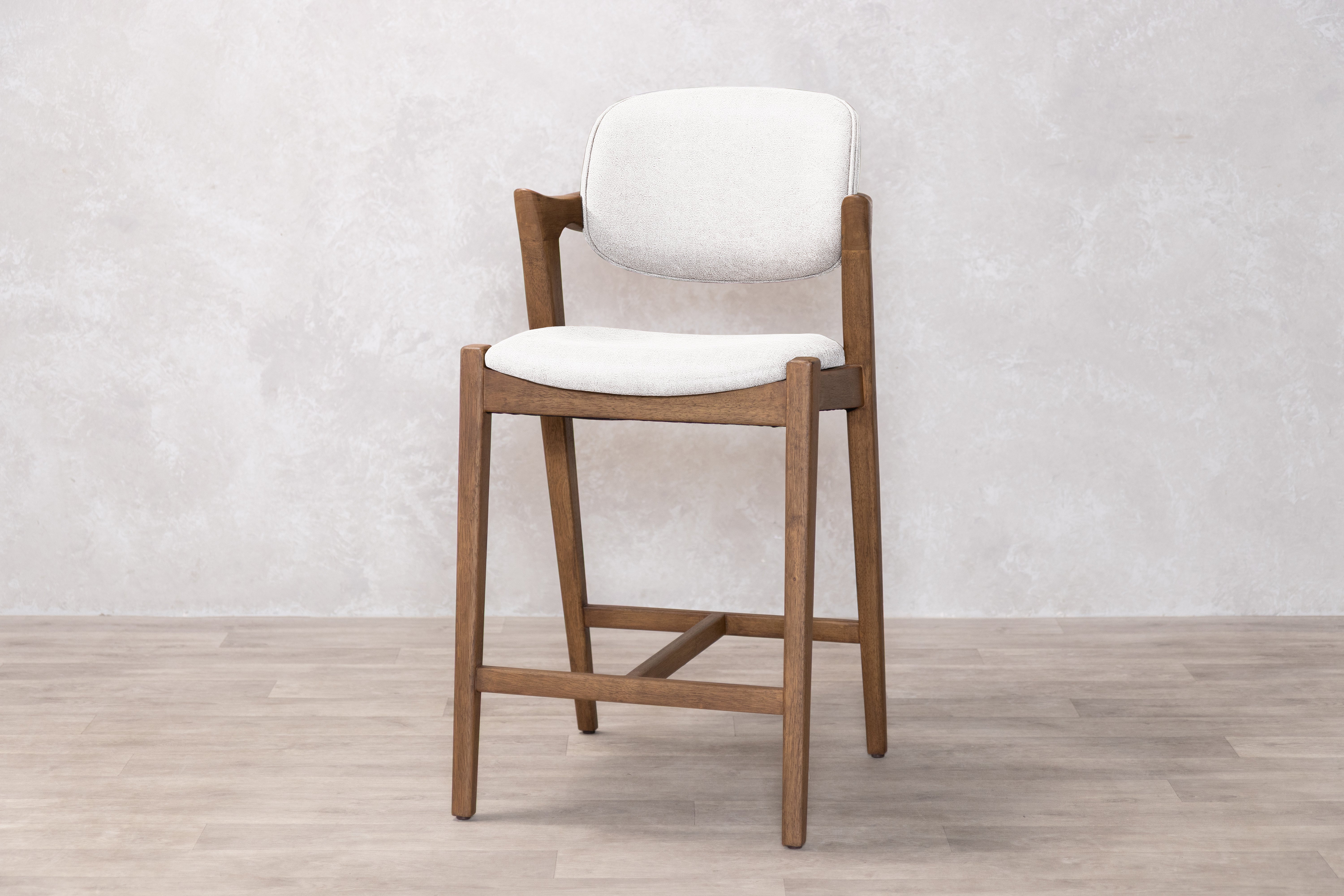 The Hampton Bar Stool brings the same graceful silhouette and supportive armrests of the dining chair to elevated seating. Crafted from solid hardwood with angled legs and a flowing backrest, this stool features clean lines and a modern contemporary design that works beautifully at kitchen islands and breakfast bars. The foam-padded seat is upholstered in a neutral oatmeal fabric that provides comfortable seating with natural texture and warmth. Available in both bar and counter heights to suit your space, this versatile stool complements a range of interior styles from minimalist to Scandinavian-inspired settings.