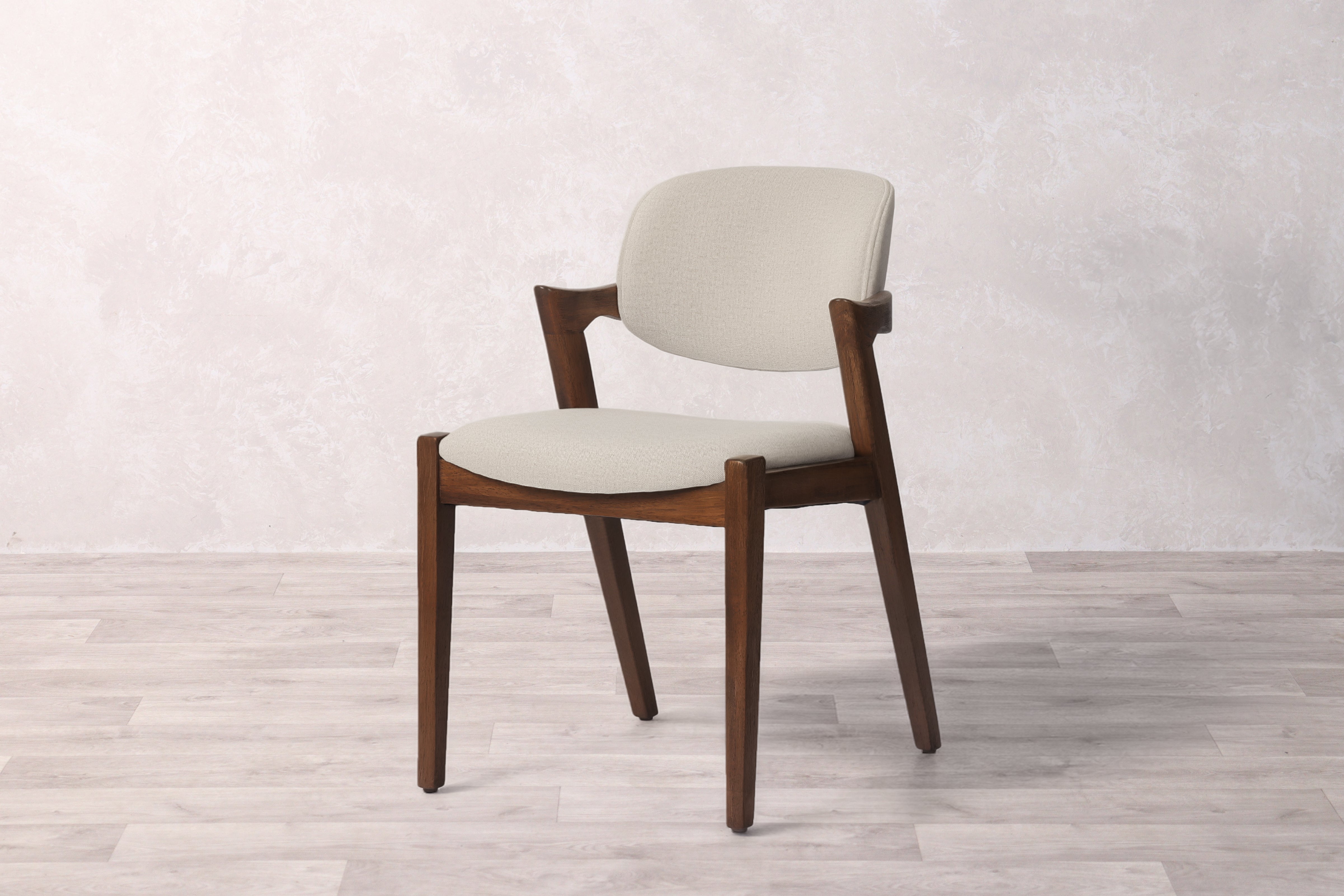 The Hampton Dining Chair showcases a graceful silhouette with supportive armrests that frame its streamlined form. Crafted from solid hardwood, the chair's angled legs and flowing backrest create a modern contemporary aesthetic with clean lines throughout. The foam-padded seat is upholstered in a neutral oatmeal fabric that brings warmth and texture to any dining space, while providing comfortable seating for everyday meals and entertaining. This versatile piece works beautifully in a range of interior styles, from minimalist to Scandinavian-inspired settings.