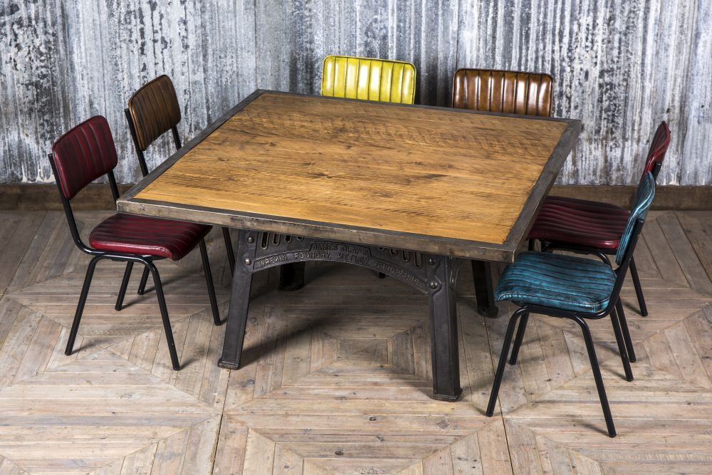 This table is full of industrial character and would suit an urban or industrial style interior. The company and location stamps on the base give a sense of this table’s past, making it a great talking point. Comfortable leather chairs would provide a contrast to the solid appearance of the table, or you could pair it with vintage seating to stay in keeping with its style.