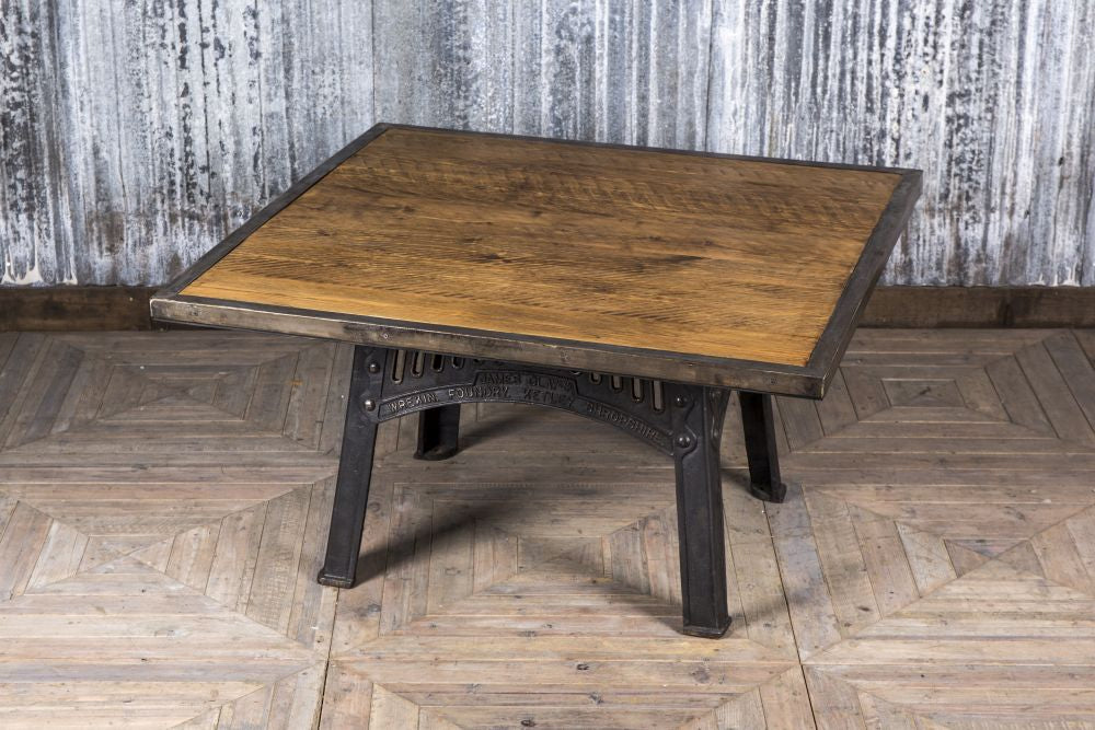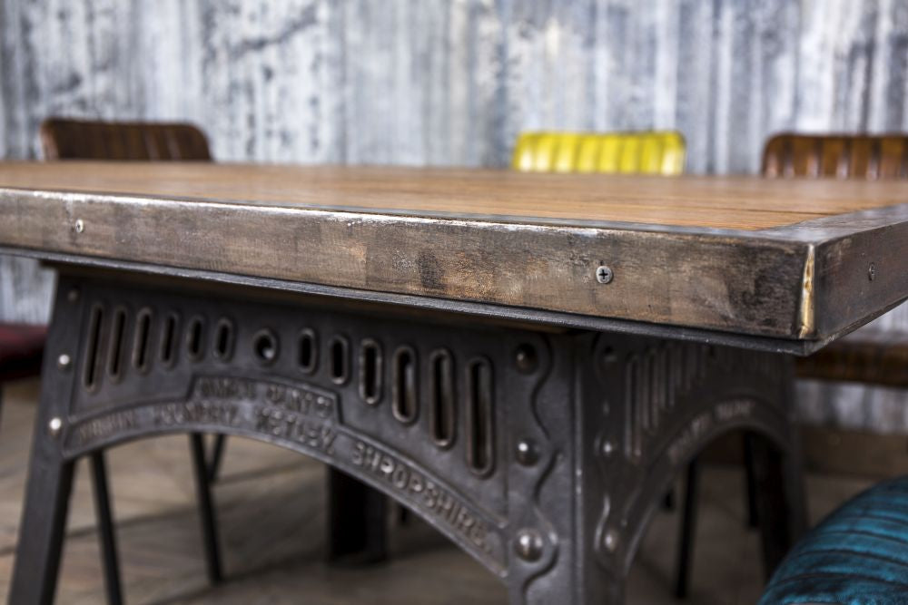The table features a cast iron base with decorative arches on each side. The arches are designed with rounded slats, exposed bolts and printed with the words ‘JAMES CLAY LTD, WREKIN, FOUNDRY, KETLEY, SHROPSHIRE.’ The table top is made from reclaimed timber with metal edging.