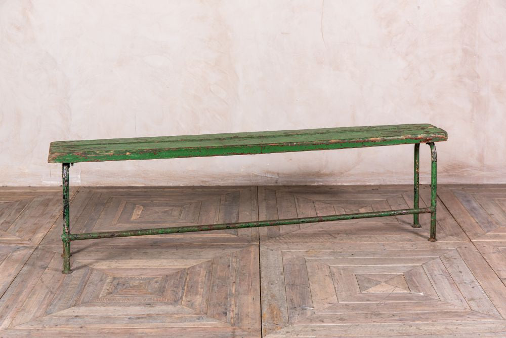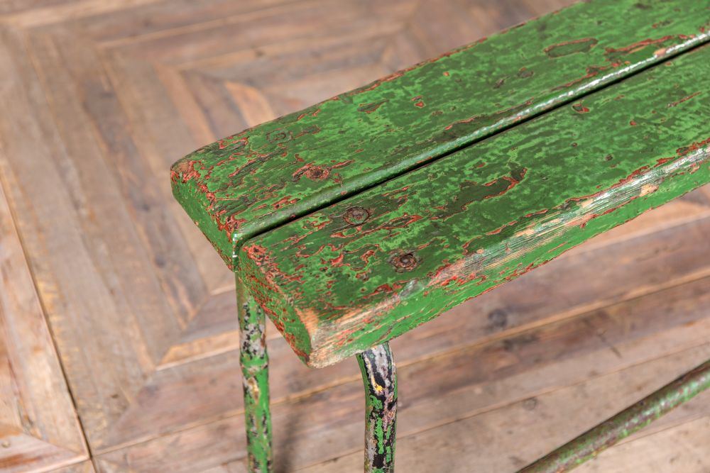 The base of the bench is metal, and the seat is wooden. Areas of the green paintwork has worn away over the years, adding to the bench’s industrial appearance.