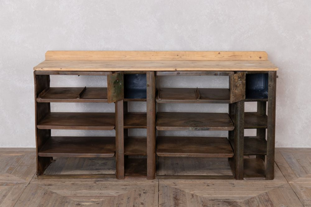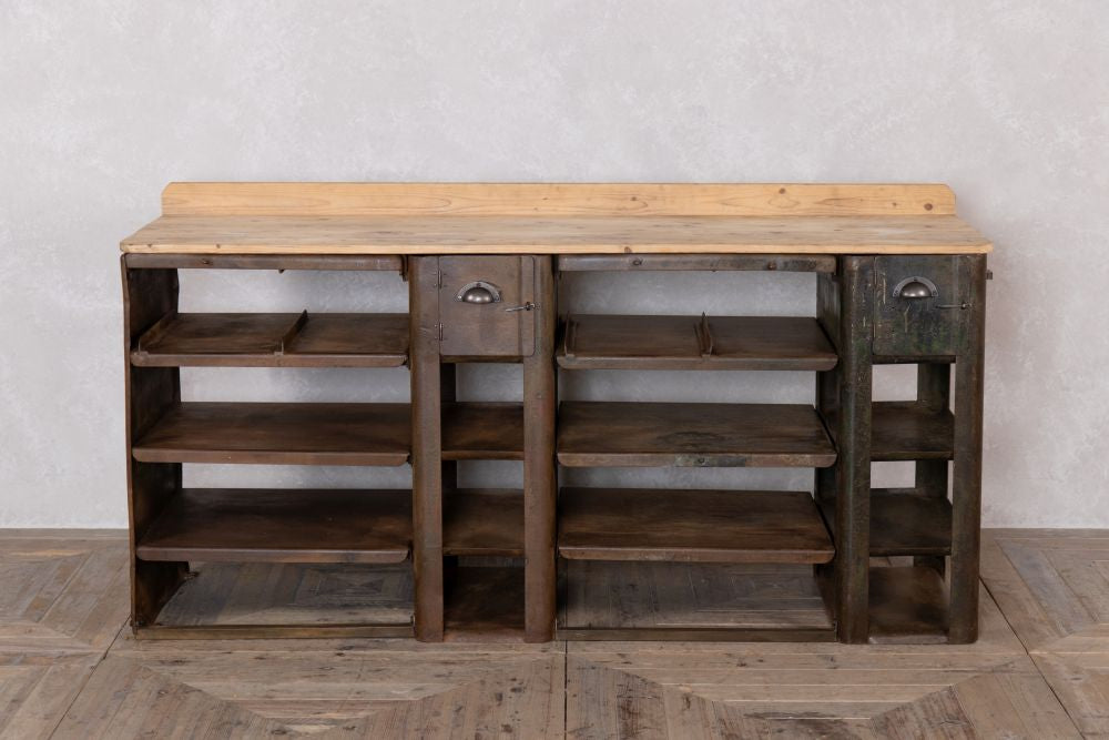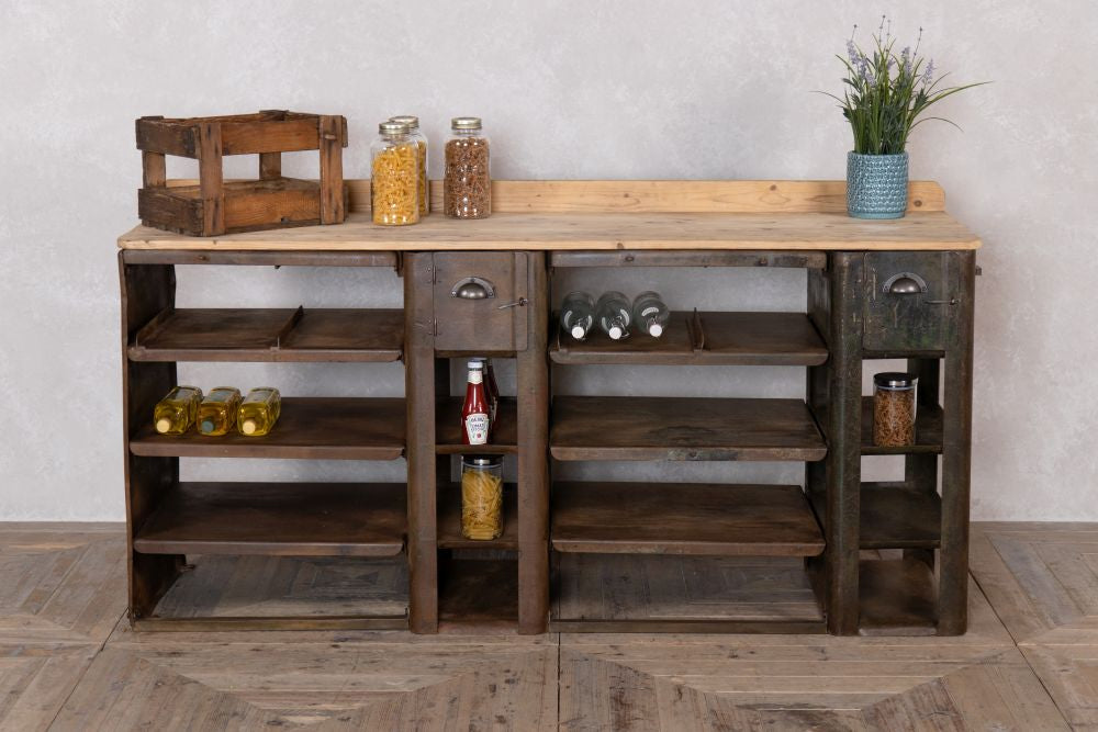 The Industrial Kitchen Sideboard Work Station Island has tons of industrial character, including the rustic brown paintwork, the natural wooden work surface and the eight shelves and two unique drawers for easy storage.