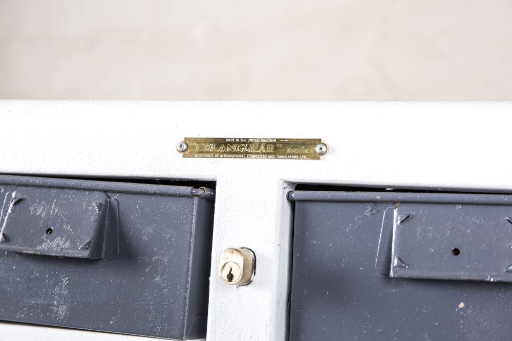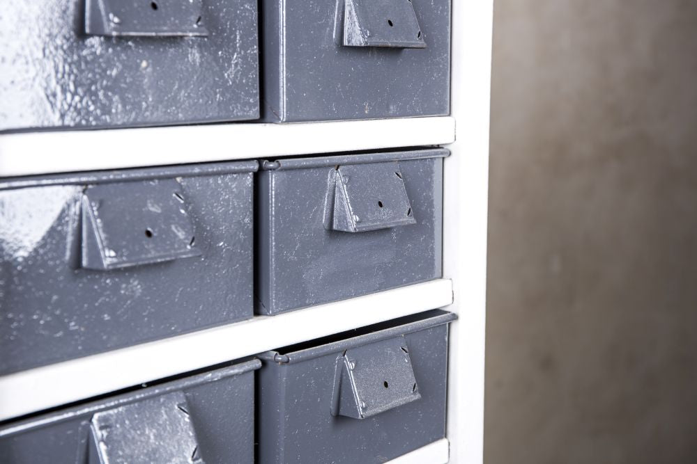The grey and white paint keep the bank of drawers looking fresh and the colours keep to the typical style of the industrial era. There are drawers aplenty here, which can hold a whole host of different items, making it a great choice for commercial businesses.