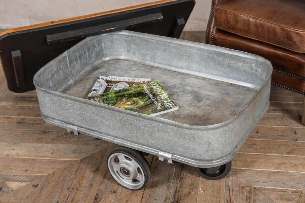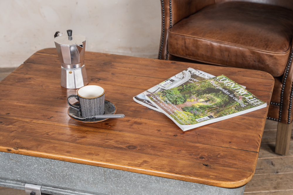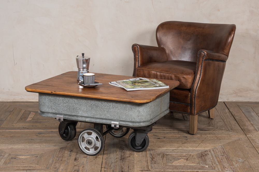 Add the unusual to your interior with this Industrial Coffee Table with Storage. Upcycled from an old trolley cart, this coffee table has a metal base, sits on wheels and has a thick wooden top which lifts off for extra storage, the perfect industrial piece for your living room, snug or conservatory. The eye-catching coffee table is of ample size, adding a statement feature to your interior.