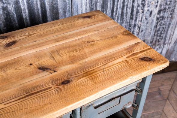 The drawers have a lovely grey/blue paint colour, which is aged in some places with spots of rust and signs of general wear. These slight imperfections are what give this item its truly unique character.