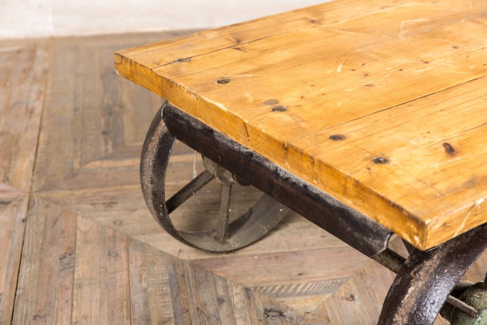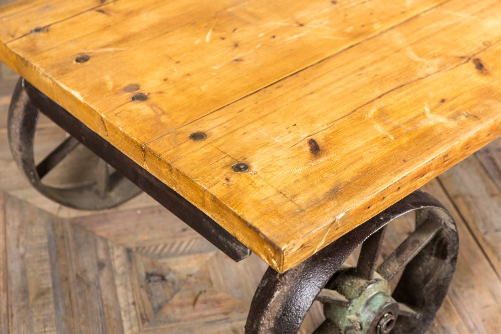 Featuring four beautiful, large cast iron wheels and a wooden top, this industrial style coffee table will make a unique centrepiece.