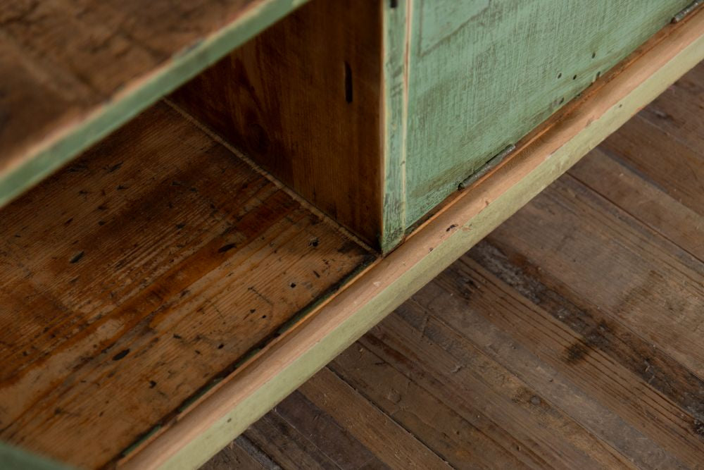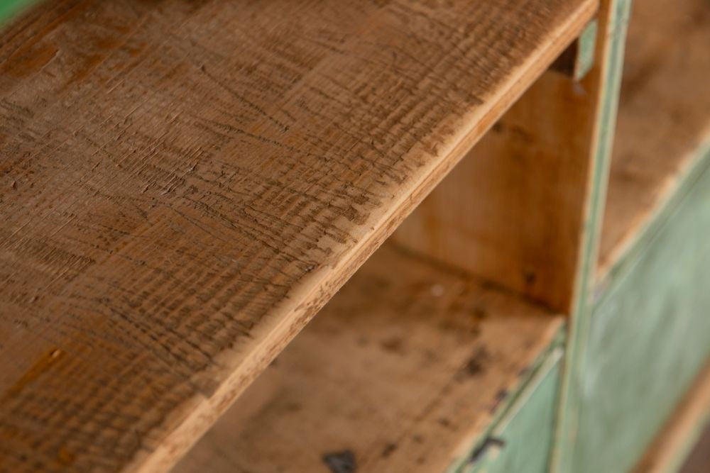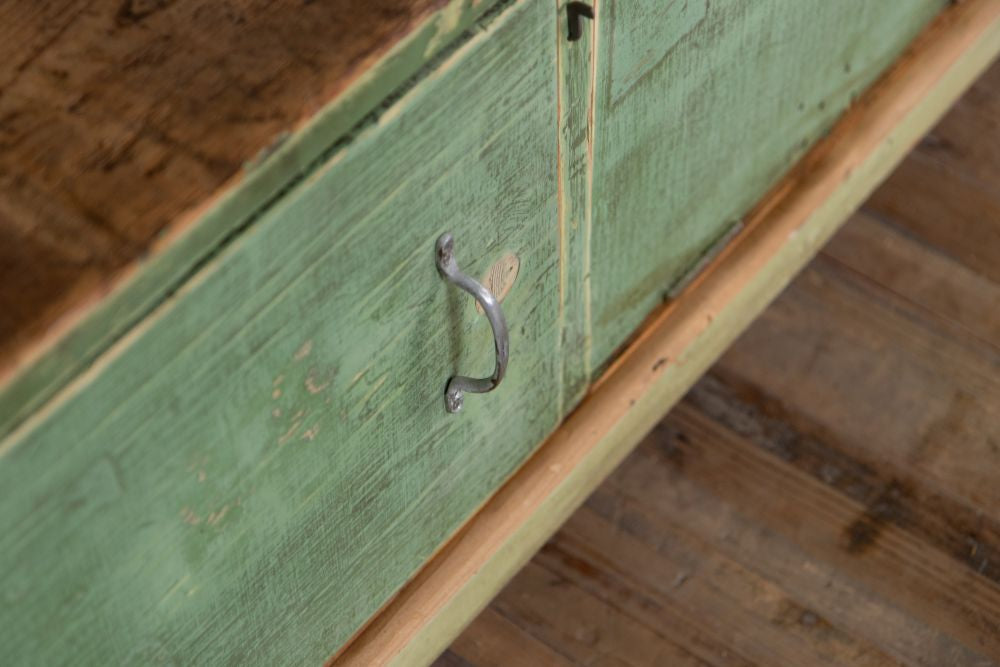 Invite an industrial farmhouse flair to your space with the Industrial Style Kitchen Console Sideboard. Featuring original distressed green paintwork, three drawers and cupboards, and six spacious shelves, this sideboard would make a quirky storage solution in any kitchen or pantry.