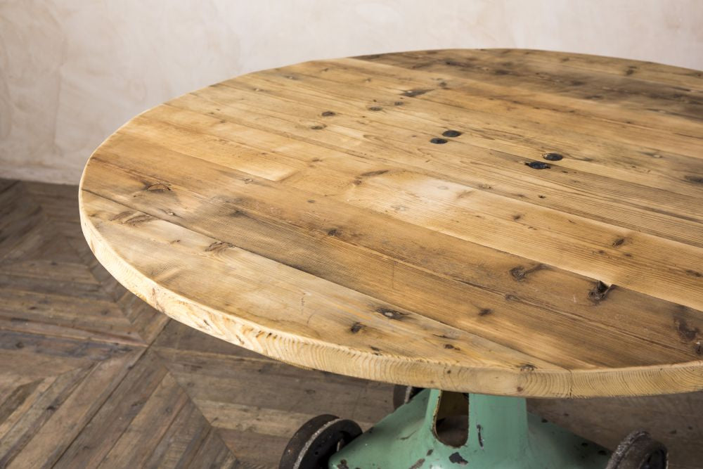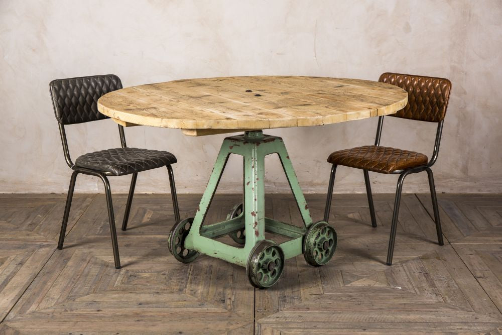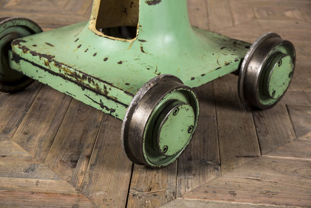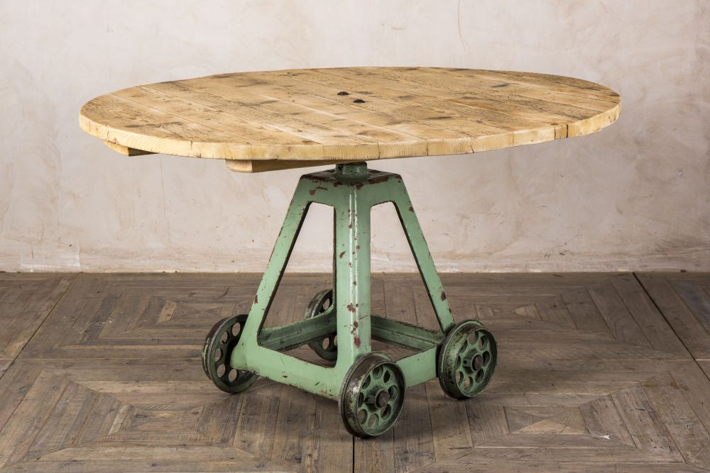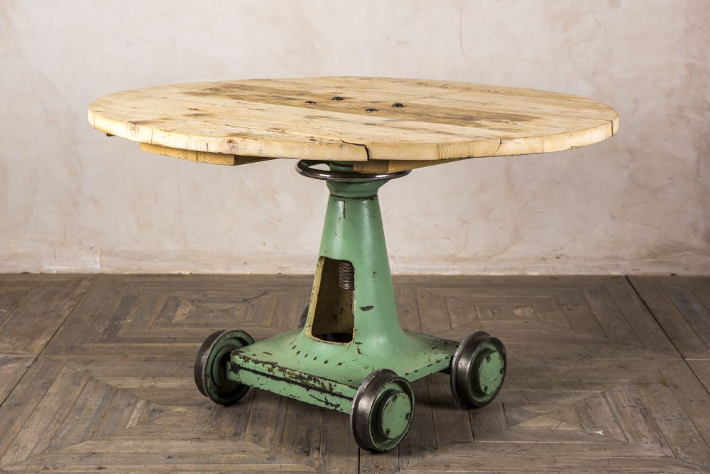 The trolley tables are made from repurposed factory trollies with wheels. Each base differs slightly but all are painted green; the bases have acquired a distressed finish over the years which adds to their industrial character.