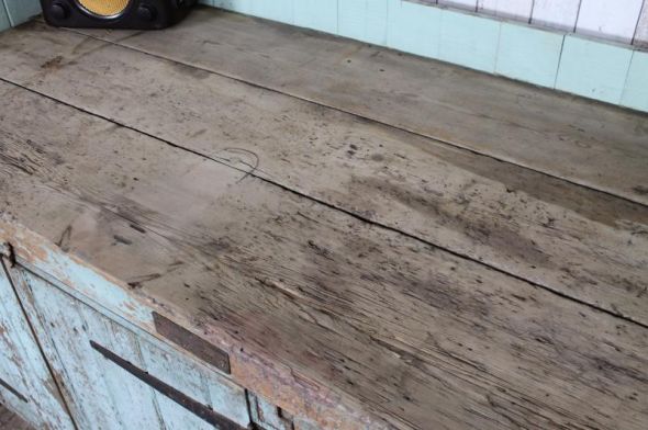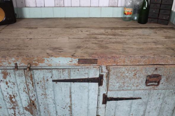 This industrial workbench is a large and impressive piece of vintage industrial furniture. This superb work bench in a shabby chic style features cupboards and doors, and a large and thick chunky top. The top is in a natural pine finish and it can easily be waxed or oiled by yourself to match your interior. A real focal point for any large country kitchen or to make a real statement in any bistro or restaurant. An extremely useful piece of furniture. Please check access as this is a large piece of furniture and it is extremely heavy.